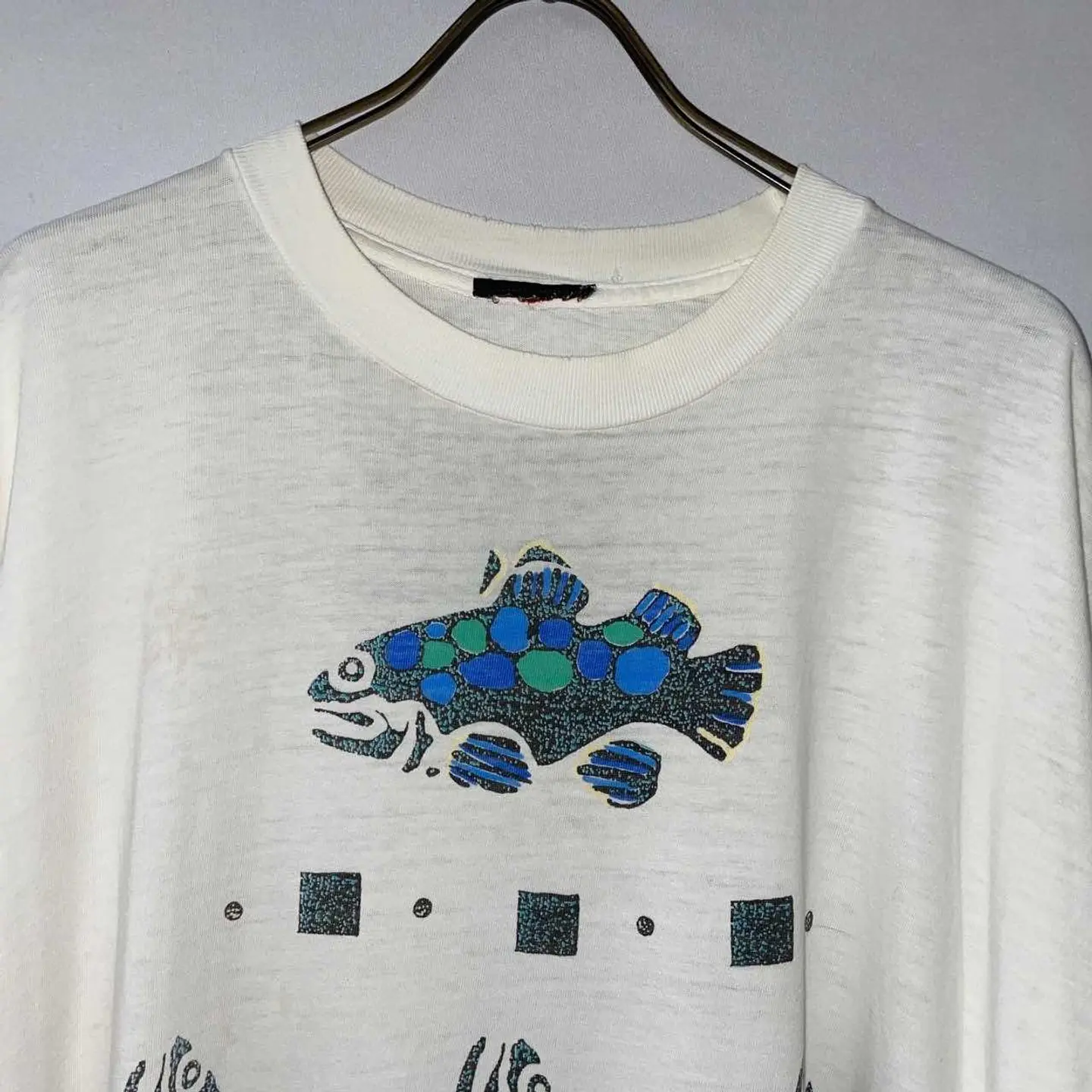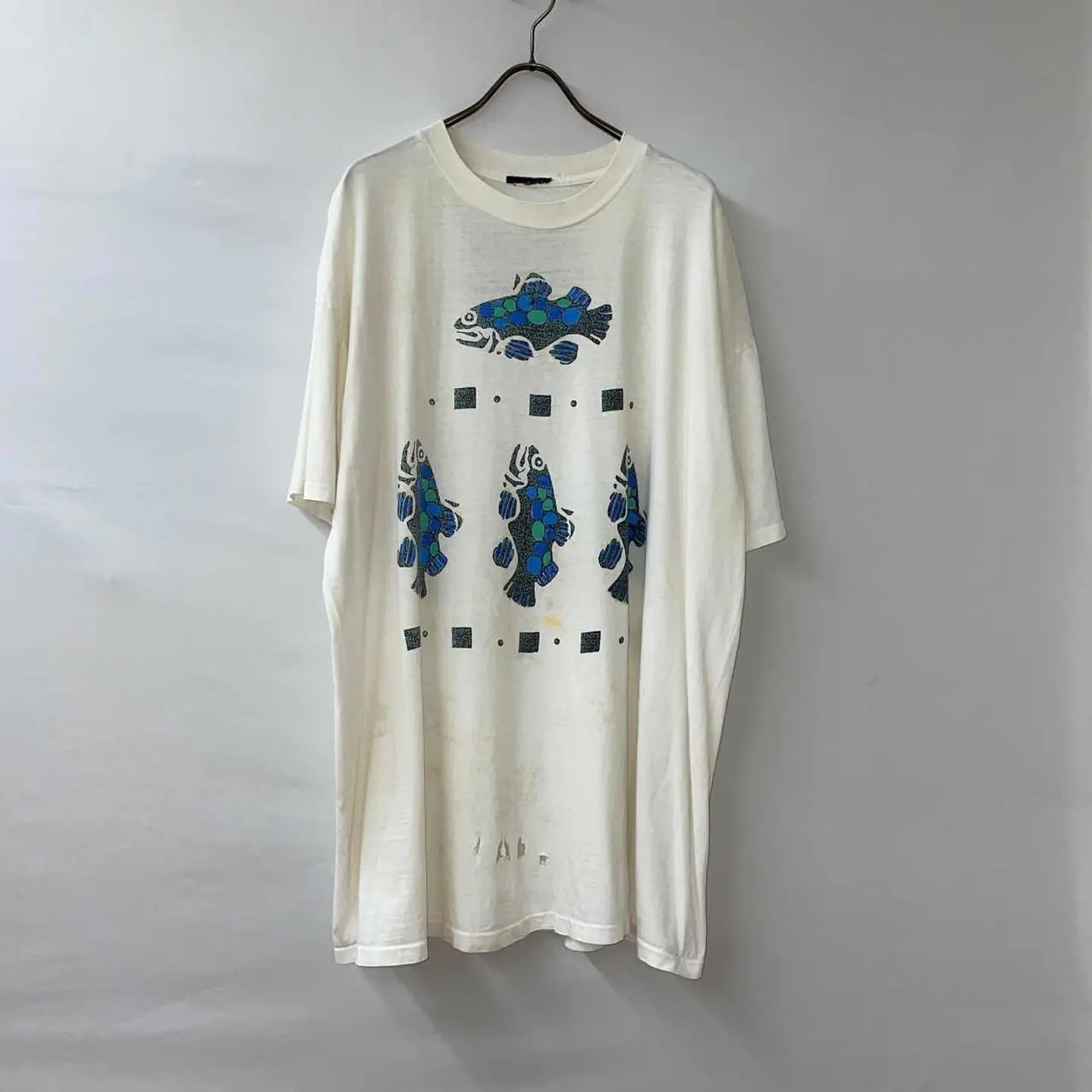 【おそらくUSA製】80s native fish pattern Tee シングルステッチ Tシャツ 白T プリント