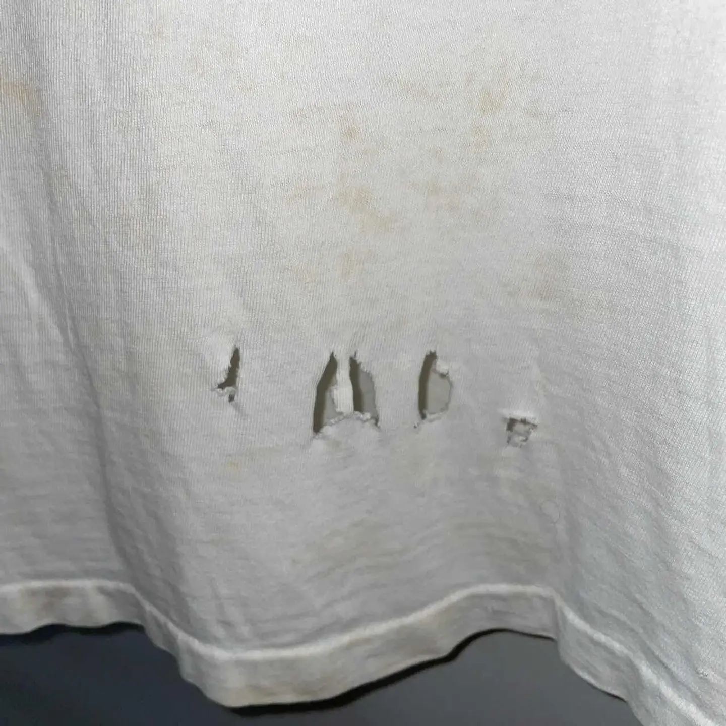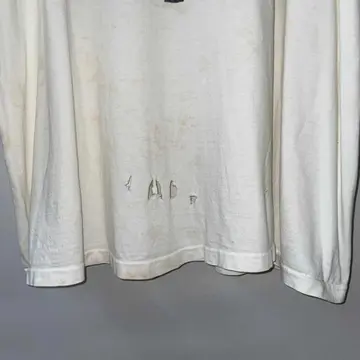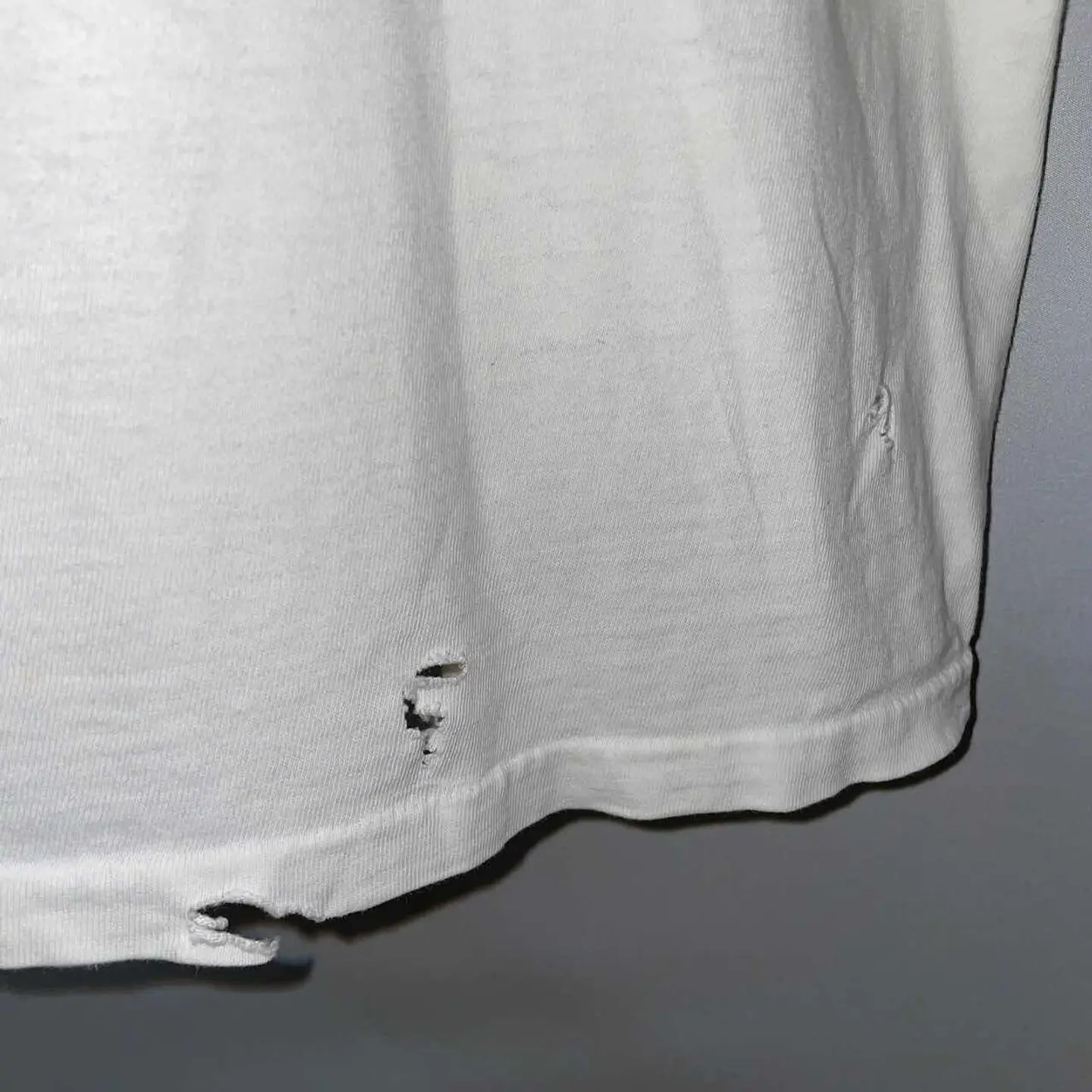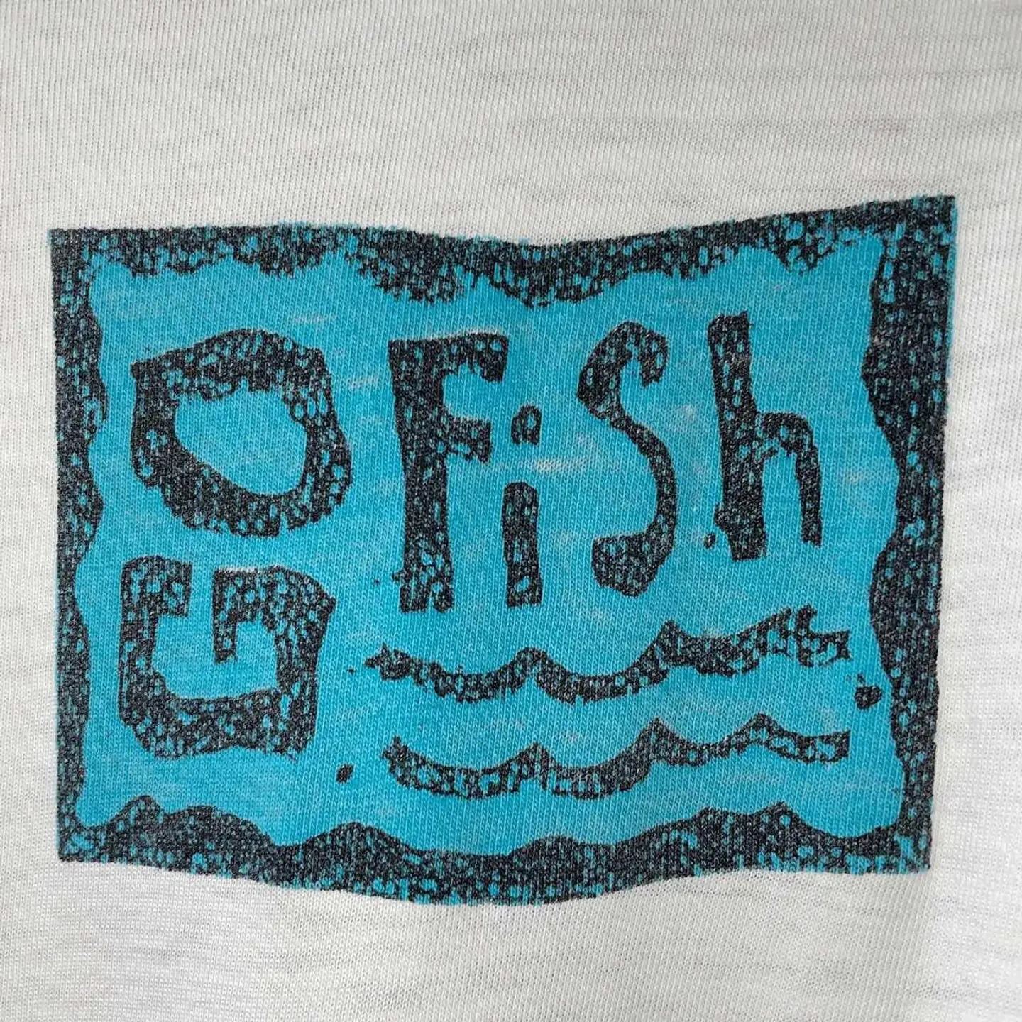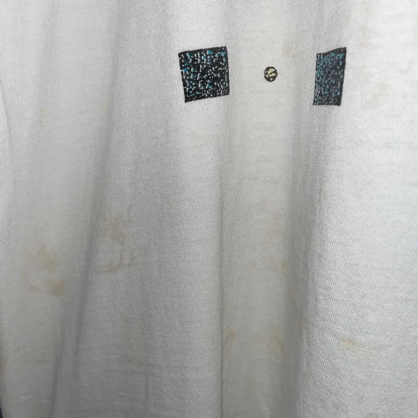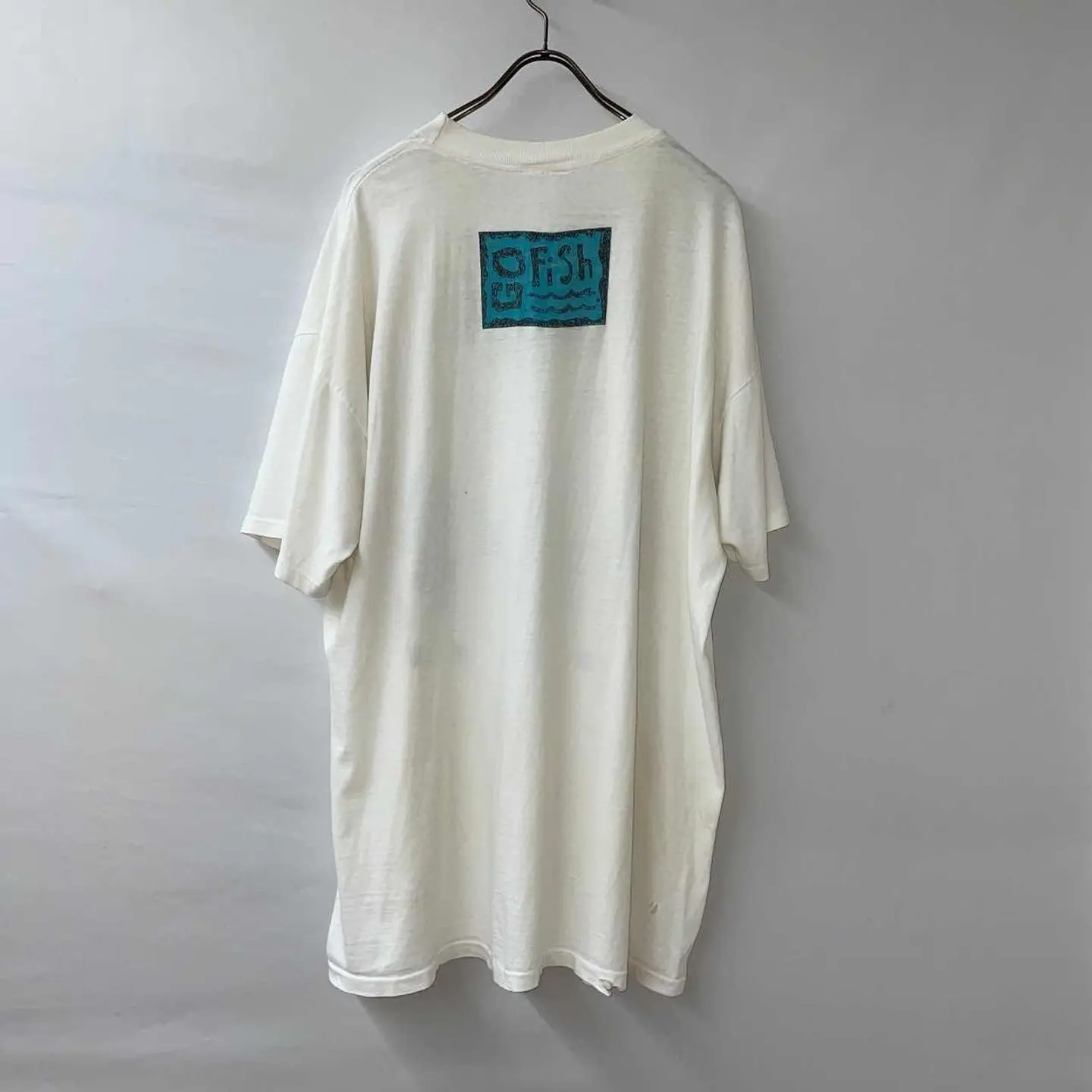 プリントにはネイティブアメリカンのアートスタイルを思わせる、幾何学的かつシンボリックな魚のモチーフが配置されています。 ブルーとグリーンの配色により、水や自然、生命力を象徴するような雰囲気が漂い、見る者に静かで神秘的な印象を与えます。 上部には1匹、下部には整列するように3匹の魚が描かれており、背面には「Fish」と波模様をかたどったサインロゴ入り。 全体的にプリミティブで抽象的なデザインが、アートピースのような存在感を放つ一枚です。 ナチュラルなボディカラーと相まって、エスニックやフォークロアな着こなしとも相性抜群。 そしておそらく、アメリカにあるGO FISH co.ltdという会社のTシャツかと思います。 【サイズ表記】 記載なし(実寸XL〜XXL相当) 【サイズ(cm)】 肩幅:63 袖丈:21 裄丈:43 袖口(平置):23 腕周(平置):24 着丈:80 身幅:64 ▶︎ 目安:175〜185cm前後の方におすすめ。 ゆったり着たい170cm台の方にも◎ 【素材・カラー・生産国】 素材:表記なし(おそらくcotton系) カラー:白 生産国:不明 【ブランド】 タグなし(詳細不明) 【コンディション】D 【コンディションランク】 S:新品・デッドストック A:使用感少なめでキレイ B:使用感あり(軽微な汚れ・シミあり) C:ややダメージあり D:大きなダメージあり ※フロント下部や裾まわりにシミや変色あり。着用には支障ありませんが、ヴィンテージ特有の風合いとしてご理解ください。 【スタイリング提案】 ・生成りのペインターパンツや軍パンと合わせてラフに ・インナーにロンTを仕込んでアート系レイヤードにも◎ 【ご注意】 ・古着商品のため、細かなキズや汚れがある場合があります ・一点物となりますので、気になる方はお早めにご購入ください ・ご利用のモニター環境により、色味が異なる場合があります#vintage #古着 #90s