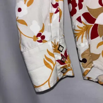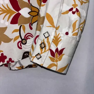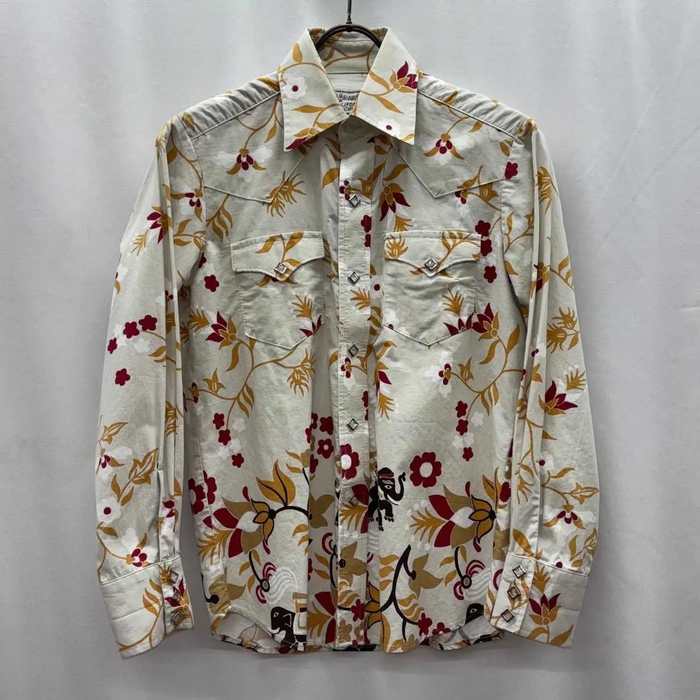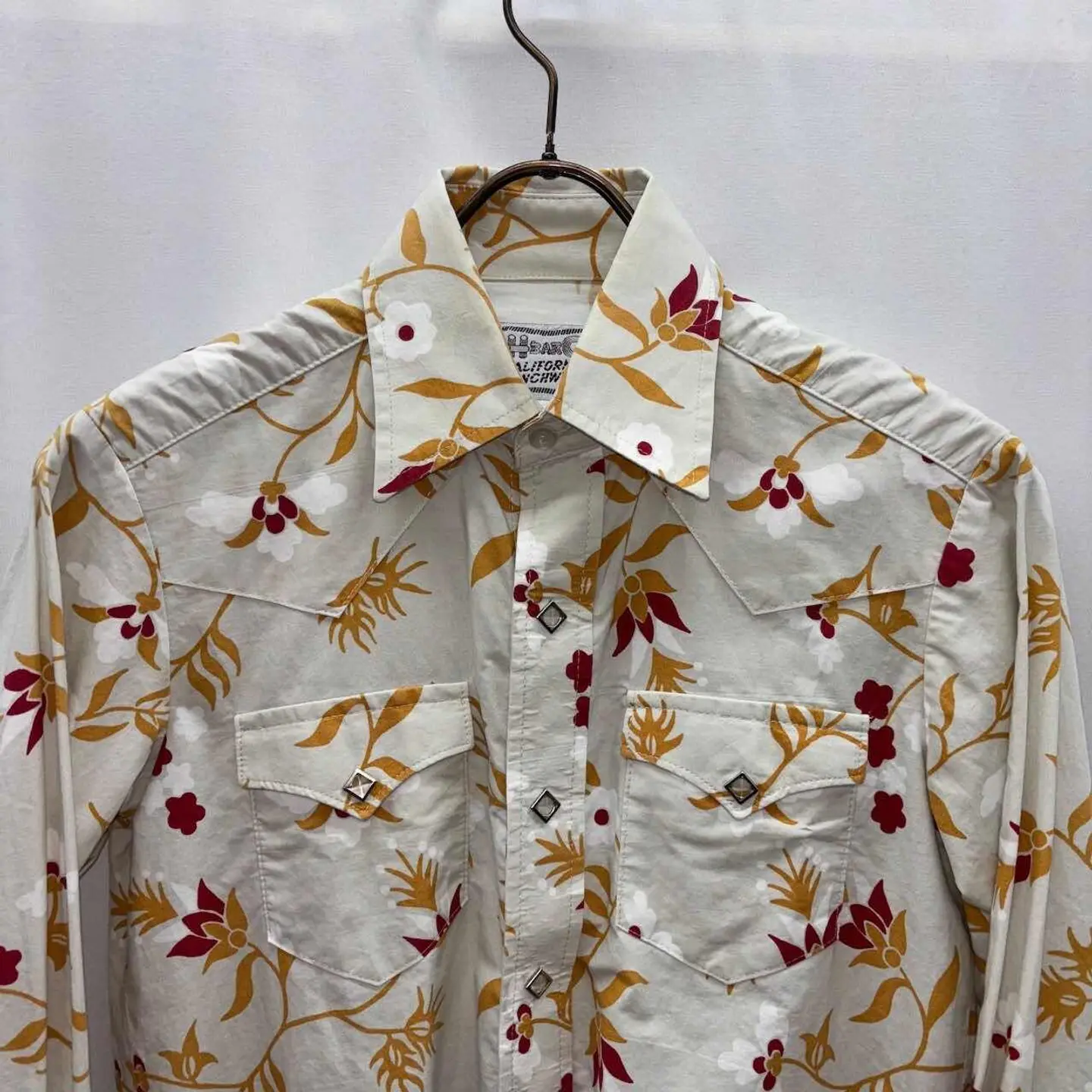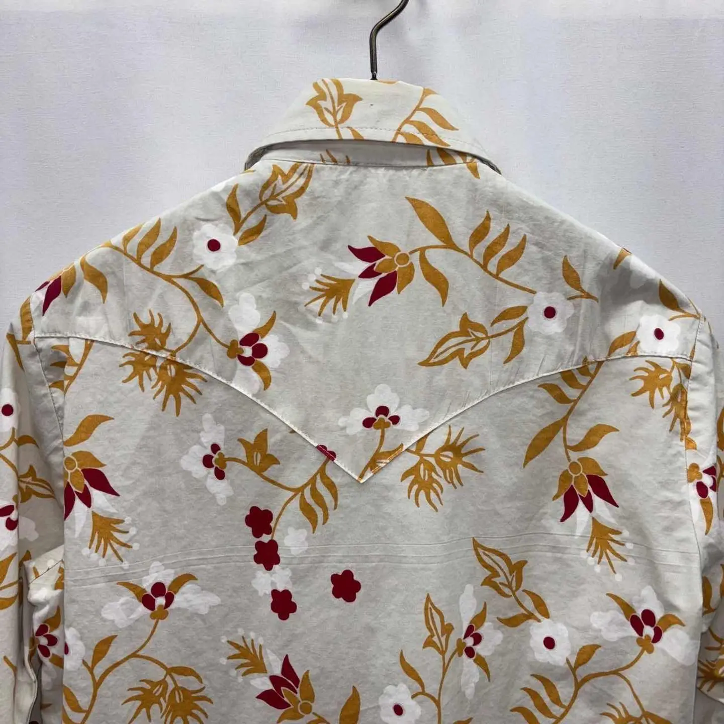 レトロ感満載のグラフィックが目を引く、H Bar C のウエスタンシャツ。 プリントには象やラッパ、植物などがリズミカルに描かれ、どこか民族的かつ祝祭的な雰囲気を漂わせます。 アメリカ西海岸の開放的な空気と、70年代のヒッピーカルチャーに通じる自由なスピリットを感じさせる1枚。 スナップボタンやヨークの切り替えなど、ディテールはしっかりウエスタンシャツ仕様。 アートピースとしての存在感を放つ、古着ならではの個性派アイテムです。 サイズ(表記:S) 肩幅:40cm 袖丈:52cm 身幅:41cm 着丈:62cm ▶︎ 目安:150〜160cm前後の方におすすめ。 小柄な男性や、コンパクトに着たい女性にも◎ 【素材・カラー・生産国】 素材:コットン100% カラー:オフホワイトベース×マスタード×レッド 生産国:USA製 ブランド:H Bar C コンディション【A】 【コンディションランク】 S:新品・デッドストック A:使用感少なめでキレイ B:使用感あり(軽微な汚れ・シミあり) C:ややダメージあり D:大きなダメージあり スタイリング提案 ・タックインしてフレアデニムと70sライクに ・チノパンやオーバーオールと合わせてカジュアルダウン ご注意 ・古着商品のため、細かなキズや汚れがある場合があります ・一点物となりますので、気になる方はお早めにご購入ください ・ご利用のモニター環境により、色味が異なる場合があります#vintage #古着 #90s