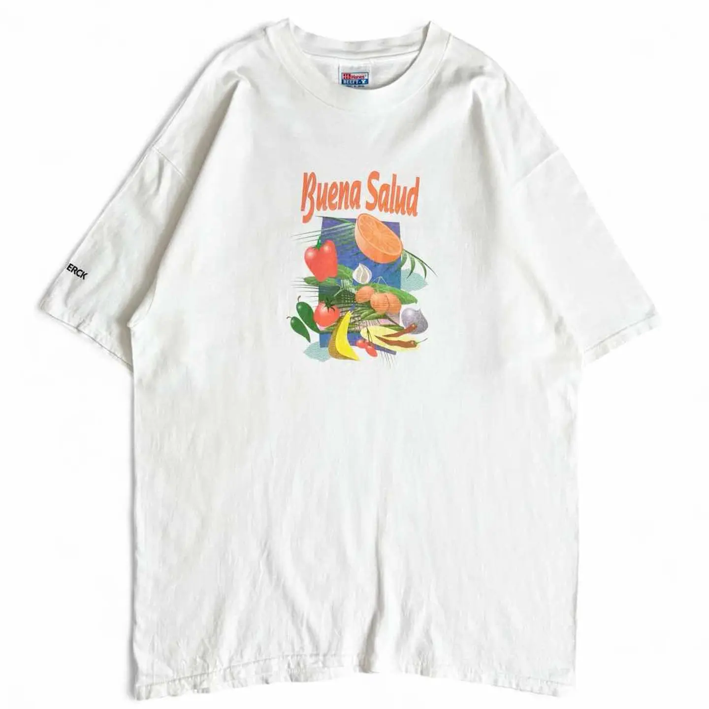 ○商品説明 USA製 Hanes MERCK ドイツに本社を置く製薬・化学品メーカーになります。 世界的に有名な製薬会社であり、ライフサイエンス、 ヘルスケア、エレクトロニクス分野で事業を展開しています。 果物や野菜がデザインされており◎ 是非。 ○サイズ 表記XL 平置き ・肩幅57cm ・身幅58cm ・袖丈25.5cm ・着丈78cm ○商品の状態B A:使用感がほとんどなく、汚れやシミもなし B:多少使用感はあるが、汚れやシミも少ない C:使用感があり、汚れやシミがある D:使用感があり、大きな汚れや破れあり ○色 ホワイト #USA製#Hanes#ヘインズ#野菜#Tシャツ