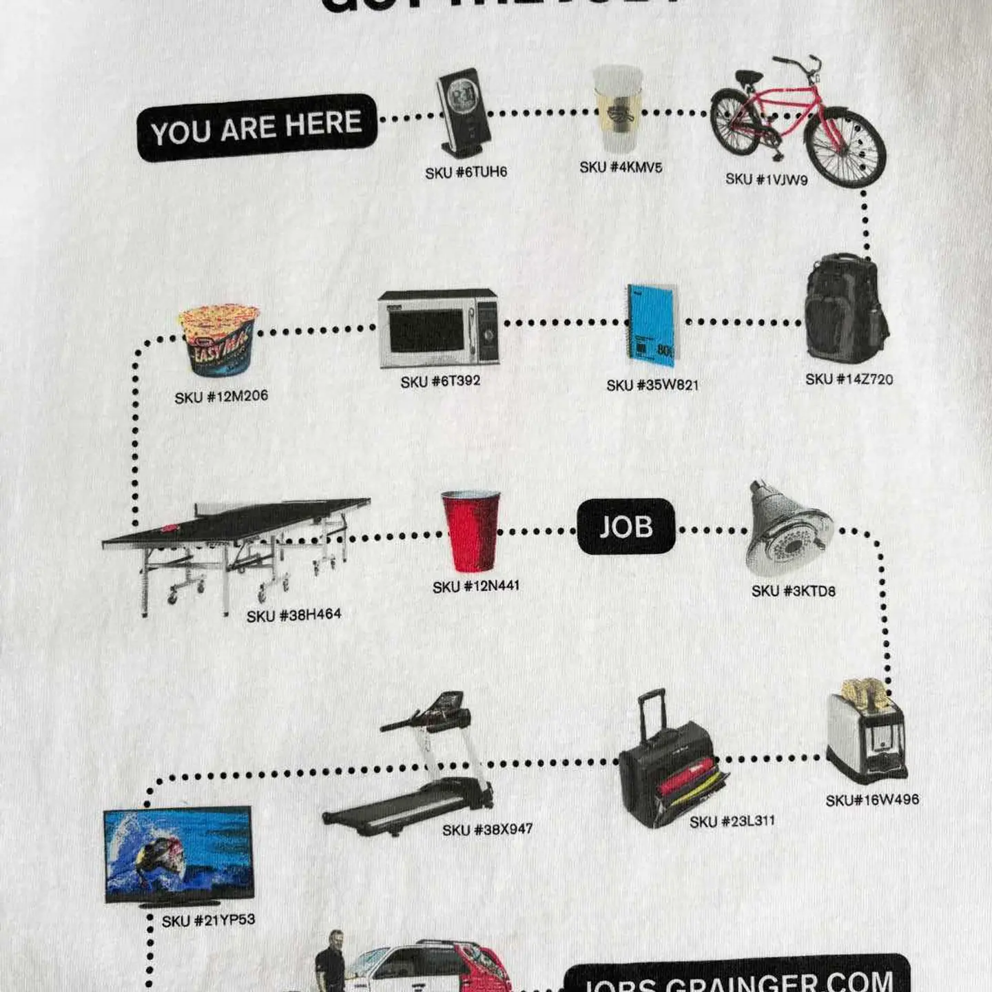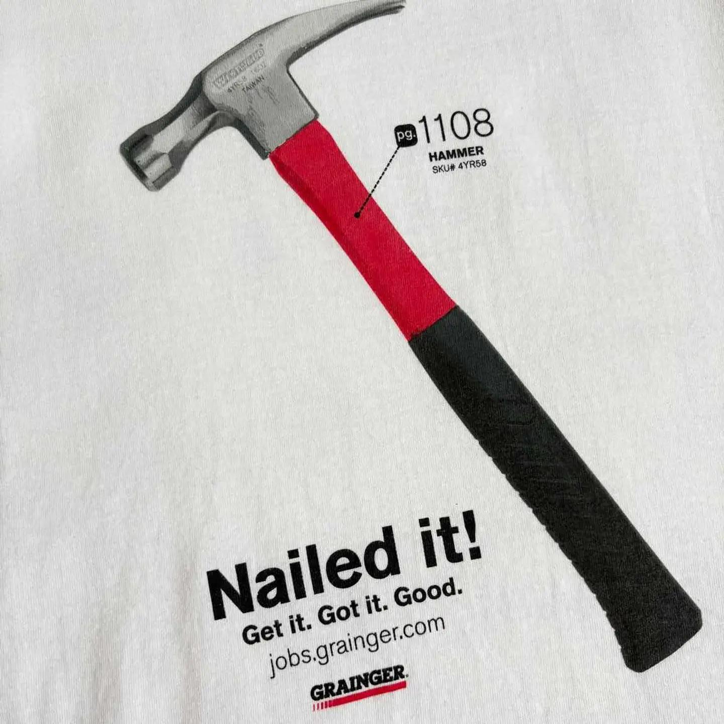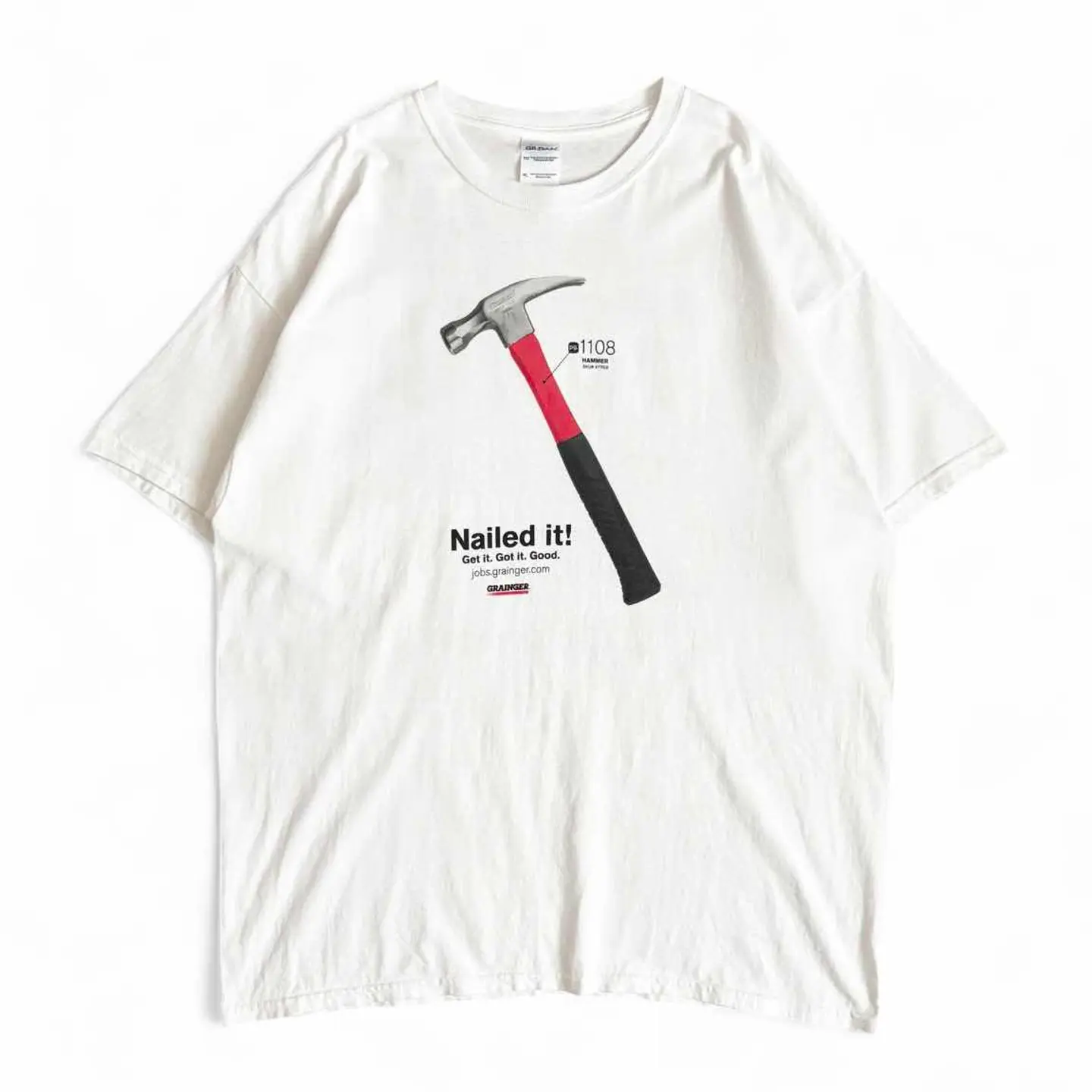 ○商品説明 GILDAN Grainger アメリカの工業用品販売大手によるリクルート プロモーションTシャツで、ビジュアルとジョークを 組み合わせたメッセージ性の強い一枚になります。 Nailed it! Get it. Got it. Good.」というフレーズは 「完璧にやり遂げた!」という意味と、ハンマーの釘を 打つ動作をかけたユーモラスな表現です。 バックには 点線でつながれた「人生の進行ルート」のような図で、 左上の「YOU ARE HERE (現在地)」から、右下の「JOBS.GRAINGER.COM」まで導かれる構成になっており ユーモア溢れるデザインになります。 是非。 ○サイズ 表記XL 平置き ・肩幅58.5cm ・身幅59cm ・袖丈19.5cm ・着丈74cm ○商品の状態B A:使用感がほとんどなく、汚れやシミもなし B:多少使用感はあるが、汚れやシミも少ない C:使用感があり、汚れやシミがある D:使用感があり、大きな汚れや破れあり ○色 ホワイト #GILDAN#ギルダン#GotTheJob#企業#Tシャツ