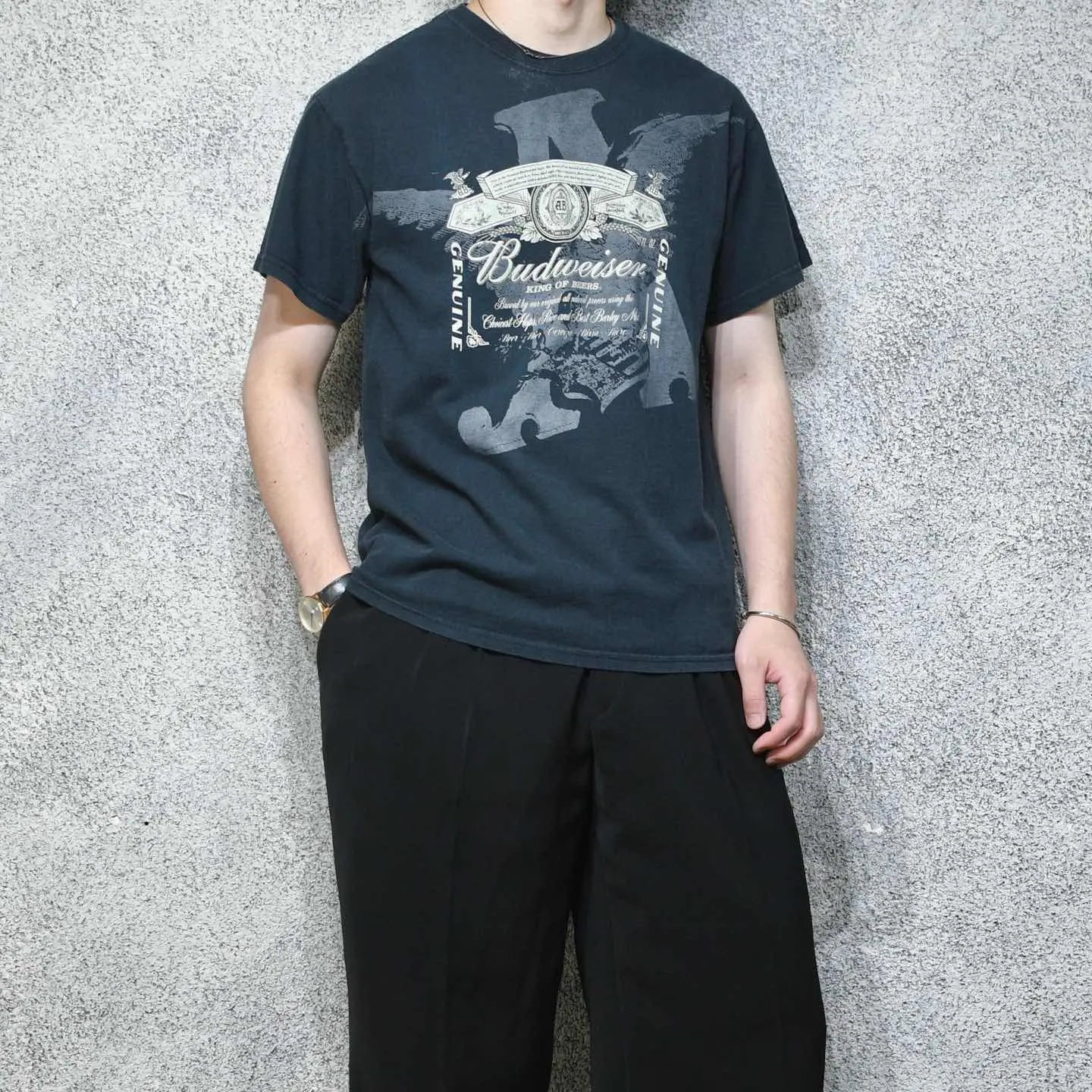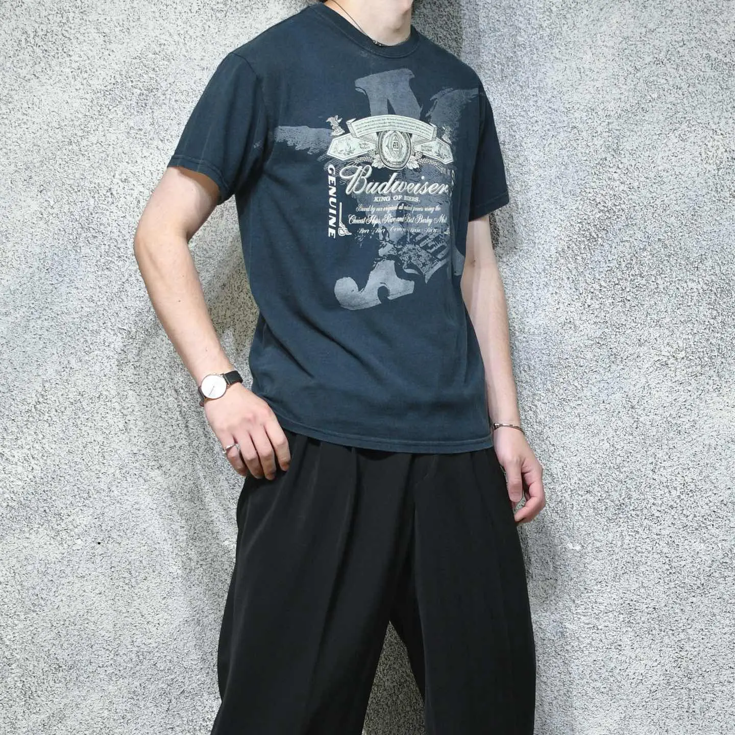 SIZE:M 着丈65cm 肩幅52cm 身幅55cm 袖丈19cm(ダブルステッチ) fabric/cotton 着用画像 177cm/64kg ビールが苦手な自分でも飲みやすいビール ” Budweiser” このブランドでこんなロゴプリントのTシャツは、 白のボディに赤のプリント。 そんな印象がありましたが、こちらは黒ボディ。 何気に初見な気がします。 人が狙わない辺りをさらっとコーデへ落とし込む、 そんなスタイリングが大好きです。 ※撮影状況により、実物と多少色が異なる場合が ございます。 ※古着を取り扱っているため、気づかない汚れや ほつれ等がある場合がございます。 予めご了承ください。 ※サイズは着用感で選んでおり、表記サイズではございません。 古着 オーバーサイズ old vintage ヴィンテージ used 80's 90's アメリカ古着 ユーロ古着 メンズ レディース POLO RALPH LAUREN Eddie Bauer OLD GAP Eddie Bauer LANDS' END ランズエンド LLBean エルエルビーン オールドギャップ エディーバウアー ラルフローレン ブルックスブラザーズ Brooks Brothers 半袖Tシャツ Tシャツ ロゴプリント バドワイザー などがお好きな方 #vintage #オーバーサイズ #old #used #90s #80s #古着 #ヴィンテージ #アメリカ古着 #ユーロ古着 #古着男子 #古着女子 #LLBean #エルエルビーン #EddieBauer #エディーバウアー #oldgap #オールドギャップ #LANDSEND #ランズエンド #NAUTICA #ノーティカ #ラルフローレン #POLORALPHLAUREN #ブルックスブラザーズ #BrooksBrothers #ロゴプリント #ロゴ #プリントTシャツ #Tシャツ #半袖Tシャツ #Budweiser #バドワイザー