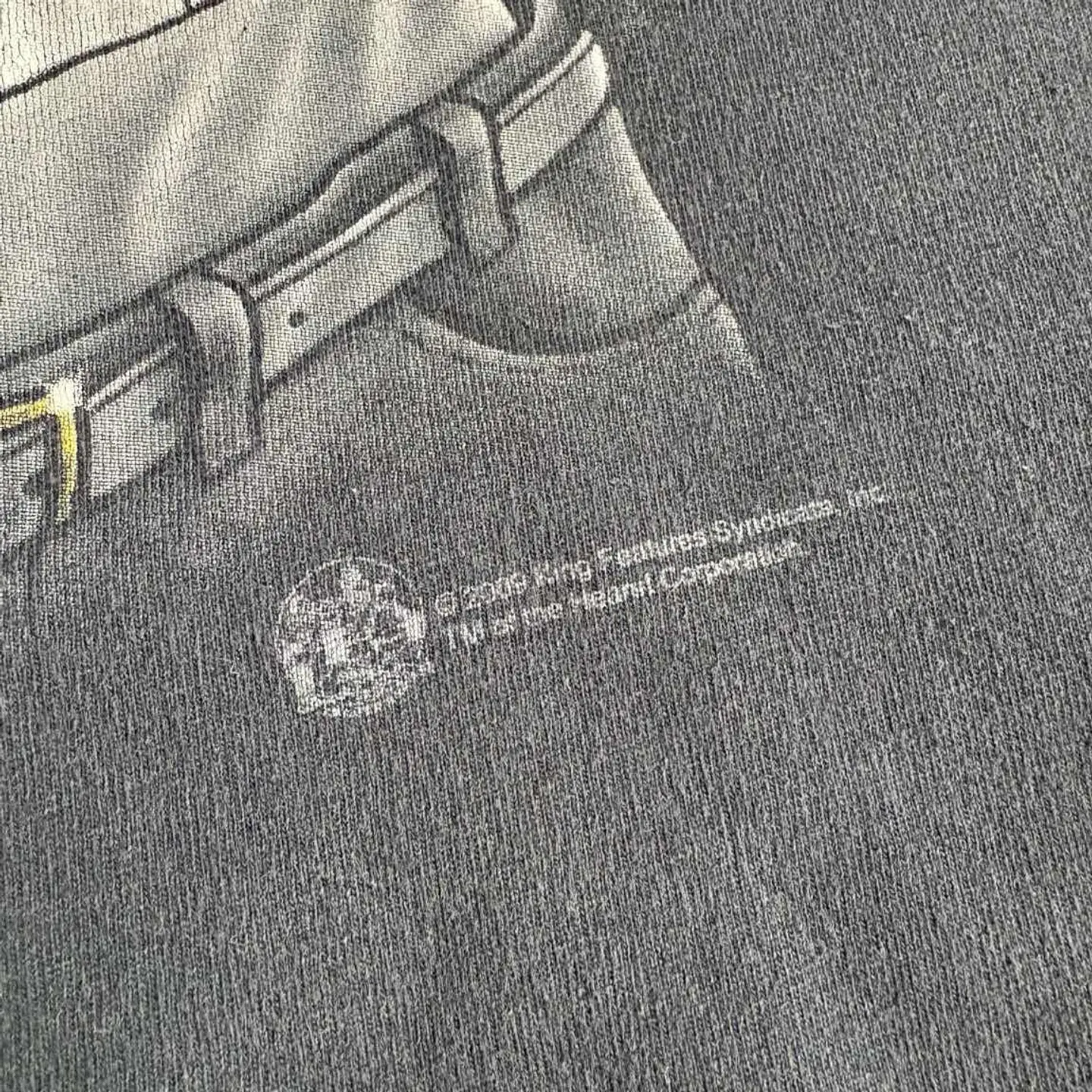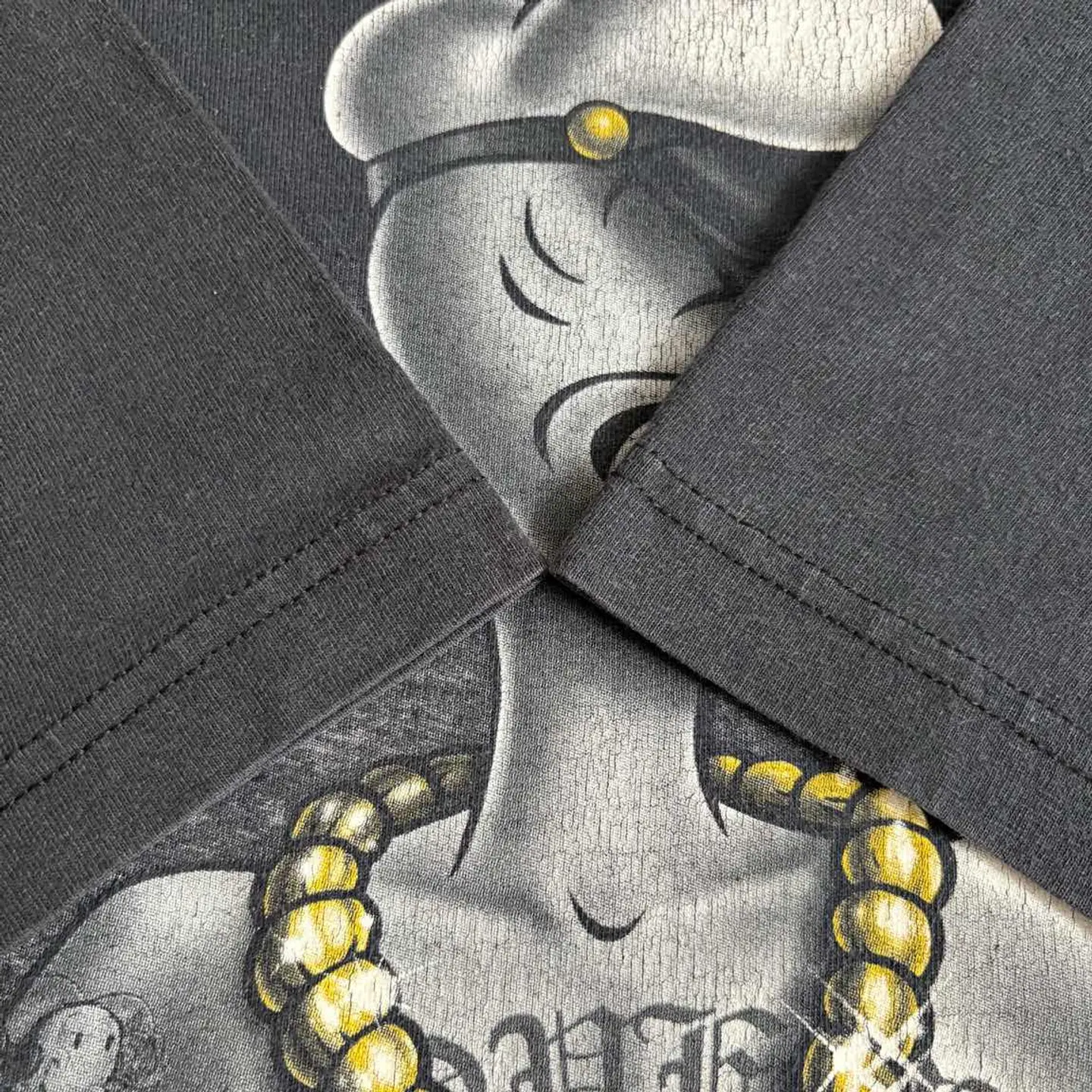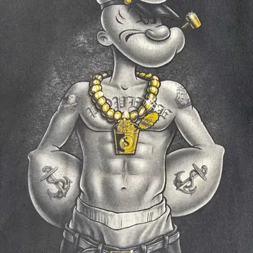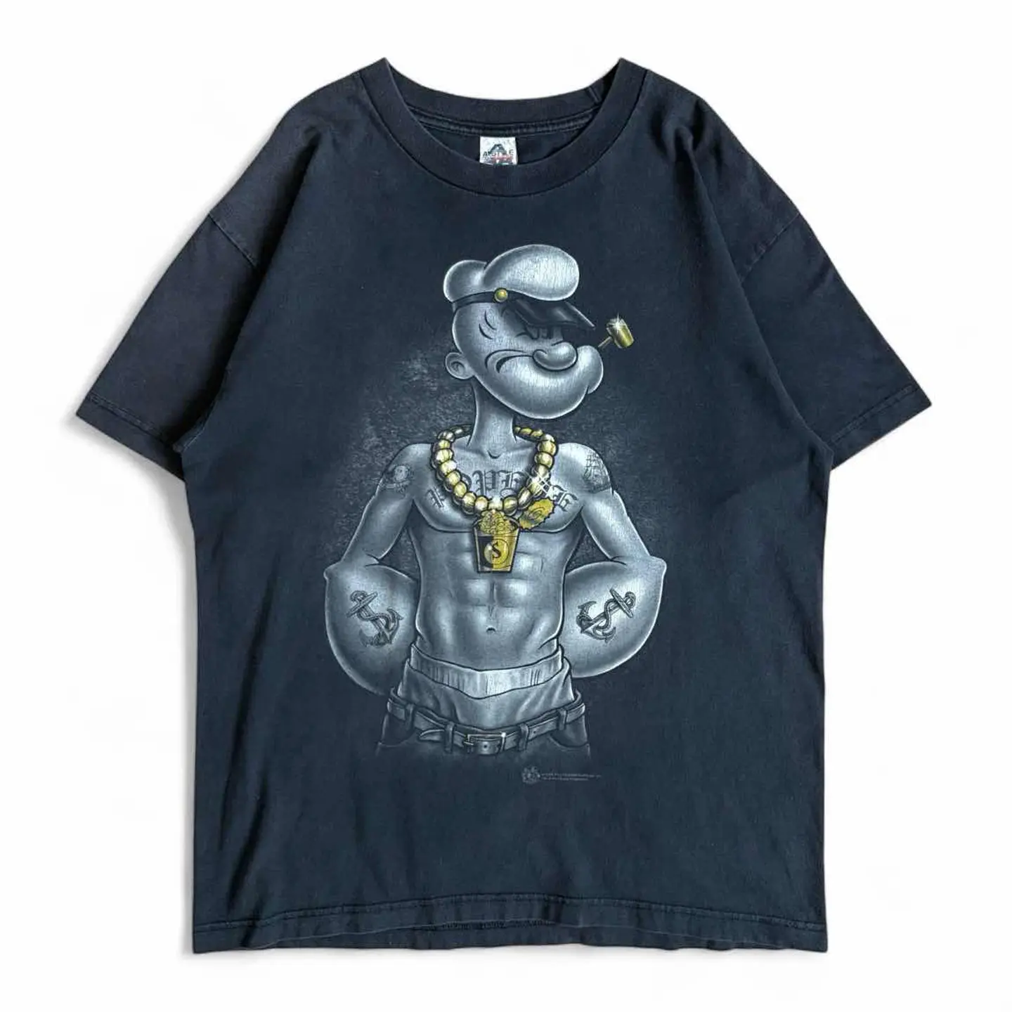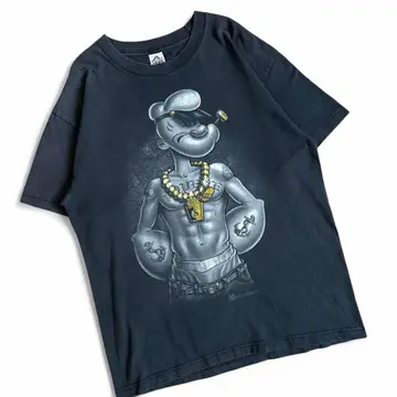 ○商品説明 ALSTYLE ギャングポパイ。 金のぶっといネックレスを付けてカッコつけてます。 上腕筋どないなってんねん笑 おもろいです。 ○サイズ 表記L 平置き ・肩幅53cm ・身幅54cm ・袖丈19cm ・着丈69cm ○商品の状態B A:使用感がほとんどなく、汚れやシミもなし B:多少使用感はあるが、汚れやシミも少ない C:使用感があり、汚れやシミがある D:使用感があり、大きな汚れや破れあり ○色 ブラック #ALSTYLE#アルスタイル#POPEYE#ポパイ#Tシャツ