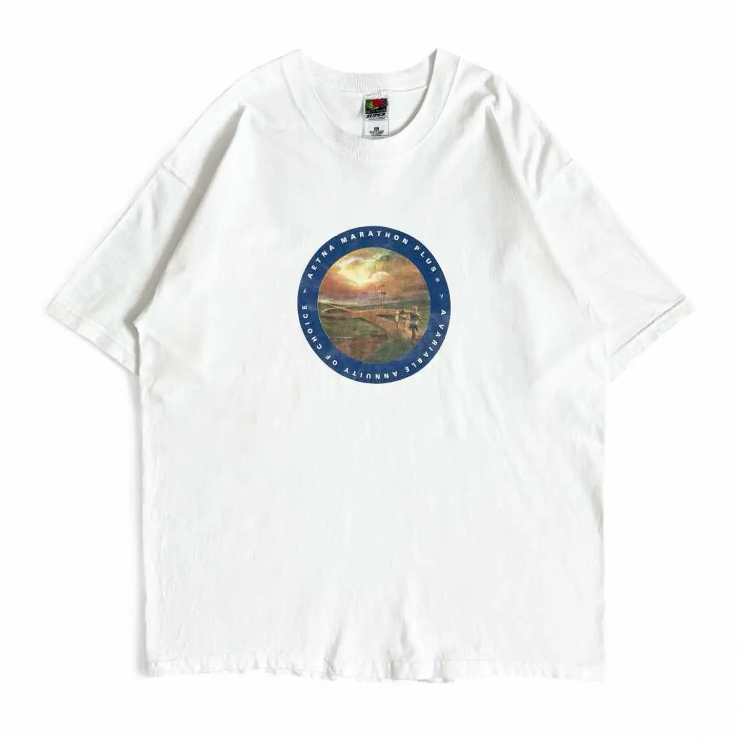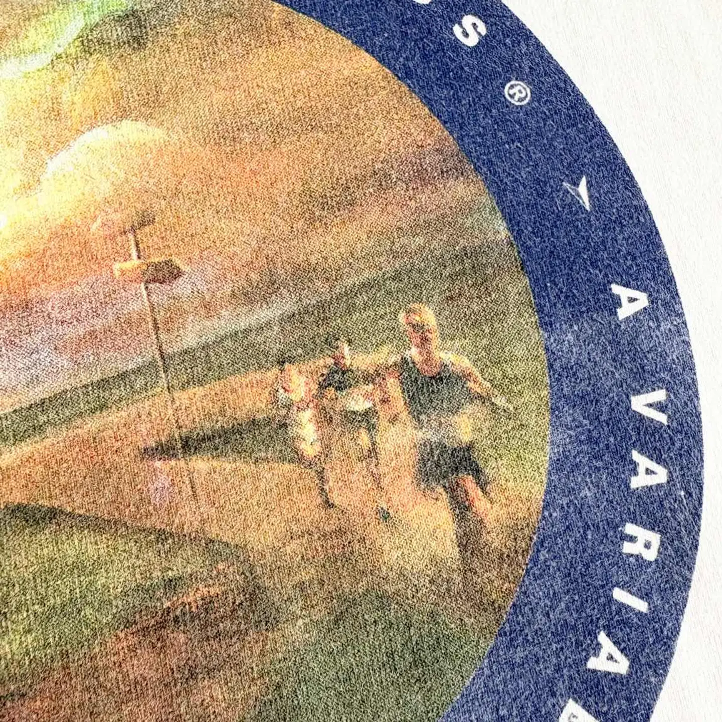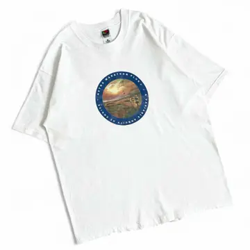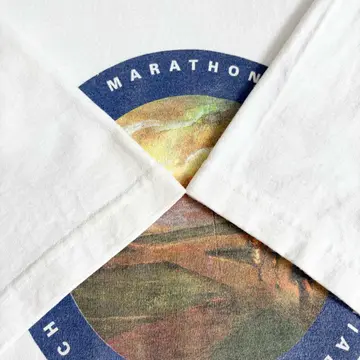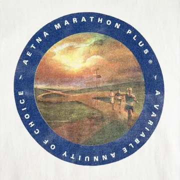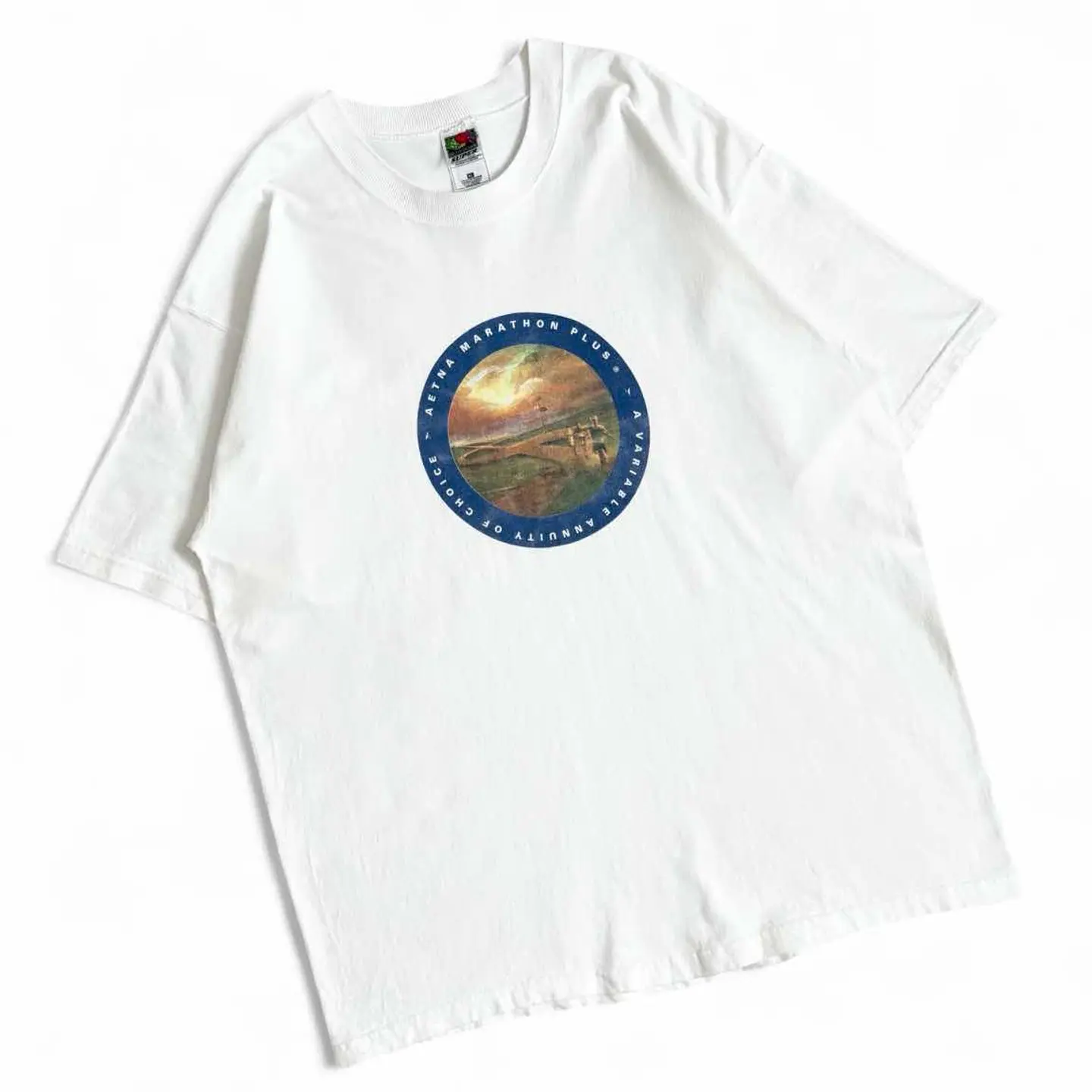 ○商品説明 FRUITOFTHELOOM 保険会社Aetnaの「Marathon Plus」 という年金商品をモチーフにしたプロモーション用 デザインかと思われます。 円形のフレームの中に夕焼けの空と草原の風景が 描かれ、その中を数名のランナーが走っている情景が デザインされています。 マラソンの持久力や継続性を年金にたとえた象徴的な 表現になっています。 洒落たデザインですね。 是非。 ○サイズ 表記XL 平置き ・肩幅56cm ・身幅60cm ・袖丈24cm ・着丈75cm ○商品の状態B A:使用感がほとんどなく、汚れやシミもなし B:多少使用感はあるが、汚れやシミも少ない C:使用感があり、汚れやシミがある D:使用感があり、大きな汚れや破れあり ○色 ホワイト #FRUITOFTHELOOM#フルーツオブザルーム#Tシャツ