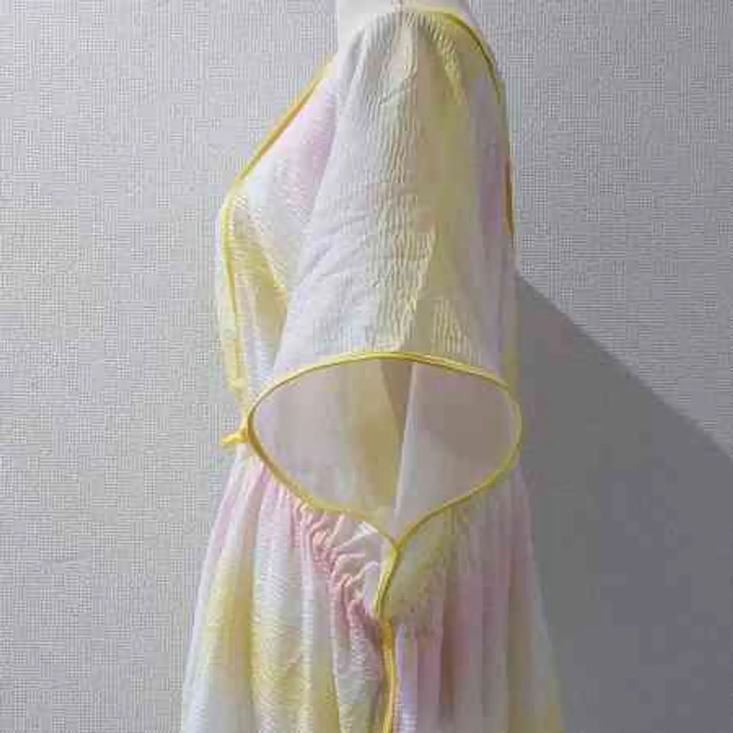 ミッソーニの中で最高級に位置するオレンジタグ。下げ札付きのデッドストックです。 “CAFTANO”というビーチウェアラインで、淡いグラデーションにフワッとしたシルエットがタウンユースにも重宝する透け感のあるチュニック。 当時の定価はデザイナーズの最高級コレクションに恥じぬ高額チュニックです。下げ札付いてるのでお手元でご確認いただければと思います。 サイズ・・・レディース 38 (身幅73cm着丈70cm肩幅85cm) ※トルソーサイズ9号 ※身幅はウエストの紐で調節できるのでほぼフリーサイズな感じかなと思います。 状態:デッドストック(新品) クリーニング済み カラー・・・ホワイト×ピンク×イエロー 素材・・・RAYON 100% MADE IN ITALY “DEAD STOCK” MISSONI MARE イタリア製 グラデーション チュニック サイズ38 CAFTANO ビーチウェア ※平置きでの採寸の為、多少の誤差が生じる場合がございます。 ※商品写真の色合いは実際の商品と若干異なる場合がございます。 ※ユーズドもしくは、ビンテージ品のため使用感や細かいキズ、汚れがある場合もございますのでご了承ください。