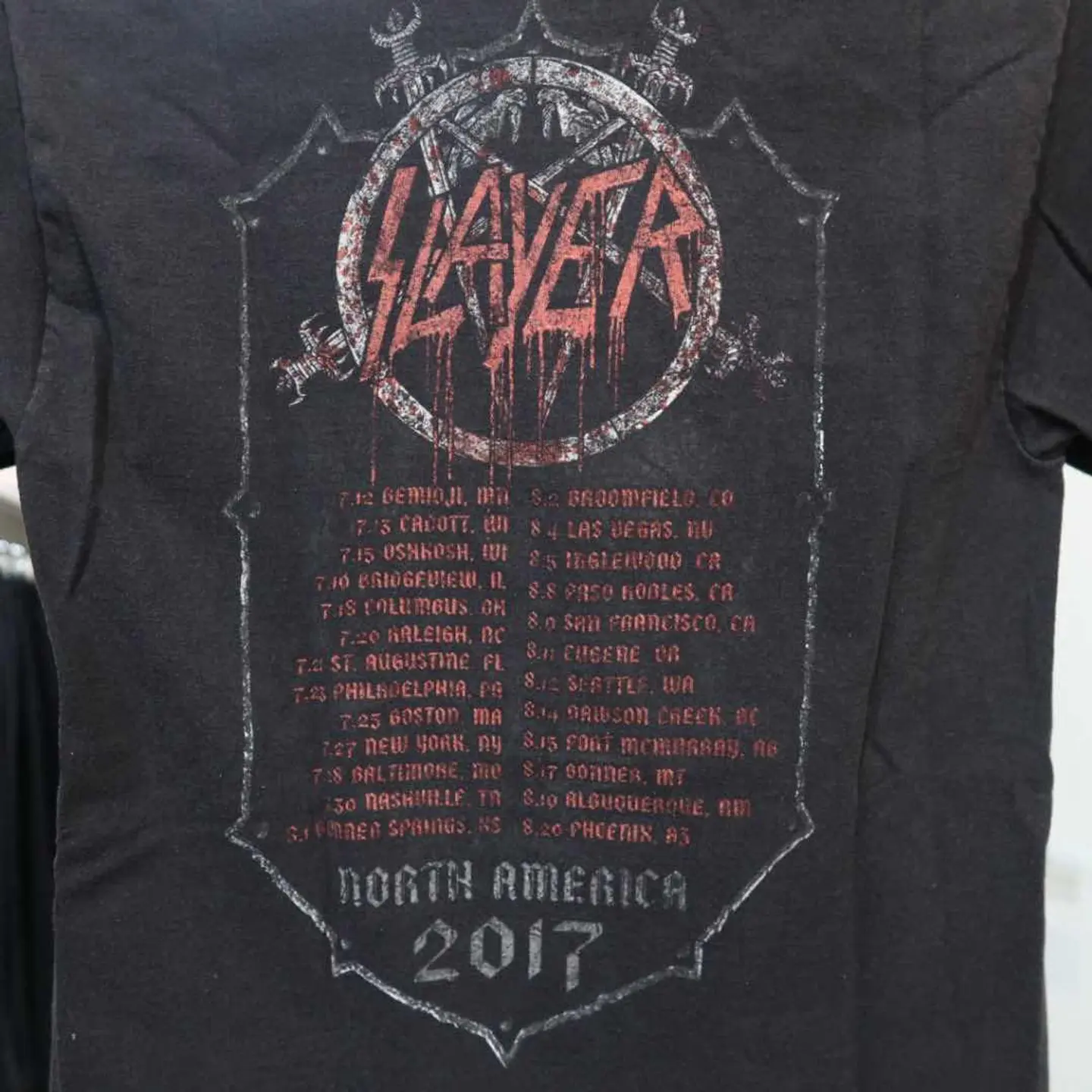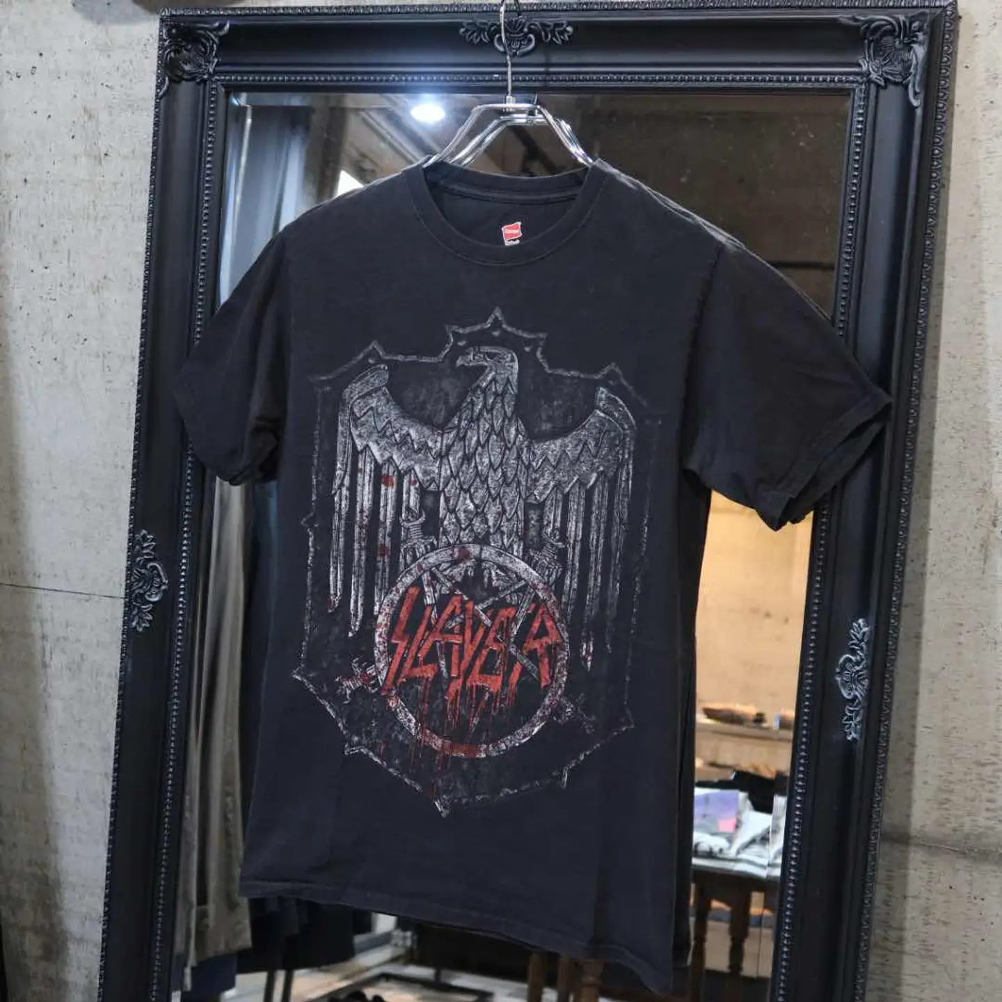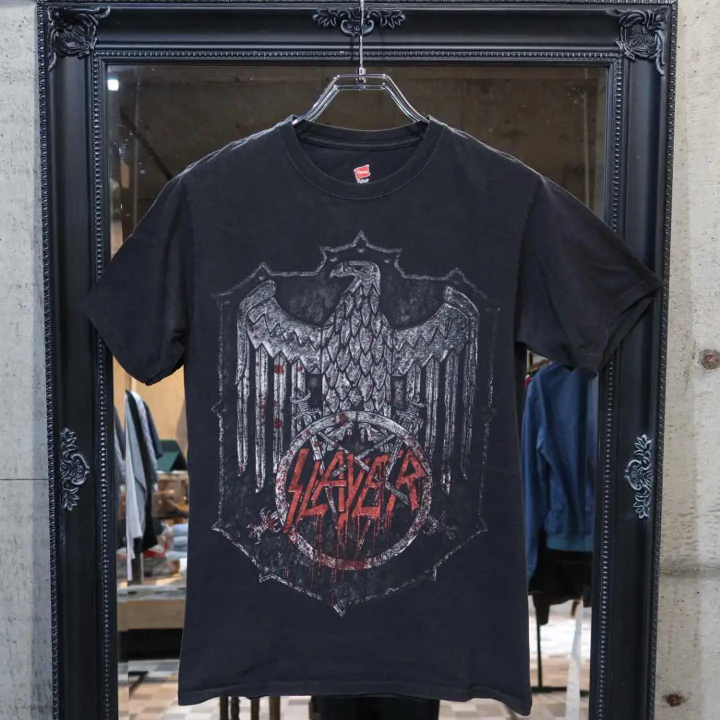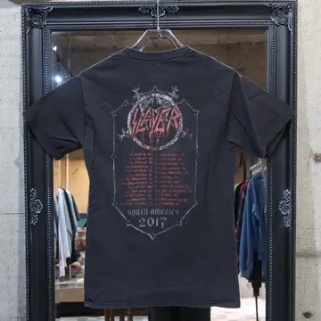 【商品名】 『SLAYER』Band T 【アイテムについて】 アメリカの伝説的なメタルバンド『スレイヤー』のバンドTシャツ。 2017年に北アメリカをツアーした際のもので、 サイズはかなりタイトで着丈長め。 女性、またはジャストサイズが好きな方男性におすすめです。 【サイズ】 肩幅 : 38 着丈 : 65 袖丈 : 19 身幅 : 44 【素材】 【コンディション】 傷や汚れはございません。 #古着 #バンドt #メタルt