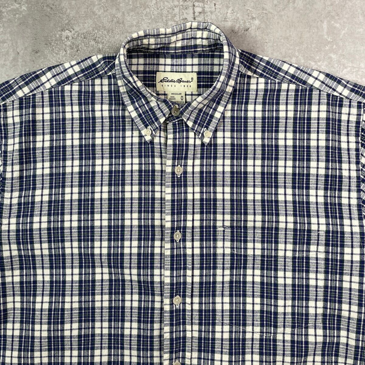 ■90年代 Eddie Bauer エディーバウアー タータンチェックシャツ メンズL相当 古着 90s ヴィンテージ VINTAGE 白タグ ボタンダウンシャツ ネイビー×ホワイト×グリーン【長袖シャツ】/マルチカラー ◎厚手で丈夫なコットン生地になります。 【ブランド】Eddie Bauer エディーバウアー 【サイズ】表記 M(実寸メンズL相当) ※計測値をご確認ください。 着丈…79.5 身幅…65 肩幅…53 袖丈…60.5 【素材】フィリピン製 【生産国】コットン100% 【状態】全体的に使用感がありますが、目立った汚れやダメージはございません。 画像にてご確認ください。 【c250827117】 ※古着は洗濯、検品などのケアを行っております。(新品・デッドストックは洗濯していません。) ※モニターの発色により実物と異なる場合がございます。予めご了承ください。 ※ 海外直輸入USED品になります。