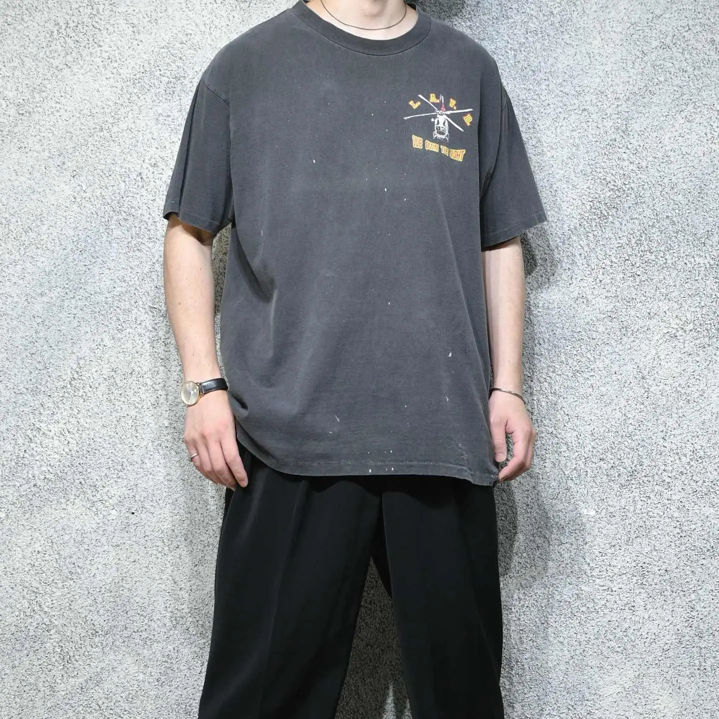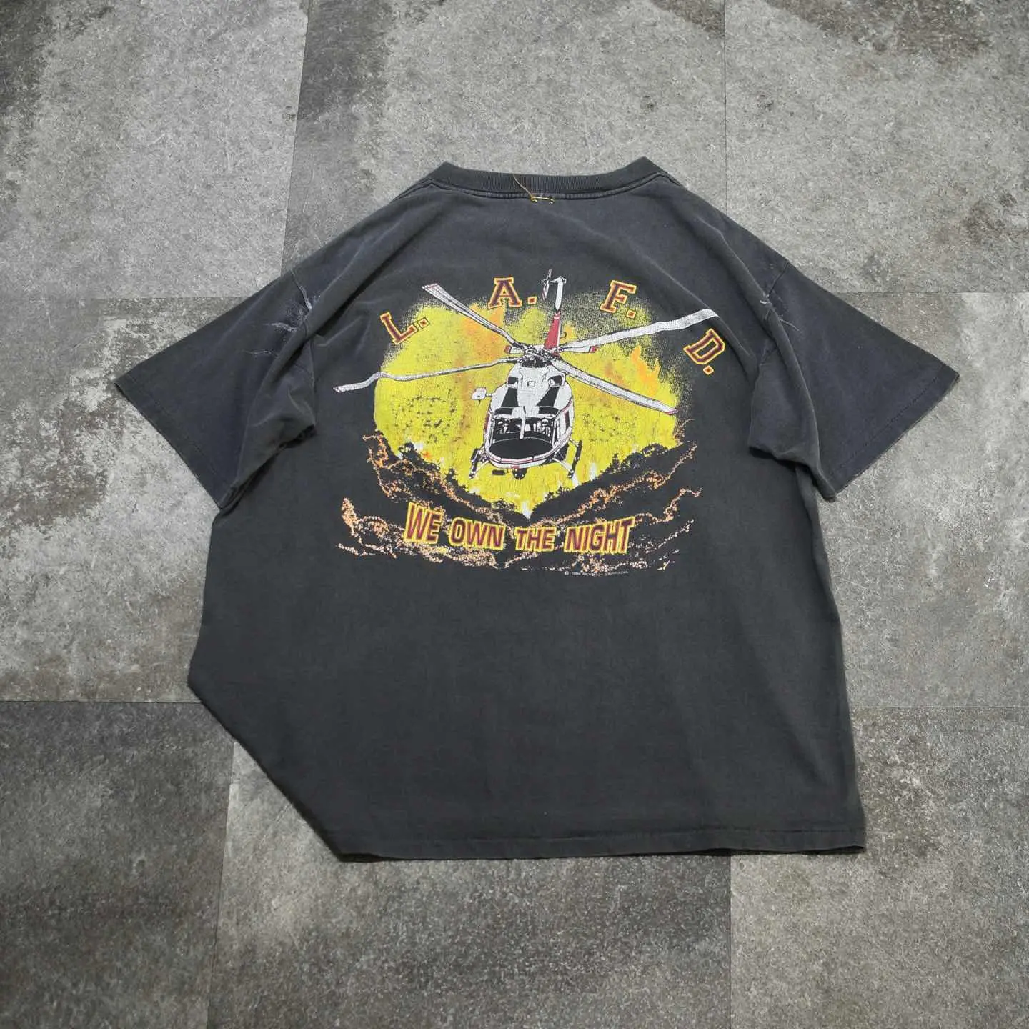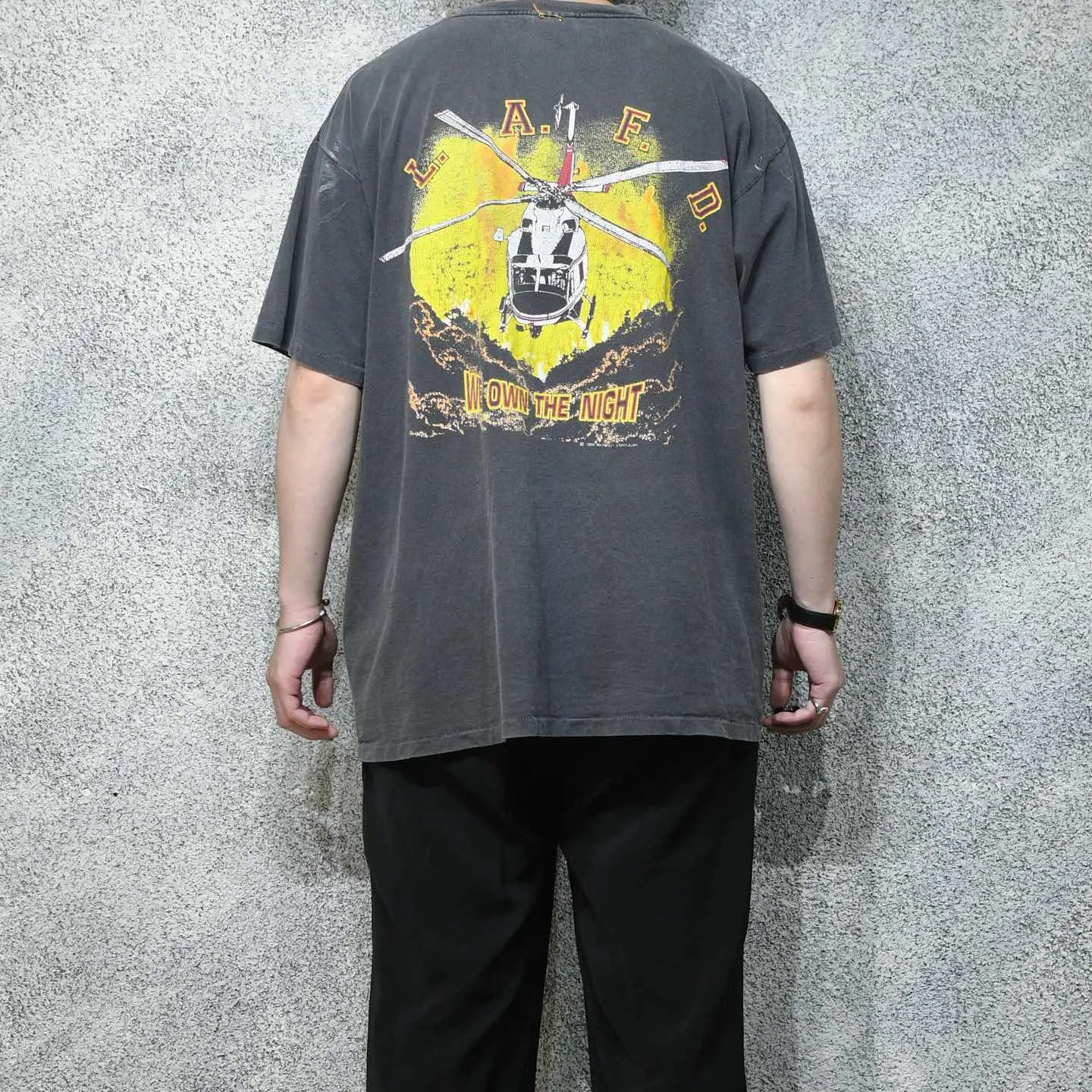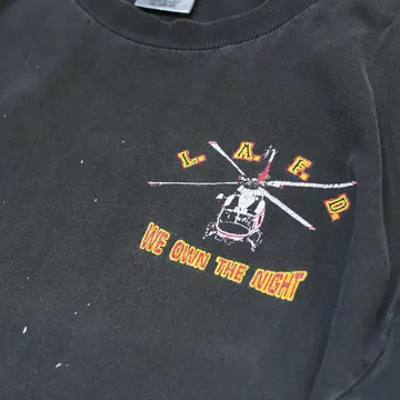 SIZE:XL 着丈73cm 肩幅60cm 身幅67cm 袖丈24cm(シングルステッチ) fabric/cotton made in USA 着用画像 177cm/64kg ロサンゼルス消防局のエアサポート部隊を モチーフにしたTシャツ。 プリントされたヘリコプターは、 Bell412型ヘリコプターで山火事や夜間レスキュー、 救急搬送に使用されていたようです。 程よく飛んだペンキ、フェードしたボディ そして割れたプリント。 個人的に思う、最高の状態で見つかった Tシャツです。 サイズバランスの良い点も◎ ※撮影状況により、実物と多少色が異なる場合が ございます。 ※古着を取り扱っているため、気づかない汚れや ほつれ等がある場合がございます。 予めご了承ください。 ※サイズは着用感で選んでおり、 表記サイズではございません。 表記サイズは説明欄の最初に記載しております。 古着 オーバーサイズ old vintage ヴィンテージ used 80's 90's アメリカ古着 ユーロ古着 メンズ レディース POLO RALPH LAUREN Eddie Bauer OLD GAP Eddie Bauer LANDS' END ランズエンド LLBean エルエルビーン オールドギャップ エディーバウアー ラルフローレン ブルックスブラザーズ Brooks Brothers 半袖Tシャツ Tシャツ プリントTシャツ 炭黒 チャコールグレー ブラック 黒 両面プリント などがお好きな方 #vintage #オーバーサイズ #old #used #90s #80s #古着 #ヴィンテージ #アメリカ古着 #ユーロ古着 #古着男子 #古着女子 #LLBean #エルエルビーン #EddieBauer #エディーバウアー #oldgap #オールドギャップ #LANDSEND #ランズエンド #NAUTICA #ノーティカ #ラルフローレン #POLORALPHLAUREN #ブルックスブラザーズ #BrooksBrothers #半袖Tシャツ #フェード #プリントTシャツ #Tシャツ #両面プリント #シングルステッチ