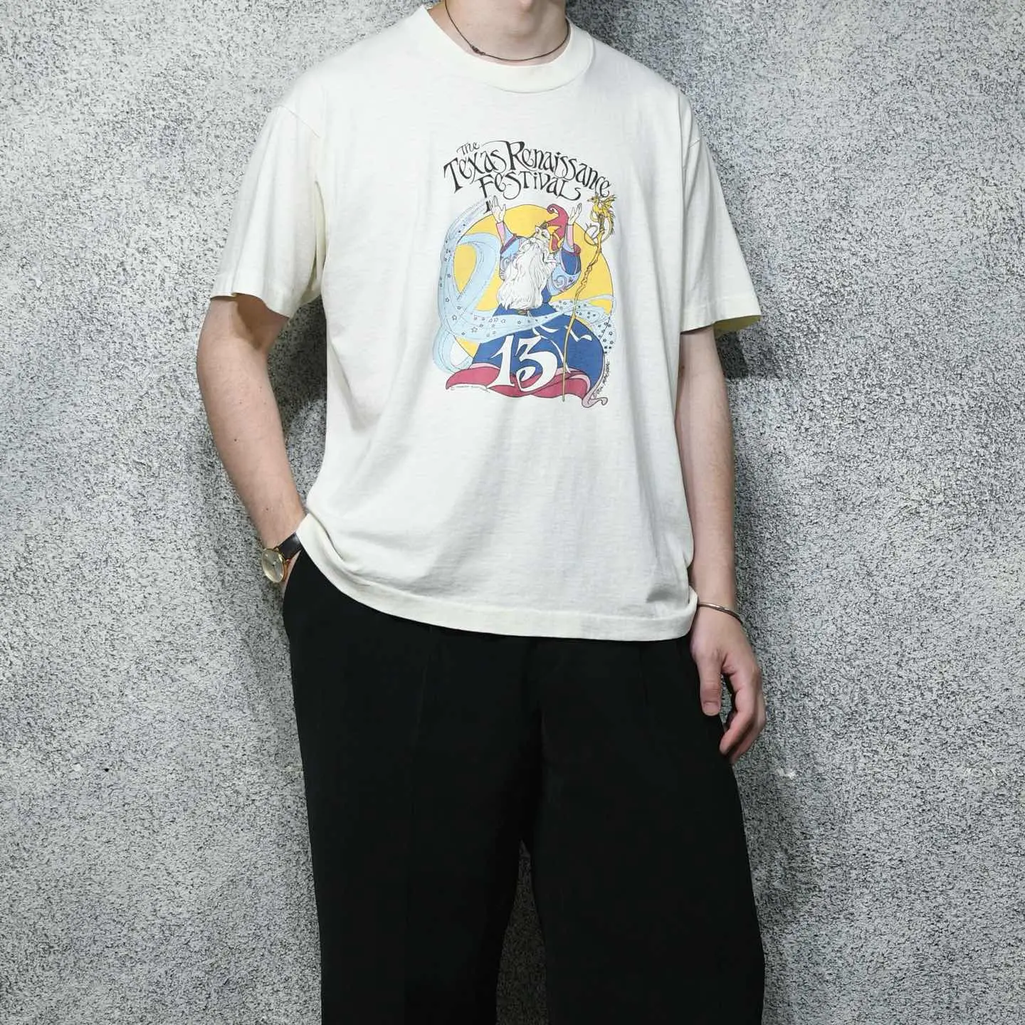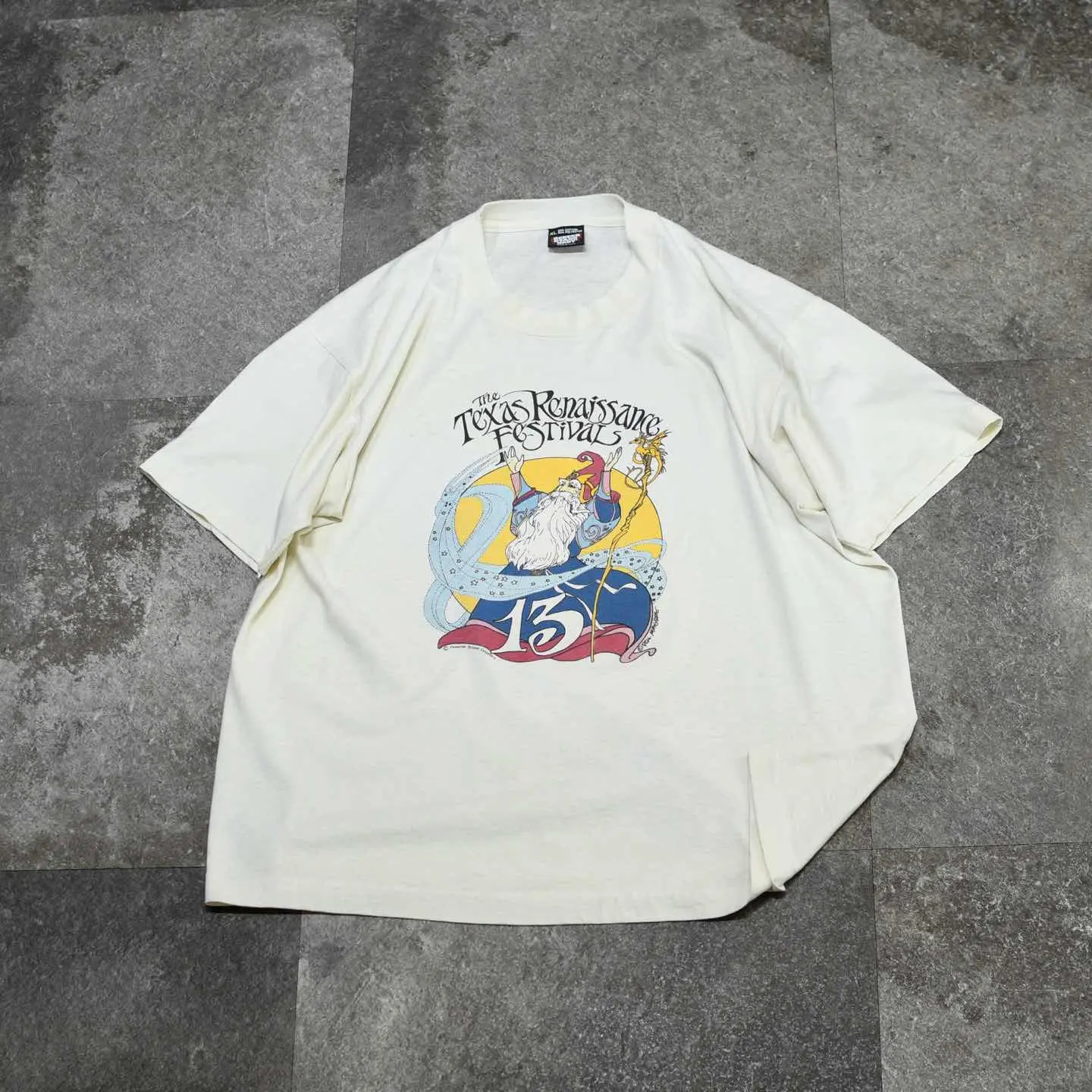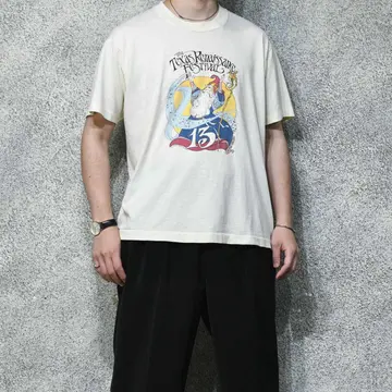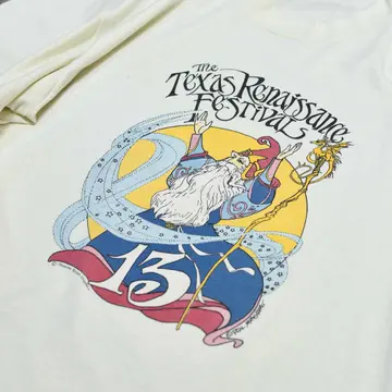 SIZE:XL 着丈68cm 肩幅57cm 身幅63cm 袖丈21cm(シングルステッチ) fabric/cotton・poly made in USA 着用画像 177cm/64kg アメリカ、テキサス州で毎年秋に開催される、 ルネサンス期をテーマにした野外フェスティバル。 その13周年を記念して製作されたTシャツ。 1974年から始まった、アメリカ最大級の ルネサンスフェスティバルらしく、中世の衣装や ライブ、演劇などを行なっているようです。 ややファンタジックでレトロなグラフィックに 惹かれた1着。 古着らしいてろっとしたボディの質感、 身幅がしっかりあるのに対して、 着丈がすっきりとしているのも◎ ※首元に軽度のダメージ、 フロントに軽度の汚れあり。 ※撮影状況により、実物と多少色が異なる場合が ございます。 ※古着を取り扱っているため、気づかない汚れや ほつれ等がある場合がございます。 予めご了承ください。 ※サイズは着用感で選んでおり、 表記サイズではございません。 表記サイズは説明欄の最初に記載しております。 古着 オーバーサイズ old vintage ヴィンテージ used 80's 90's アメリカ古着 ユーロ古着 メンズ レディース POLO RALPH LAUREN Eddie Bauer OLD GAP Eddie Bauer LANDS' END ランズエンド LLBean エルエルビーン オールドギャップ エディーバウアー ラルフローレン ブルックスブラザーズ Brooks Brothers 半袖Tシャツ Tシャツ プリントTシャツ などがお好きな方 #vintage #オーバーサイズ #old #used #90s #80s #古着 #ヴィンテージ #アメリカ古着 #ユーロ古着 #古着男子 #古着女子 #LLBean #エルエルビーン #EddieBauer #エディーバウアー #oldgap #オールドギャップ #LANDSEND #ランズエンド #NAUTICA #ノーティカ #ラルフローレン #POLORALPHLAUREN #ブルックスブラザーズ #BrooksBrothers #シングルステッチ #プリントTシャツ #Tシャツ #半袖Tシャツ