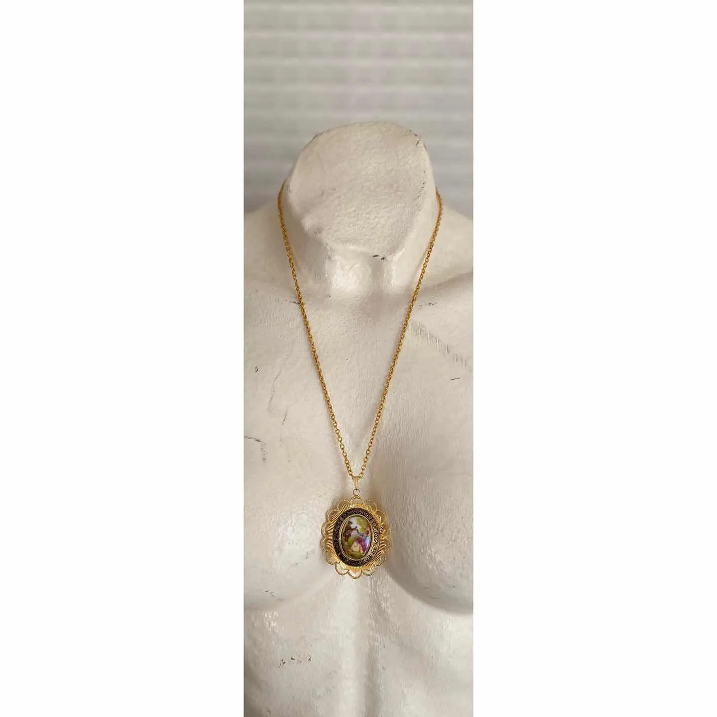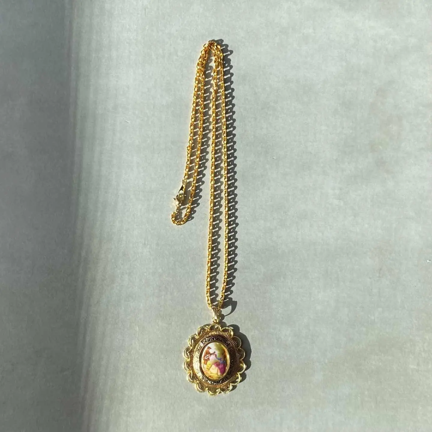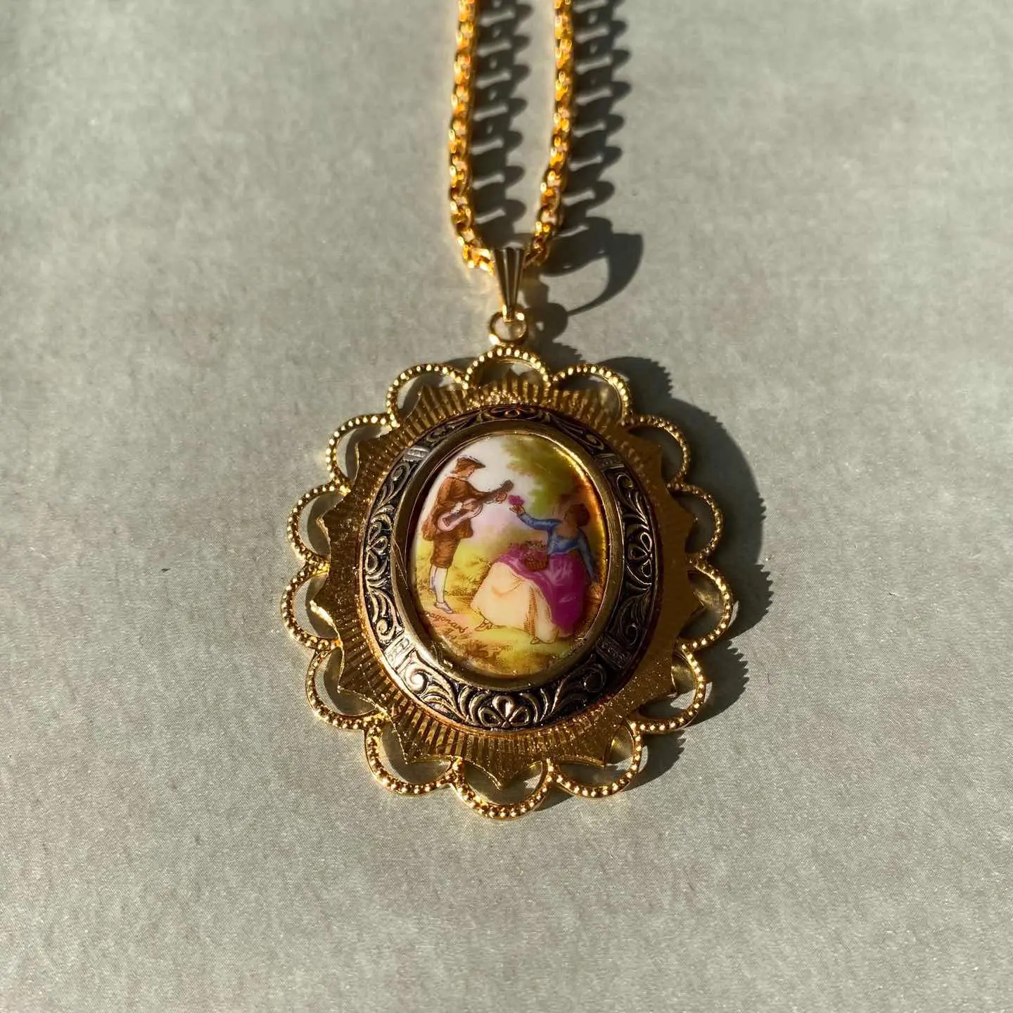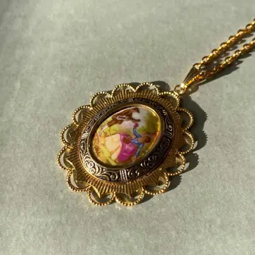 美しい絵柄が魅力的なUSAヴィンテージネックレス。陶器のストーンにはカップルが丁寧に描かれています。クラシカルで繊細なメタル装飾も魅力的。存在感がありスタイリングにエレガントな印象を与えてくれます。 □Materials メタル(ゴールドメッキ)、陶器 (※バチカン及びエンド金具は新品のものに交換しています) □Size 全長 約61㎝ チェーン幅 約3㎜ トップ部分 約H5.8×W4.1㎝(バチカン含む) □Condition【C】 パーツ裏側に細かなスレ傷がみられます。中古品であることをご理解のうえお買い求めください。 【S】未使用 【A】未使用に近い 【B】やや使用感あり 【C】使用感あり Item No.2600 #レトロ #アメリカ #ヴィンテージ #アクセサリー #ビクトリアン #カップル #陶器 #ネックレス
