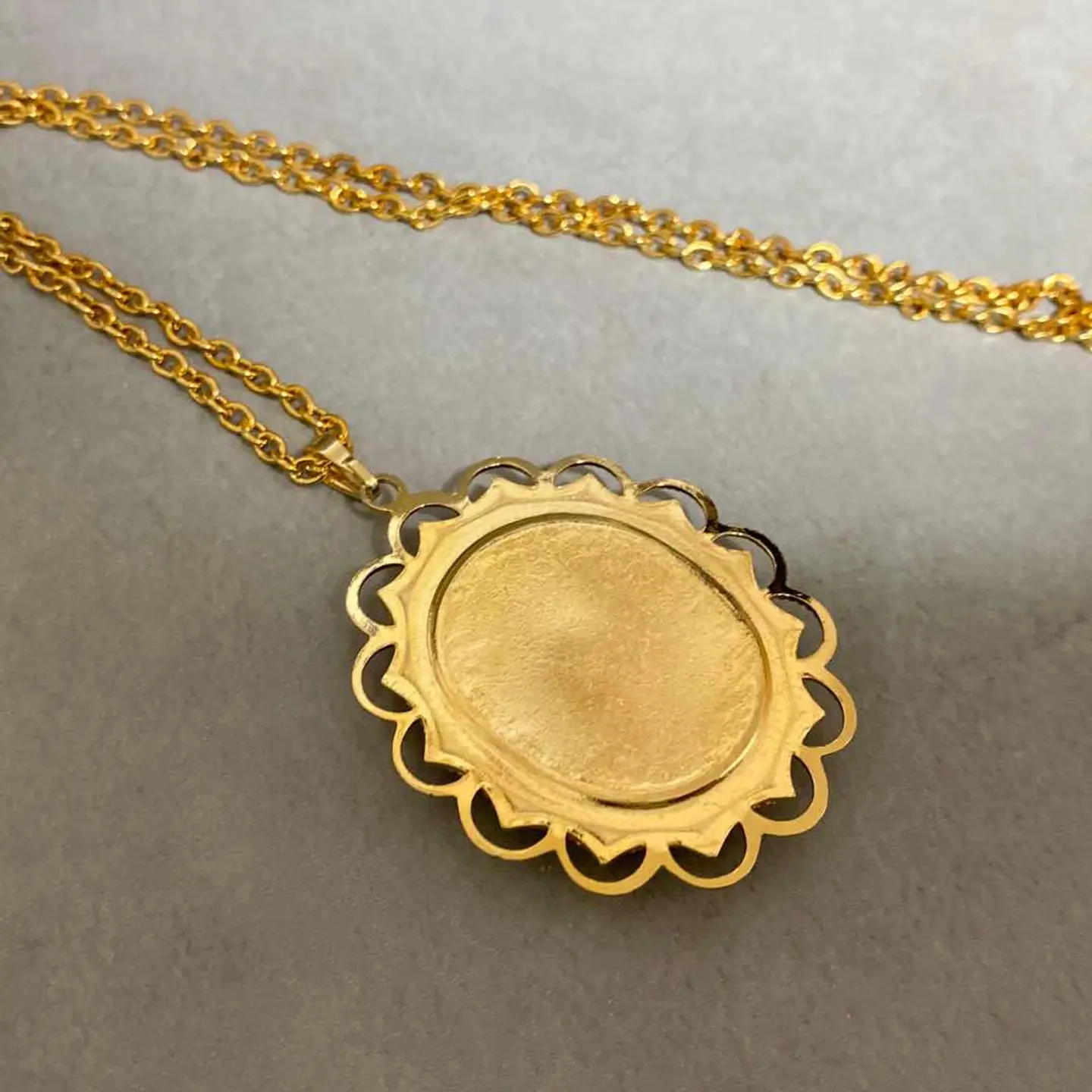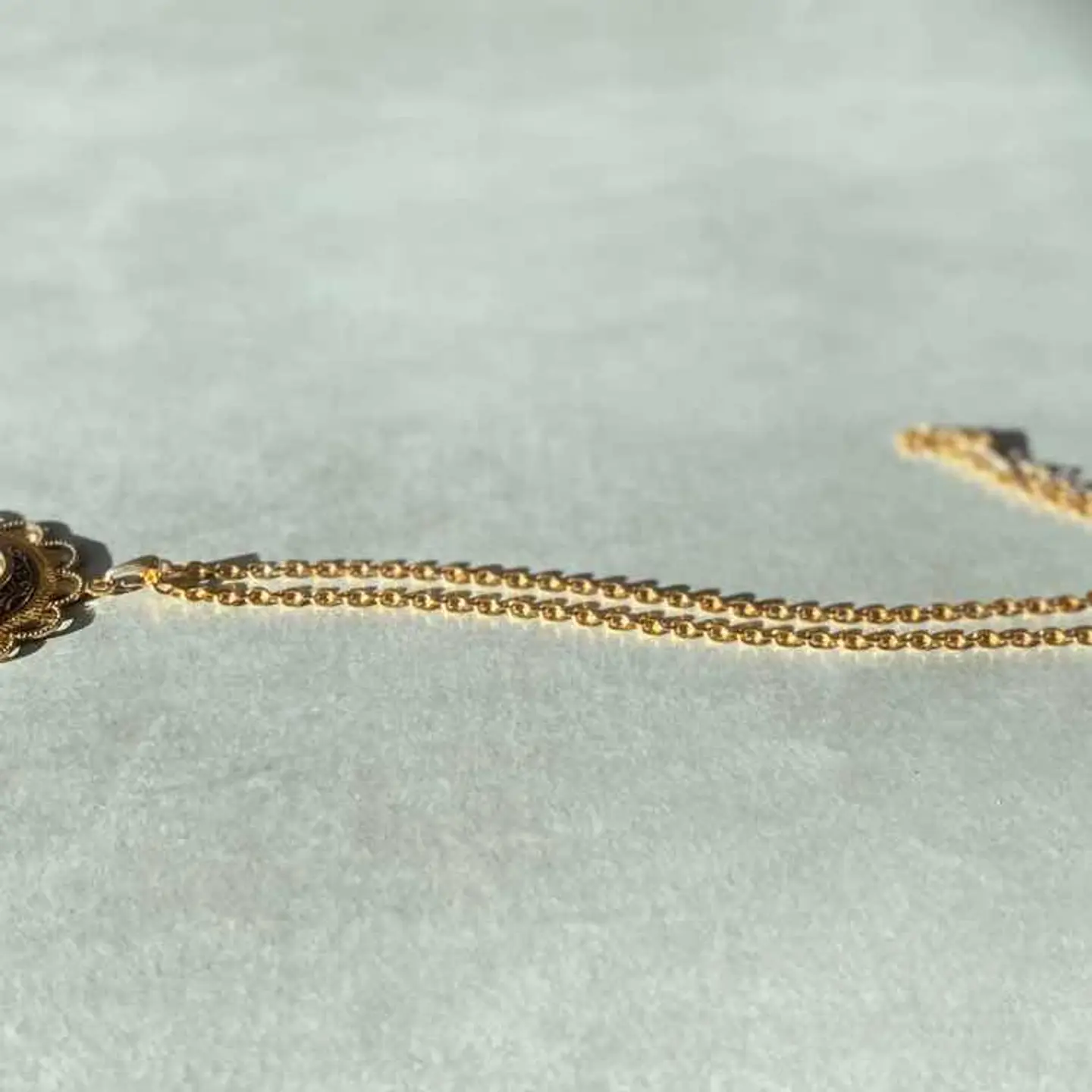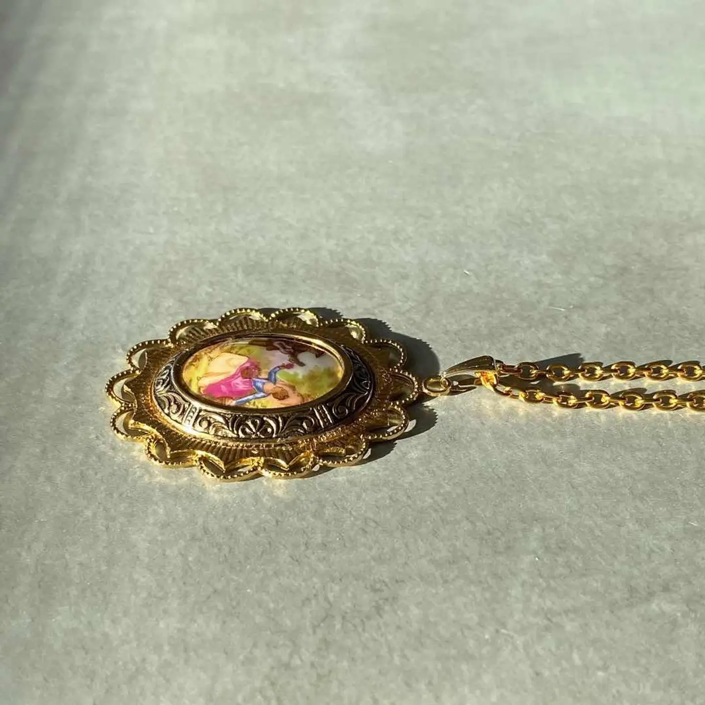 美しい絵柄が魅力的なUSAヴィンテージネックレス。陶器のストーンにはカップルが丁寧に描かれています。クラシカルで繊細なメタル装飾も魅力的。存在感がありスタイリングにエレガントな印象を与えてくれます。 □Materials メタル(ゴールドメッキ)、陶器 (※バチカン及びエンド金具は新品のものに交換しています) □Size 全長 約61㎝ チェーン幅 約3㎜ トップ部分 約H5.8×W4.1㎝(バチカン含む) □Condition【C】 パーツ裏側に細かなスレ傷がみられます。中古品であることをご理解のうえお買い求めください。 【S】未使用 【A】未使用に近い 【B】やや使用感あり 【C】使用感あり Item No.2600 #レトロ #アメリカ #ヴィンテージ #アクセサリー #ビクトリアン #カップル #陶器 #ネックレス