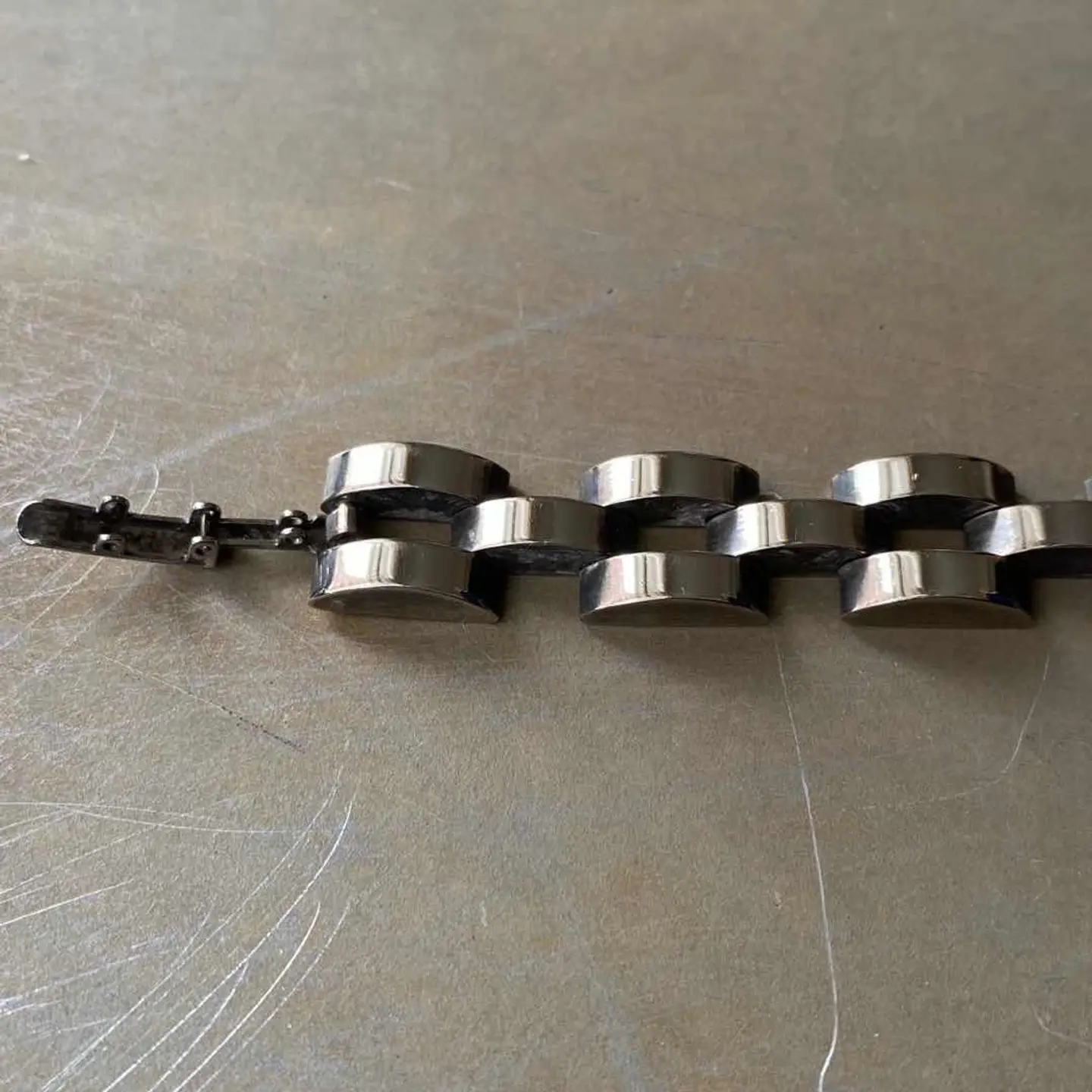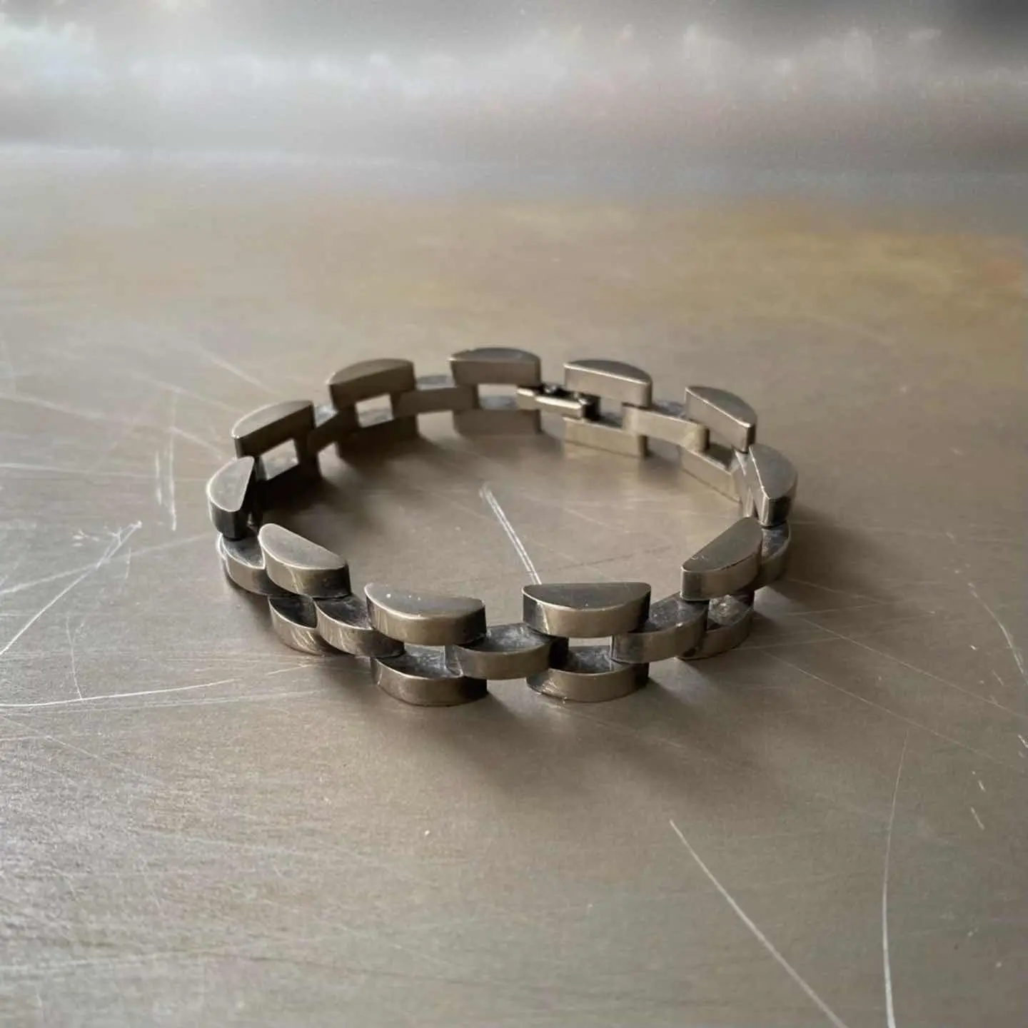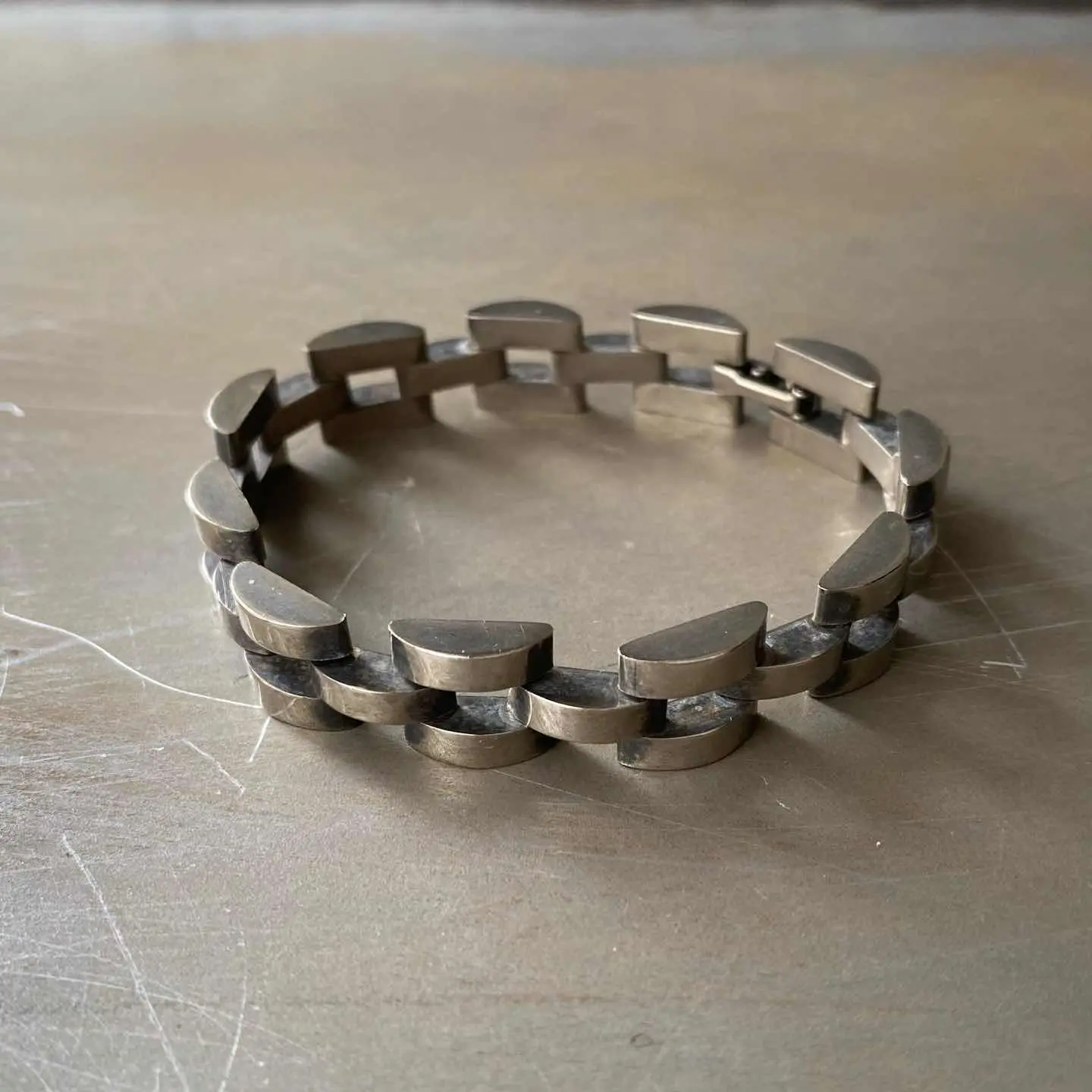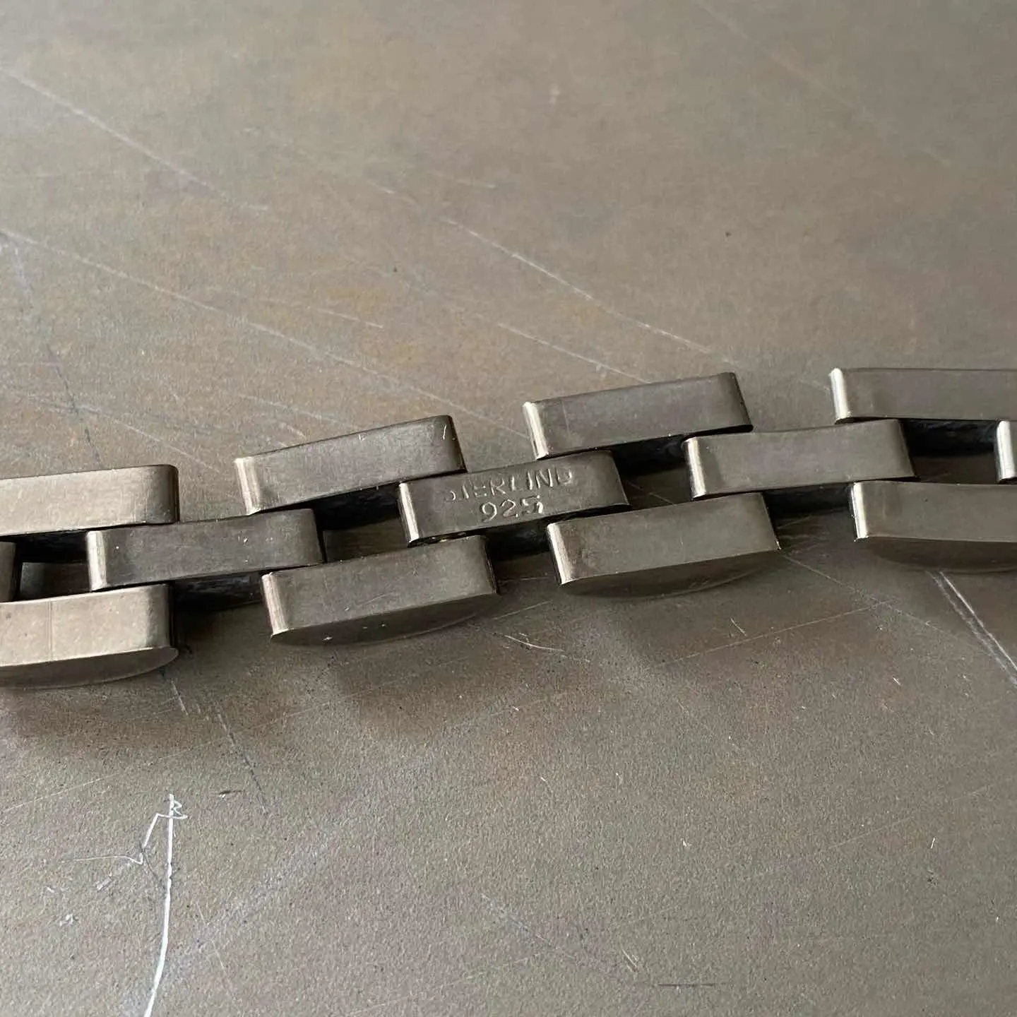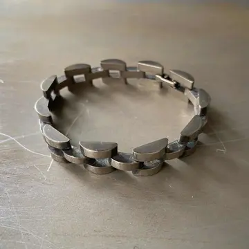 レトロモードな雰囲気のシルバー製USAヴィンテージブレスレット。重厚感のあるしっかりとした作りとシンプルながら個性的なチェーンが特徴的。存在感があり古着など様々なスタイルに合わせて頂けます。シルバー製ですのでお手入れをすることで長くお使い頂けます。 □Materials シルバー925 STERLING 925刻印入り □Size 全長 約19.7㎝ 幅 約1.1㎝ 重さ42g □Condition【C】 経年によるメタルのトーンダウンや細かなスレ傷等使用感がみられます。中古品であることをご理解のうえお買い求めください。ご購入前に必ずショッピングガイドのご確認をお願いいたします。 【S】未使用 【A】未使用に近い 【B】やや使用感あり 【C】使用感あり Item No.2964