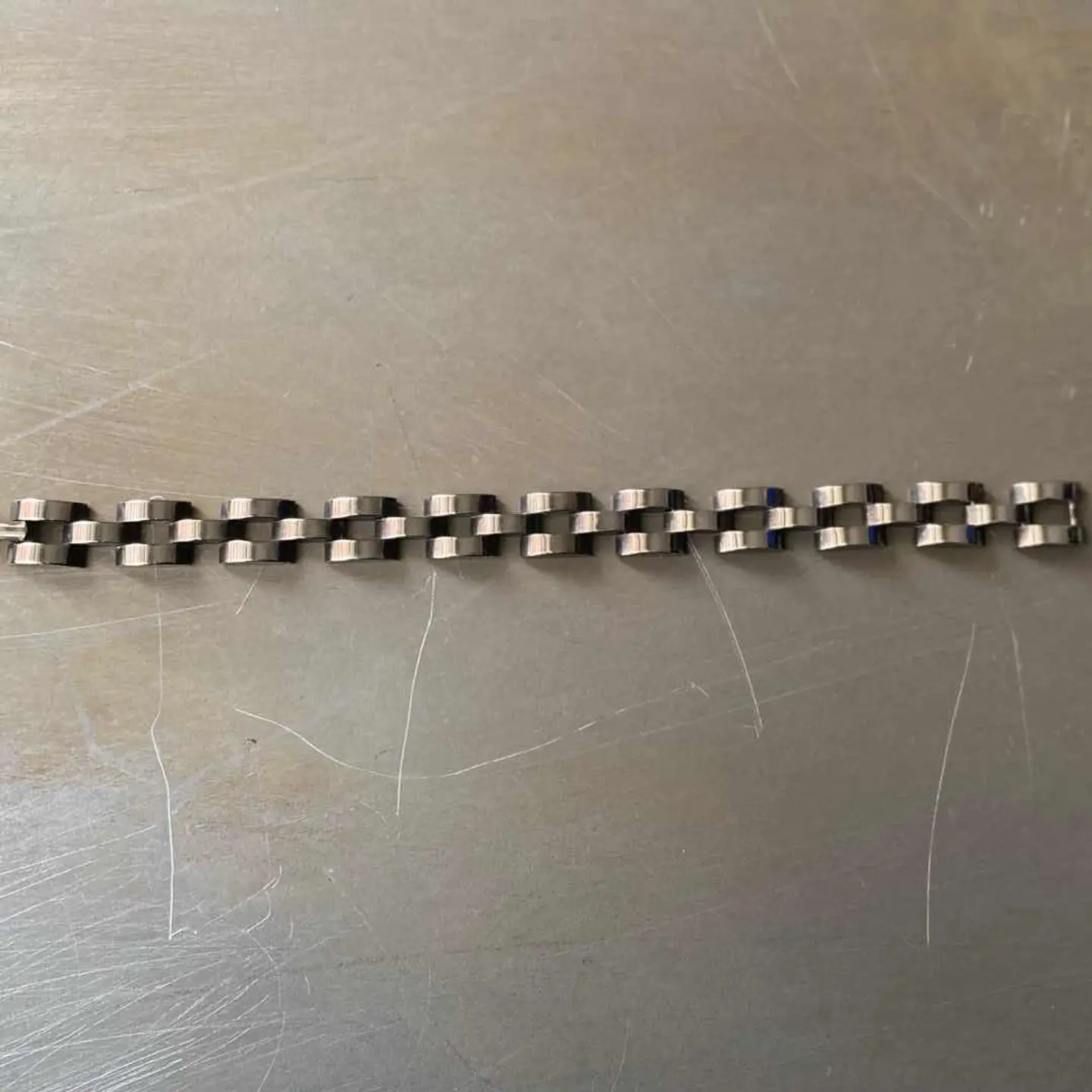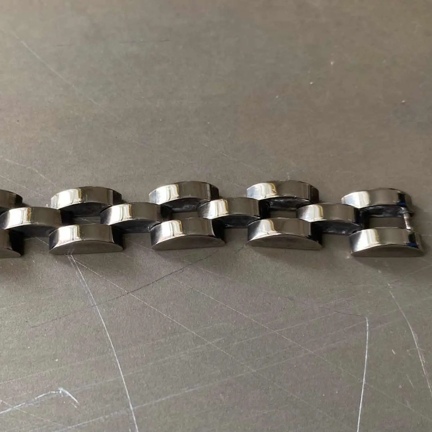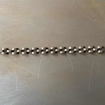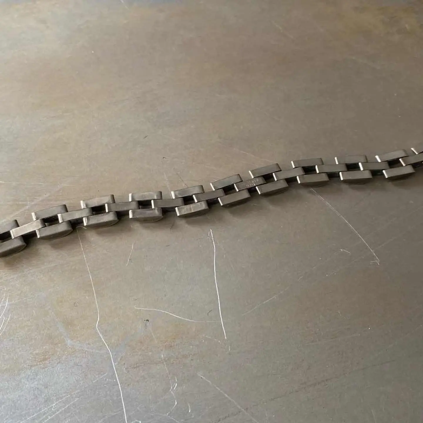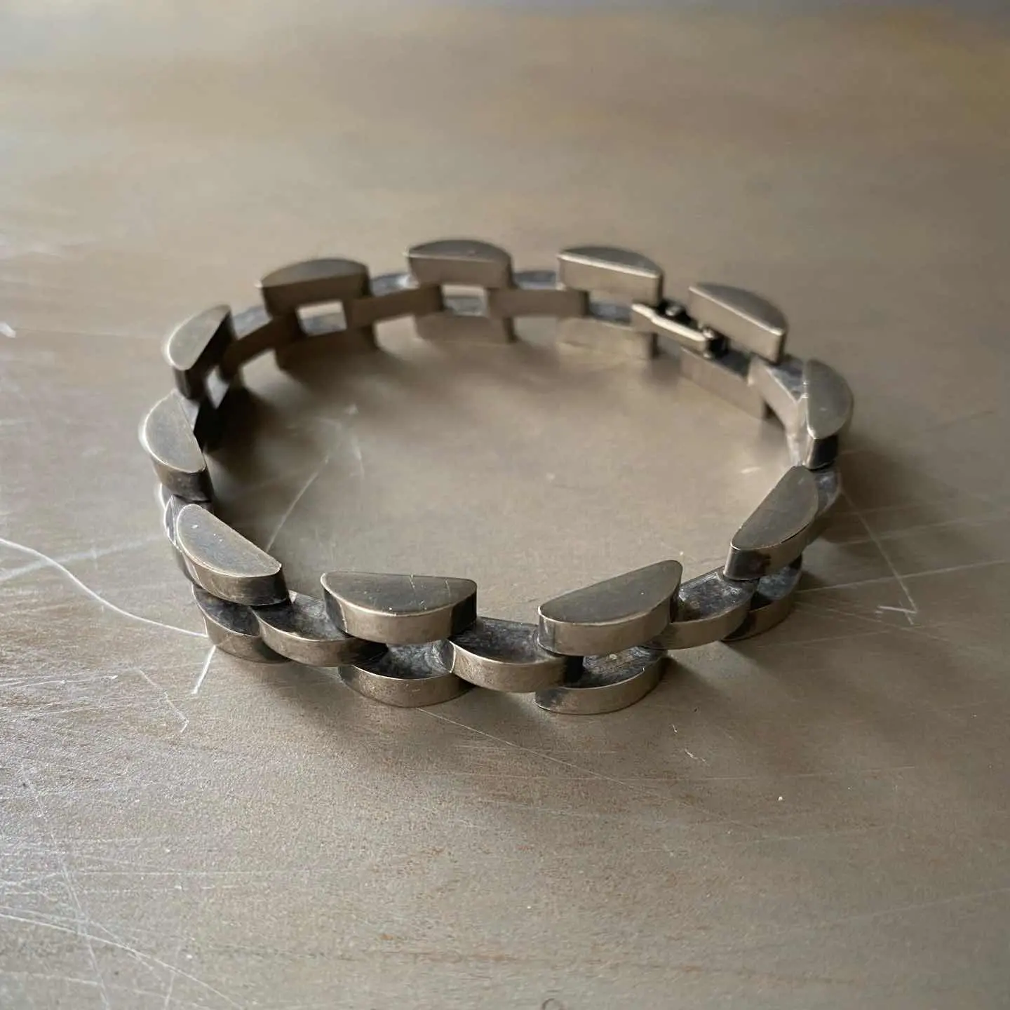 レトロモードな雰囲気のシルバー製USAヴィンテージブレスレット。重厚感のあるしっかりとした作りとシンプルながら個性的なチェーンが特徴的。存在感があり古着など様々なスタイルに合わせて頂けます。シルバー製ですのでお手入れをすることで長くお使い頂けます。 □Materials シルバー925 STERLING 925刻印入り □Size 全長 約19.7㎝ 幅 約1.1㎝ 重さ42g □Condition【C】 経年によるメタルのトーンダウンや細かなスレ傷等使用感がみられます。中古品であることをご理解のうえお買い求めください。ご購入前に必ずショッピングガイドのご確認をお願いいたします。 【S】未使用 【A】未使用に近い 【B】やや使用感あり 【C】使用感あり Item No.2964