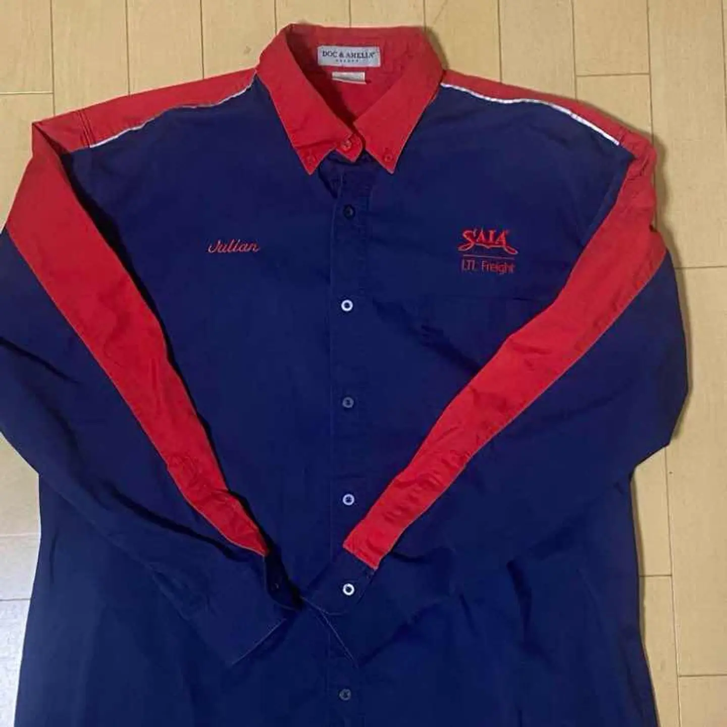 古着屋で去年購入しました。変に汚れもないので良品と言えます 1990年代頃の企業のカラーシャツです。 SALA LTL Frieight とは1924 年にルイジアナ州ホーマで設立された米国のトラック輸送未満の運送会社です。 珍しいレッドとネイビーの組み合わせのツートンカラーで対比色ですがお互い邪魔をしてない配色がとてもかっこいい1着になります。 サイズも大きめですので、大きくゆるっと着こなしたい方にはとてもオススメです。 一点物ですのでお早めに ------------------------------------------------------- サイズ 表記 不明 (日本メンズ L~XL相当) 実寸(平置きcm) 身幅65cm 着丈68cm 肩幅54cm 袖丈62cm カラー…=レッド×ネイビー 季節感…春・秋・冬 素材…コットン ------------------------------------------------------- USA製 アメリカ 70s 80s アメカジ アメトラ クラシック ストリート HIPHOP b-boy BIGMAC champion Carhartt オーバーオール カバーオール、大戦、ヴィンテージ、デニムヴィンテージ パウエル オールドスクール エラ サンタクルズ スラッシャー vans 霜降り 染み込み 501xx ツートン 後付け フルジップ ダブルフェイス ドラポケ セパポケ パチポケ 80s 70s 90s 60s 50s 40s 30s usn usma usmc usafa usaf usarmy ma1 レーヨン オンブレ プリントコーデュロイ プリントコーズ levis lee wrangler エアジョーダン エアマックス sb ジャックパーセル 古着 格安 激安 鬼ヒゲ ヴィンテージジーンズ 557 506 507 70505 517 646 519 68 m47 m52 モールスキン フレンチワーク ミリタリー インディゴリネンanatomica auralee unused barbourバンドT AKIRA needles adidas arc'teryx teatora paraboot j.m.weston patagonia ボーリングシャツ ワークシャツ #vintage #古着 #90s #used #ストリート