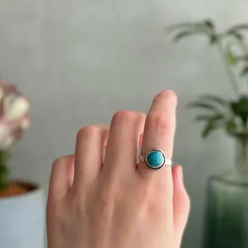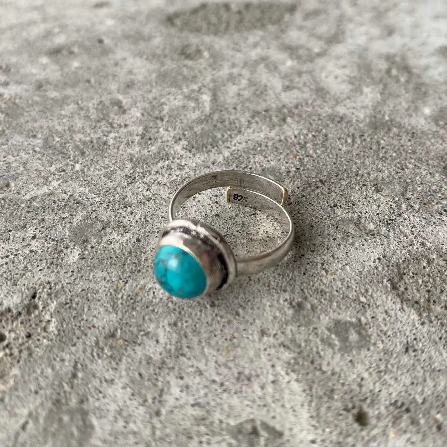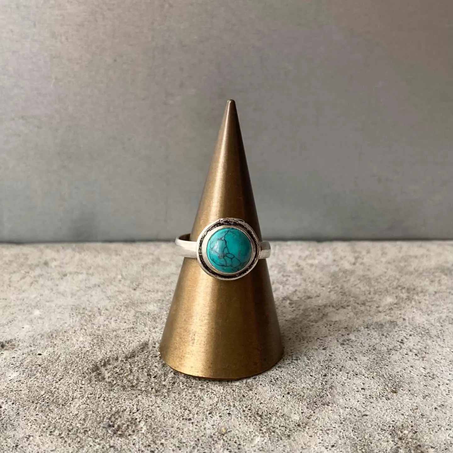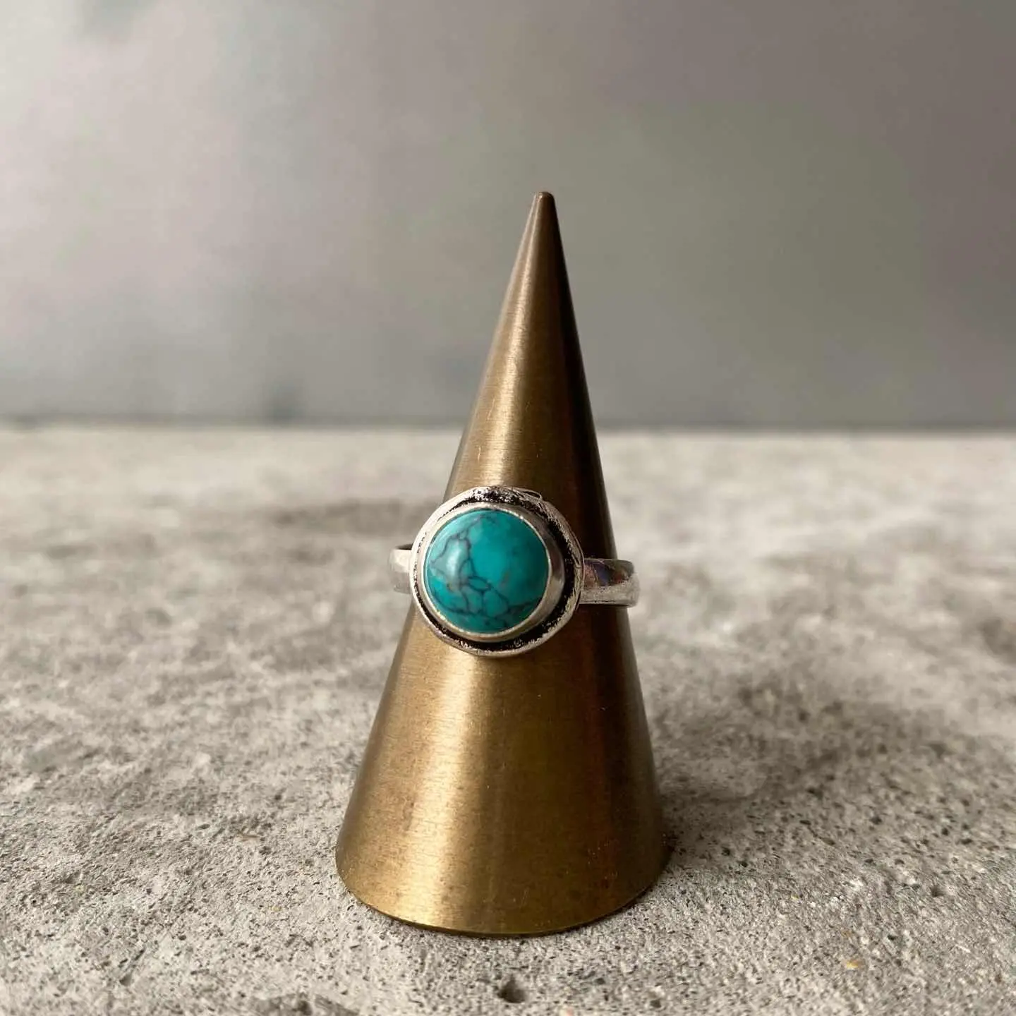 鮮やかなブルーの色合いが魅力的な天然石リング。12月の誕生石「ターコイズ」の石言葉は「成功・繁栄・自由」。旅の安全を願うお守りとして古くより用いられています。シンプルなデザインと身につけやすいサイズ感もポイント。古着やユニセックスなスタイルにもおすすめです。 □Materials 天然石(ハウライトターコイズ)、真鍮(シルバー925メッキ) □Size 11号(フリーサイズ) リング幅 約3㎜ 石座直径 約1.2㎝ ストーン直径 約8㎜ □Condition こちらの商品は海外(USA)買付の新品です。元々の作りですがリング部分に細かなスレ傷、リングの曲面部分にフラットになっている箇所がございます。(※石材には内包物など天然石ならではの特徴がみられます)海外ハンドメイド製品の為ラフな作りがお好きな方にオススメです。ご購入前に必ずショッピングガイドのご確認をお願いいたします。 Item No.3132