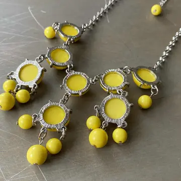 レトロポップなデザインのUSAユーズドネックレス。イエローのストーンが揺らめくお洒落なデザイン。ボリューム感がありスタイリングの差し色におすすめです。 □Materials メタル(シルバーメッキ)、プラスチック □Size 全長 約47㎝+アジャスター8㎝ パーツ部分 幅 約3〜6.5㎝ □Condition【B】 画像の通りビーズの一部に黒ずみがみられます。全体的には良好な状態です。中古品であることをご理解のうえお買い求めください。ご購入前にショッピングガイドのご確認をお願いいたします。 【S】未使用 【A】未使用に近い 【B】やや使用感あり 【C】使用感あり Item No.3259