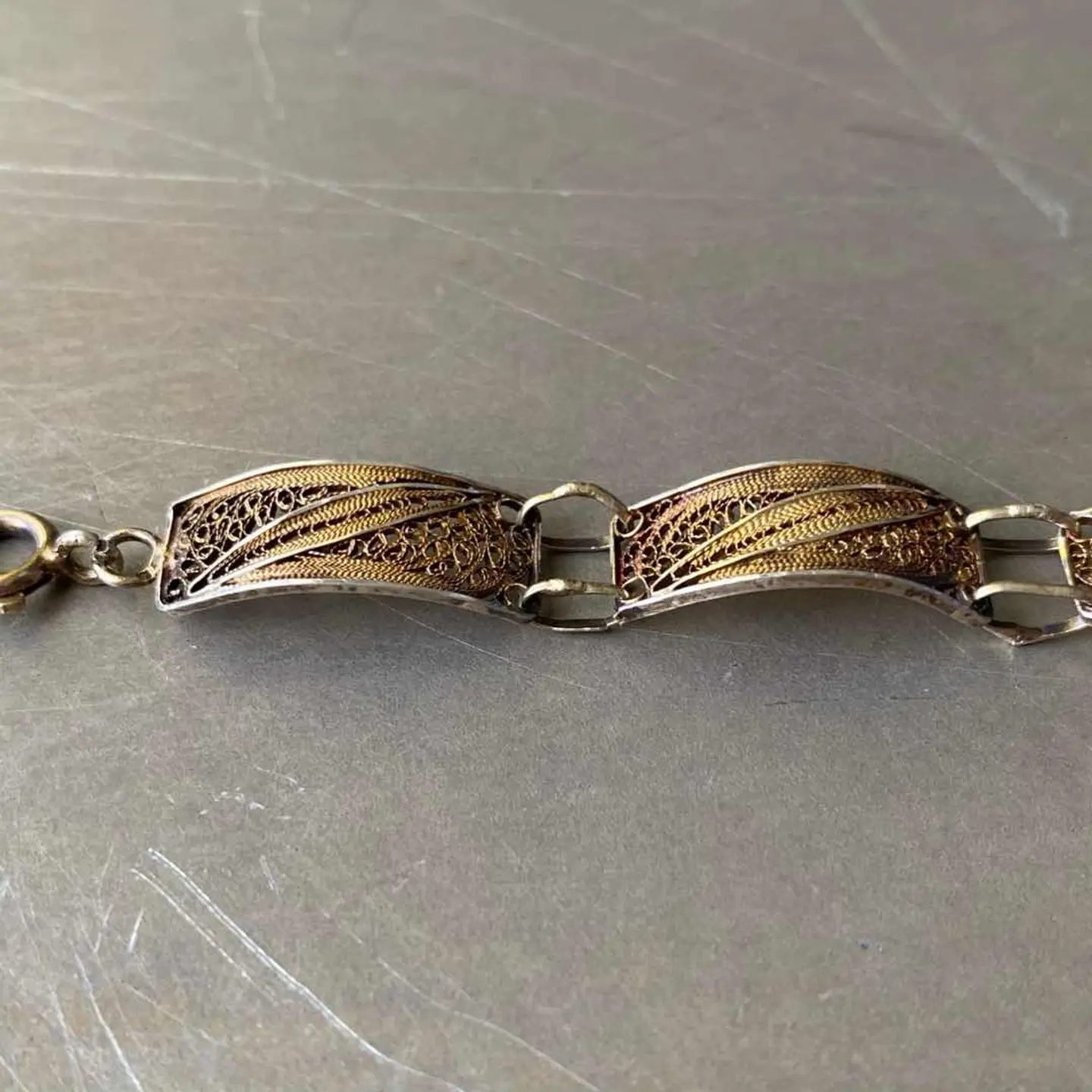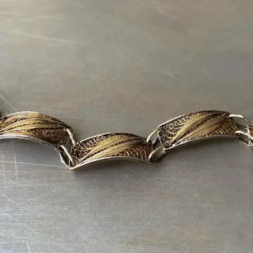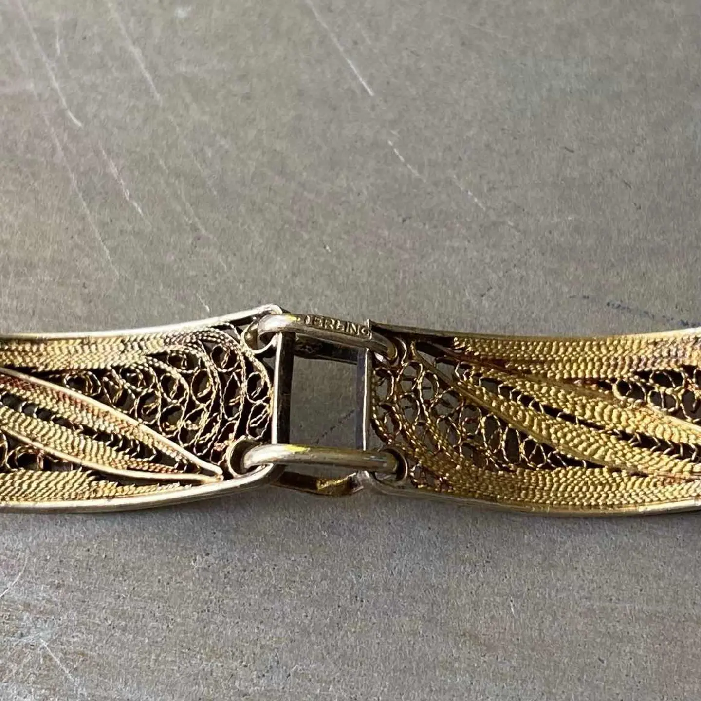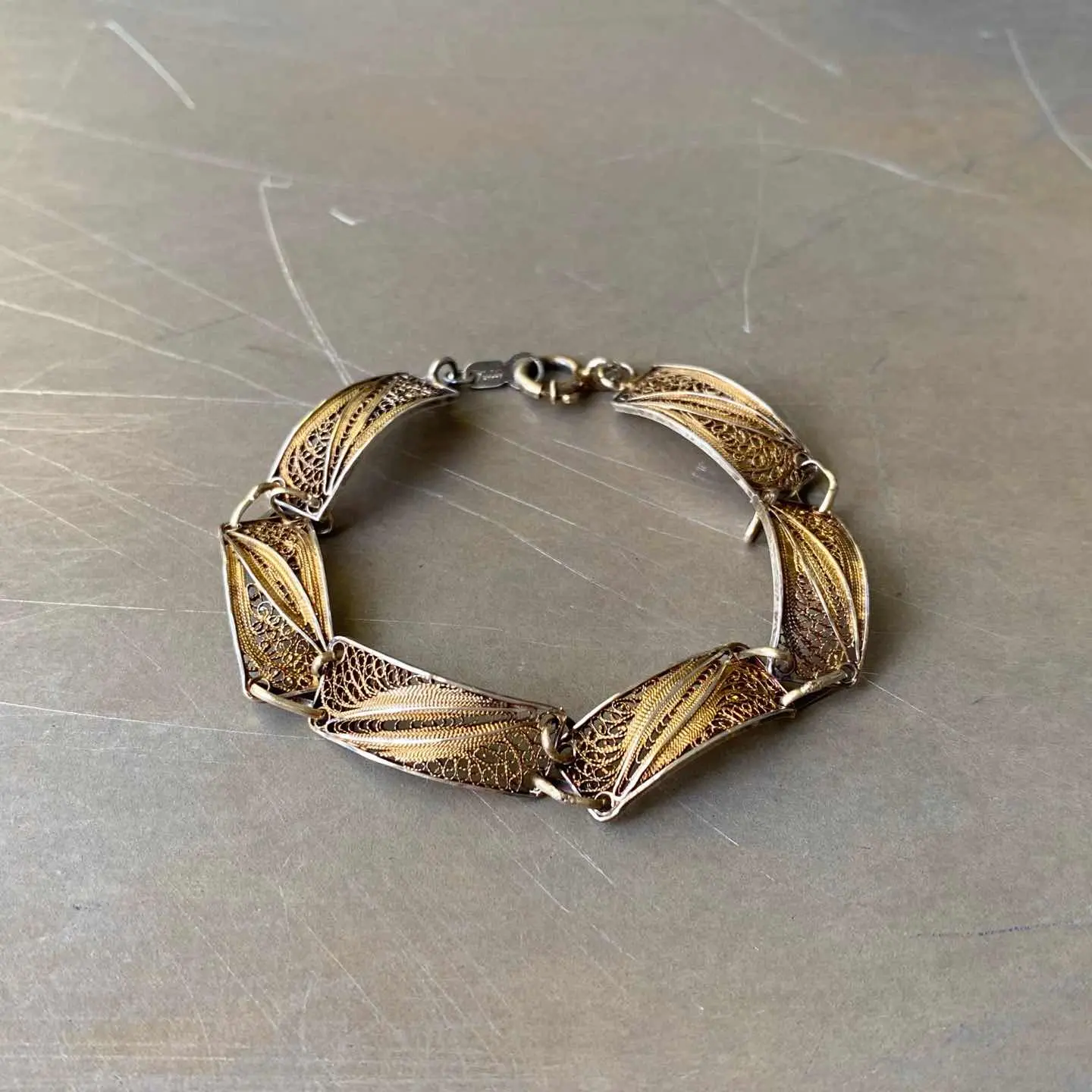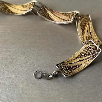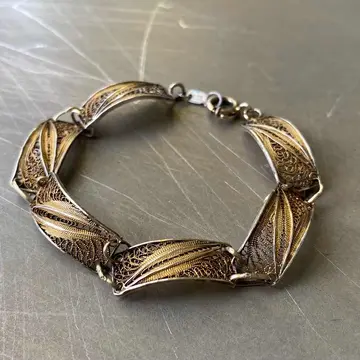 クラシカルな銀線細工のUSAヴィンテージブレスレット。「フィリグラーナ」技法による銀線で表現された繊細で軽やかな作りが魅力的です。古びた色合いもヴィンテージ感があり良い雰囲気。大人の古着スタイルにおすすめのアイテムです。 □Materials シルバー925(ゴールドメッキ) (STERLING /925刻印入り) ※925刻印入りの板ダルマのみ新品のものに交換しています □Size 全長 約17.8㎝ 幅 約9㎜ パーツ厚み 約1㎜ 重さ 約7g □Condition【C】 画像の通り全体的に変色がみられます。元々、シルバーにゴールドメッキ加工がされた商品ですが、経年による変色やメッキ剥がれにより所々シルバー色になっています。古びた雰囲気がお好きな方におすすめです。中古品であることをご理解のうえお買い求めください。ご購入前に必ずショッピングガイドのご確認をお願いいたします。 【S】未使用 【A】未使用に近い 【B】やや使用感あり 【C】使用感あり Item No.3294