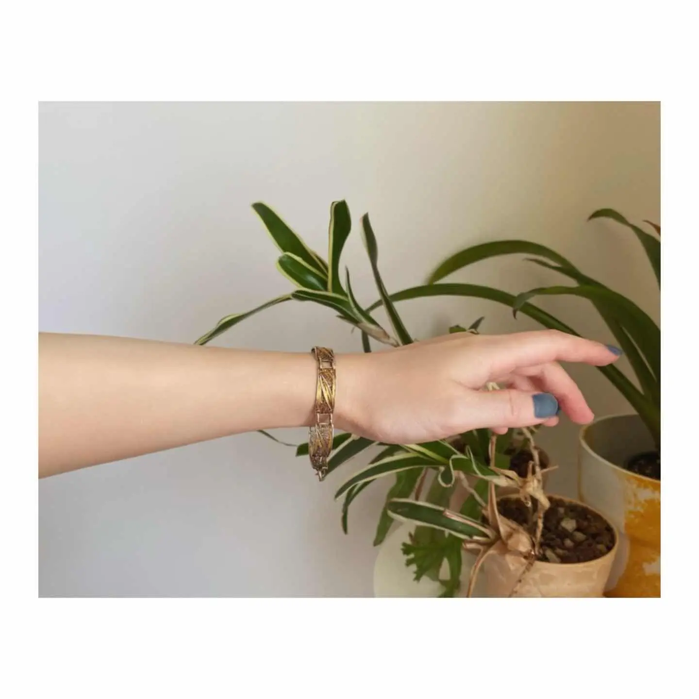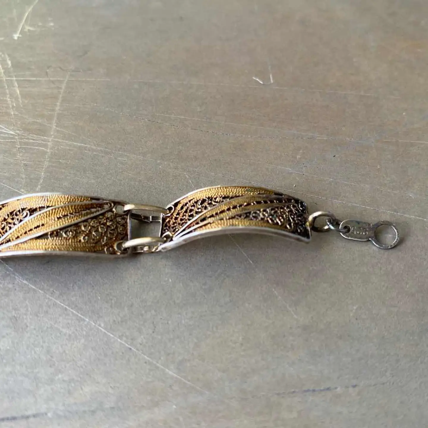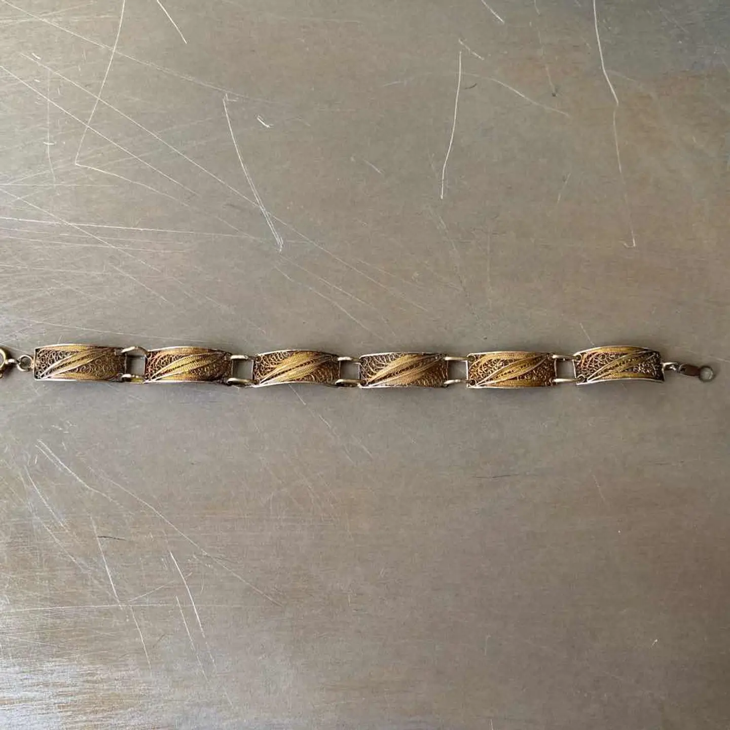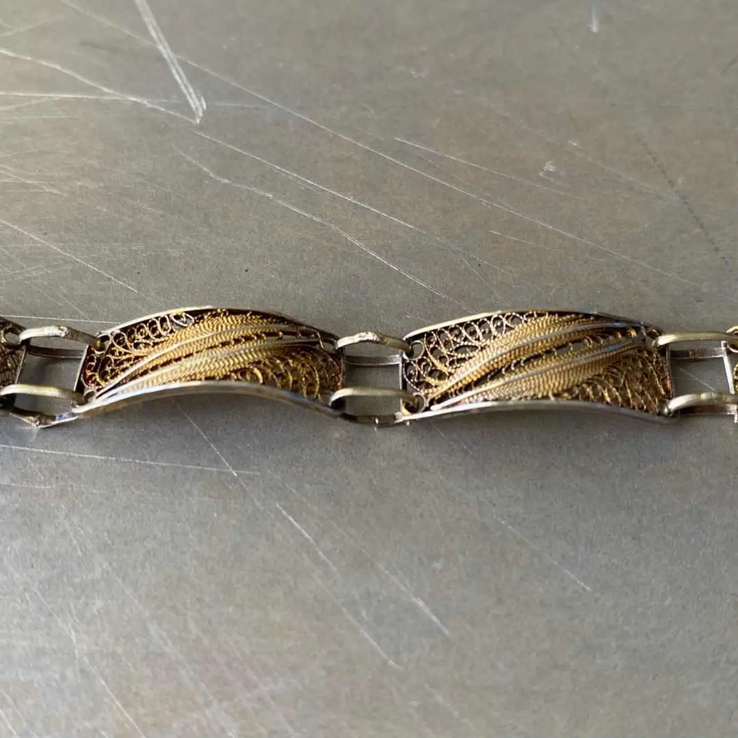 クラシカルな銀線細工のUSAヴィンテージブレスレット。「フィリグラーナ」技法による銀線で表現された繊細で軽やかな作りが魅力的です。古びた色合いもヴィンテージ感があり良い雰囲気。大人の古着スタイルにおすすめのアイテムです。 □Materials シルバー925(ゴールドメッキ) (STERLING /925刻印入り) ※925刻印入りの板ダルマのみ新品のものに交換しています □Size 全長 約17.8㎝ 幅 約9㎜ パーツ厚み 約1㎜ 重さ 約7g □Condition【C】 画像の通り全体的に変色がみられます。元々、シルバーにゴールドメッキ加工がされた商品ですが、経年による変色やメッキ剥がれにより所々シルバー色になっています。古びた雰囲気がお好きな方におすすめです。中古品であることをご理解のうえお買い求めください。ご購入前に必ずショッピングガイドのご確認をお願いいたします。 【S】未使用 【A】未使用に近い 【B】やや使用感あり 【C】使用感あり Item No.3294