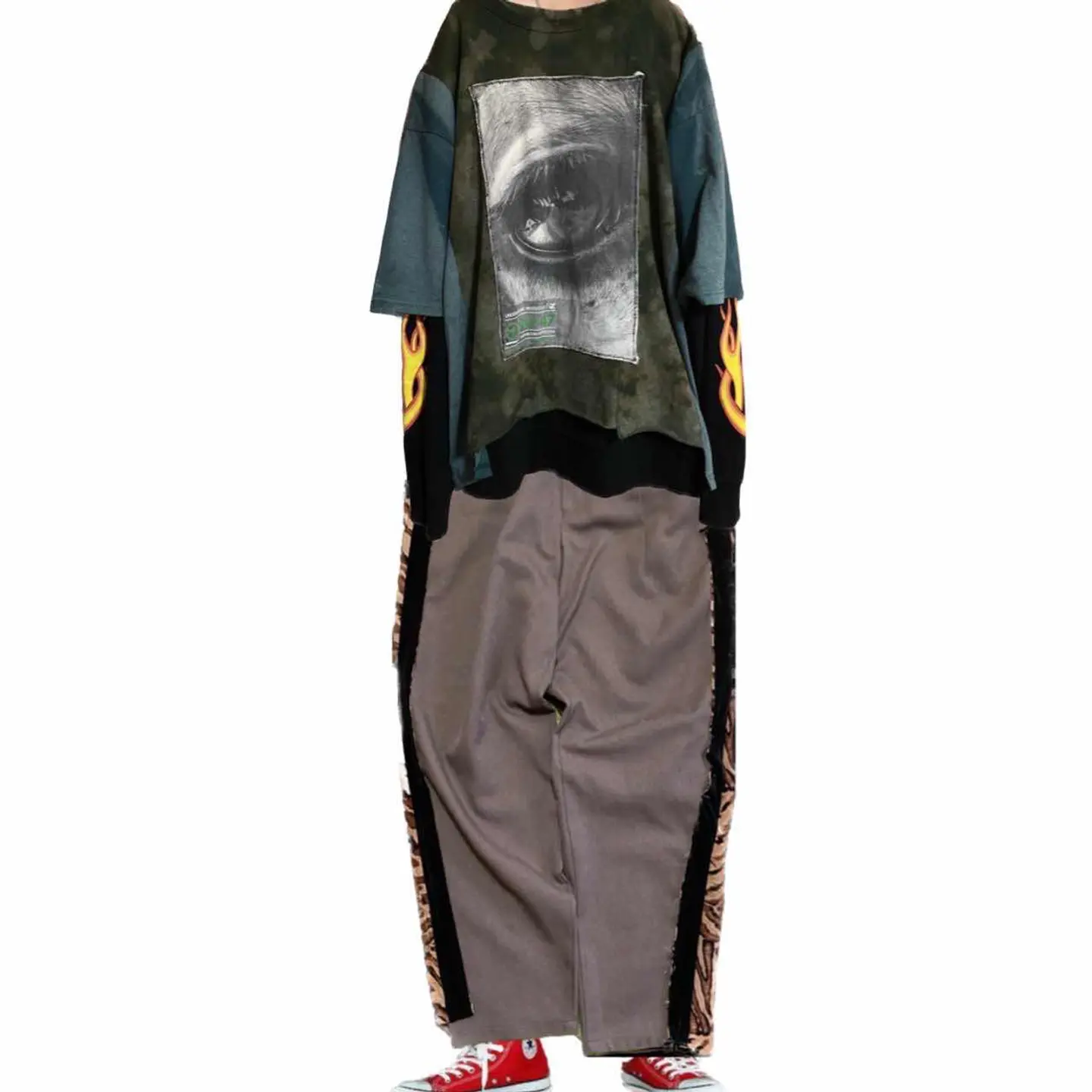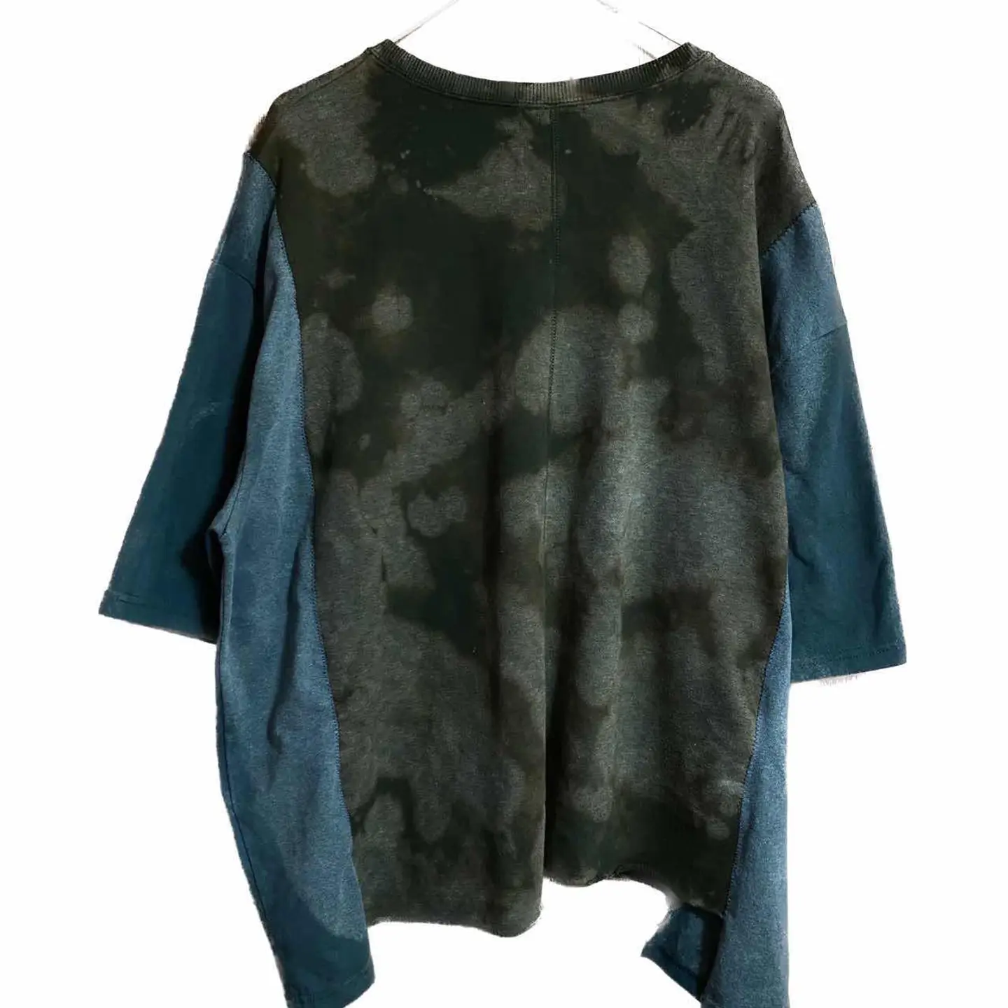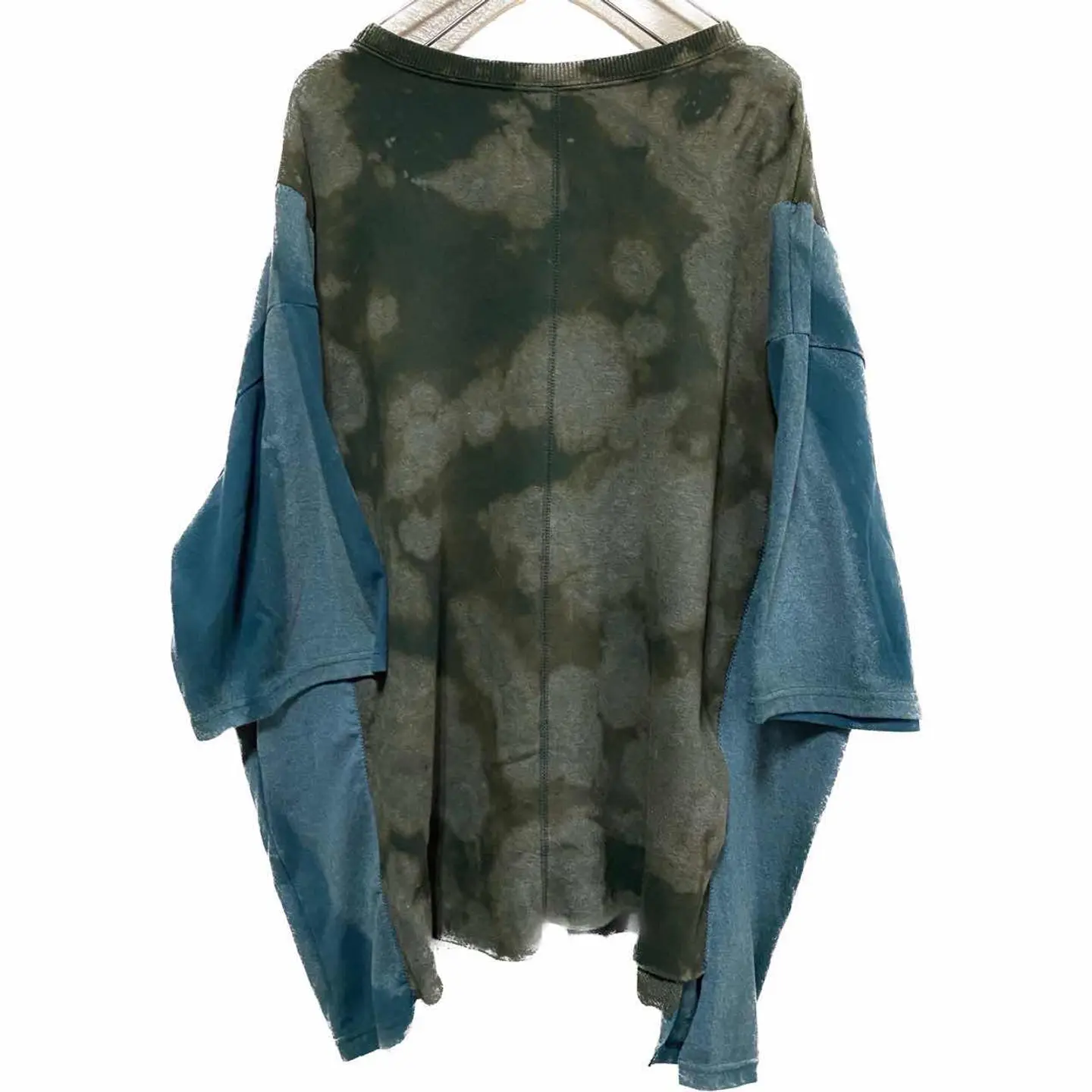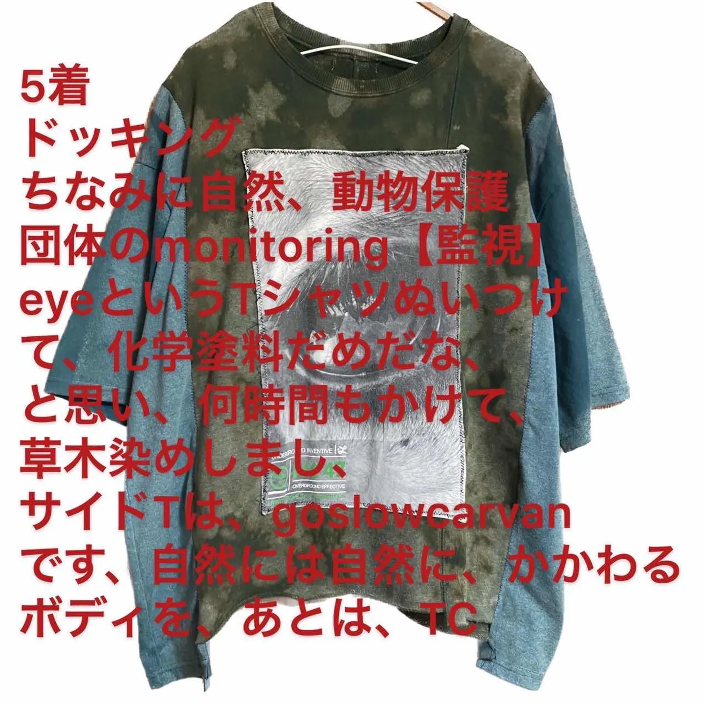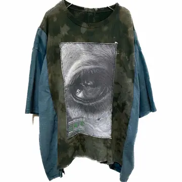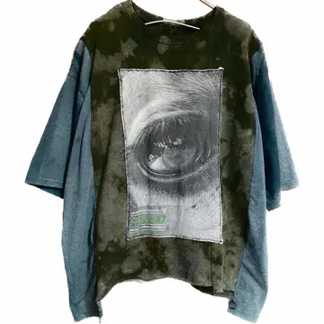 vintage5着ドッキングリメイク モニタリングアイTシャツ F 再構築、リメイクの中でも、何着も 外して縫い合わせる、手間のかかる、それを全て 何時間もかけて草木染めしました 年中活躍するドッキングTシャツです。 メッセージを伝えるときは、インパクトがないと意味がないです、例えば 森を守りたいとします、forest loveと、ロゴを打つとします、何の話やねん?と思いません?知らんしっ森かえれ、みたいなね、 先ず、この目の意味をイカツイと勘違いするかたは、自然を愛すると言わない方がいい、 自然。動物保護団体のです、目が優しいでしょ?? この世にインパクトないと守りたいものなんて守れません。 まぁそんなことはどうでもいいです。個性的でかっこいいのは確実でどなた様にも対応します。 それに意味合いがあるとポリシーが見えますよね、 5着も使ったのはすごい森林伐採問題とか、動物の密輸などを監視するTシャツカッコ良くしたいな、、白Tじゃ、パンチないな、と思ったらから、 だったら一切ケチケチしたボディーは使わないと、きめ、 goslowcarvanや、チェスウィックまで使いました、 コーディネートは、サイジング見るのと、参考程度に、すべてリメイクとかで合わせますので、オリジナルコーディネートになります それではよろしくお願いします。 人の手間とか思い、わかる人に譲りたいです、 ▷color◁ 写真通り、草木染め ※ブラウザで異なる場合ありますがかなり実物には、近づけてます、 ▷size◁ 平置き片面採寸【㎝表記】 表記size Fにするために5着つくった、 着丈/レイヤード簡単に決まるようサイド、フロント長さ違う ※着画参照 F68 S74 身幅/69 肩幅/69DSBOX 80sイメージ 袖丈 /46↓人によるが5-7分なる計算年中いける DSは袖はハンガー採寸 ※多少の誤差は理解下さい 170/Mジャスト体型の私が着て、✔️参考に ジャスト オーバーサイズ ビックサイズ✔️ 【素材】 フロント チェスウィックTCT サマースウェットに属すとあとは、古着TCT2着 サイド go slowcarvan フロント動物、自然保護団体 はい5着、 【状態】 最強、丁寧に作ってます。美品です、