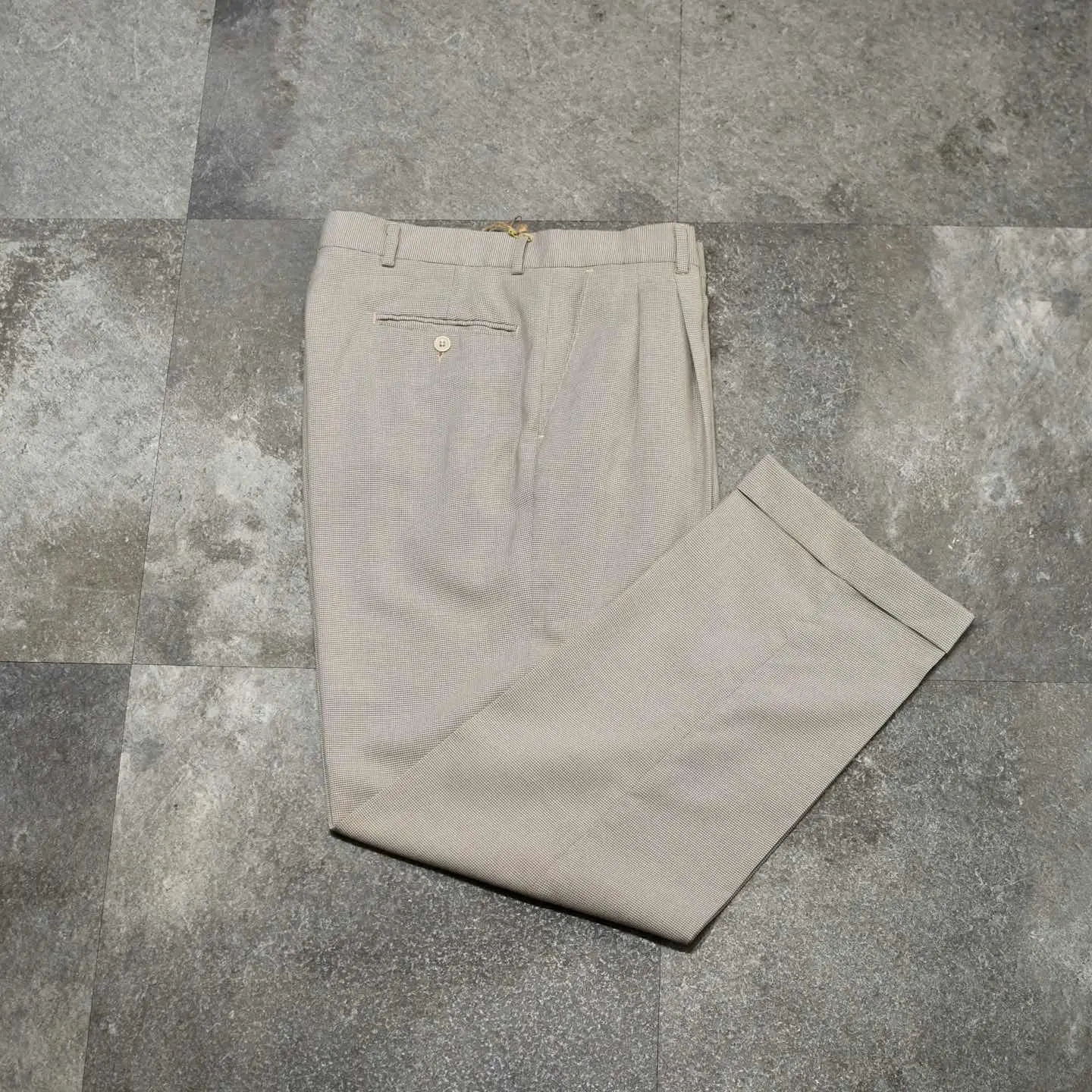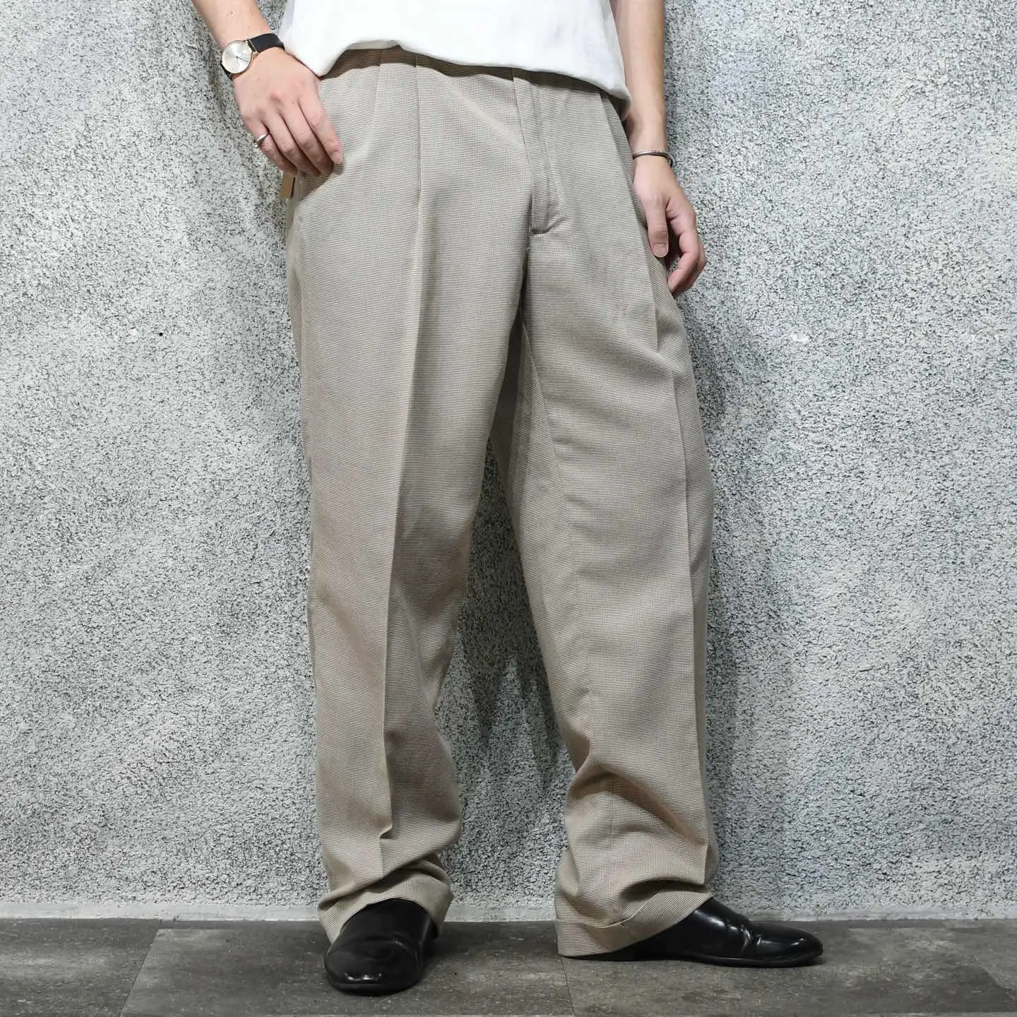 SIZE:W34・L32 ウエスト86cm 総丈108cm 股下79cm わたり39.5cm 裾幅24cm fabric/poly・rayon 着用画像 177cm/64kg スーツやジャケット、スラックスなど、 クラシックなスタイルを得意とする、 イタリアのメンズウェアブランド”PROFILO” ベージュをベースとした色使いにブラウン、 そして深緑の2色を取り入れた千鳥格子柄。 大人びた雰囲気を纏いつつ、そんな色使いや ワイドなシルエットでスタイリングに 遊び心が乗る一本です。 レーヨンを含んだ柔らかい生地感も◎ ※裾上げ等のレングス直しにつきましては、 購入前に、必ずご連絡お願い致します。 ※撮影状況により、実物と多少色が異なる 場合がございます。 ※古着を取り扱っているため、気づかない汚れや ほつれがある場合がございます。 ※サイズは着用感で選んでおり、 表記サイズではございません。 表記サイズは説明欄の最初に記載しております。 old vintage ヴィンテージ used 80's 90's アメリカ古着 ユーロ古着 メンズ レディース POLO RALPH LAUREN Eddie Bauer OLD GAP Eddie Bauer LANDS' END ランズエンド LLBean エルエルビーン エディーバウアー ラルフローレン ブルックスブラザーズ Brooks Brothers チェック柄 ワイドパンツ などがお好きな方 #vintage #オーバーサイズ #old #used #90s #80s #古着 #ヴィンテージ #LLBean #エルエルビーン #EddieBauer #oldgap #LANDSEND #NAUTICA #ラルフローレン #POLORALPHLAUREN #ブルックスブラザーズ #BrooksBrothers #千鳥格子 #チェックパンツ #スラックス #タックパンツ #ワイドパンツ