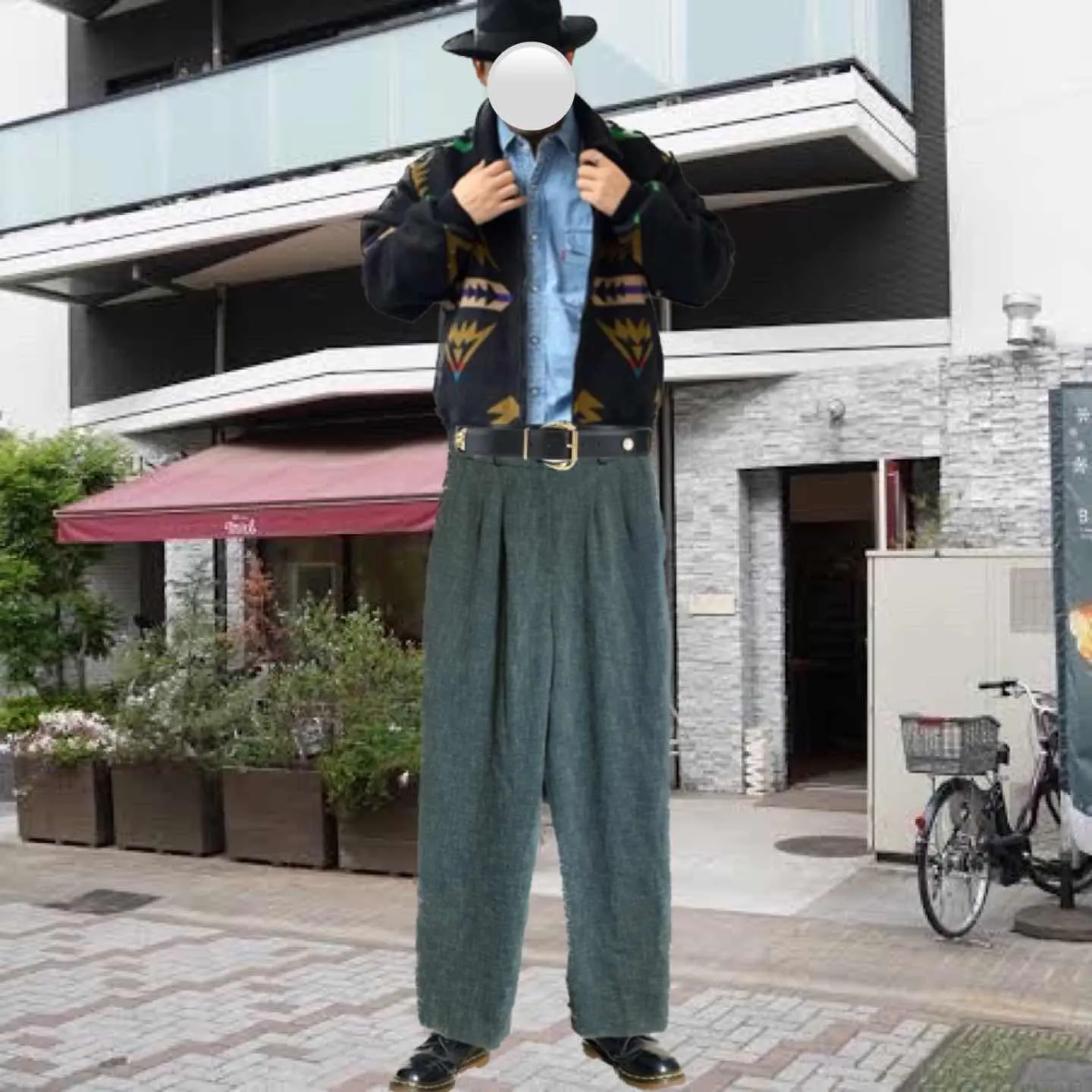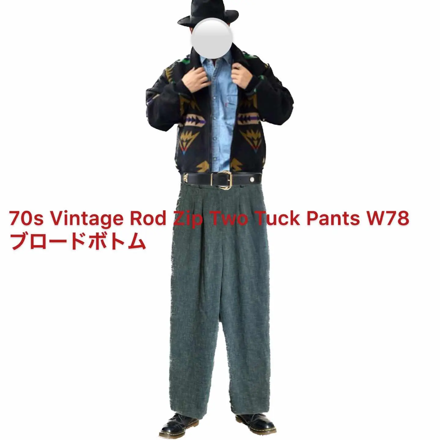 ■70s Vintage Rod Zip Two Tuck Pants W78 ブロードボトム 70年代のヴィンテージアイテム、Rod Zip Two Tuck Pantsが到着しました!このパンツは、まさに当時のスタイルを象徴する一品。個性的なデザインと機能性を兼ね備えたアイテムで、あなたのコレクションに加える価値ありです! 70年代のヴィンテージは、その独自の魅力によって高い人気を誇ります。特にこの商品は、オリジナリティあふれるシルエットが特徴。素材感は他に類を見ないほどクオリティが高く職人が関わったのが、一目でわかります!! One of a Kindと言っていいでしょう この年代のヴィンテージには、コーディネートの選択肢が数々ありますが、 今回は超高級ブロード素材、また美しいシルエットに、中綿なし、スカジャンに、Tシャツで 決めてみました、今から破壊力ある、コーデです^_^ ▷color◁ ヘザー系高級で、色味が、難しいんで、接写のせました、確認ください、また、素材の高級さも確認下さい^_^、 ※お使いのブラウザにより色が変わってみえる場合あります ▷size◁ 平置き片面採寸【㎝表記】 表記sizeMくらい?? 【※ウエストのみ、メジャーで一周採寸】 ウエスト78 股上38 股下70 腿渡り幅34 裾幅23大人気ゴールデンラインの70年代の アメカジトラッドのシルエットとなります モデル170㎝/普通体型、30インチジャストな体型、参考に ▷material◁ ブロード 動き易いのに 密度が、かなり高く独特の柄になる、年中いける シワにつよい、最高素材、 ▷condition◁ 良好 ※入念にチェックは、しておりますが、vintage/usedの特性ご理解下さい #70年ヴィンテージ #ヴィンテージスラックス #棒ジップ #激レア古着 #高級ヴィンテージ #東洋 #スカジャン