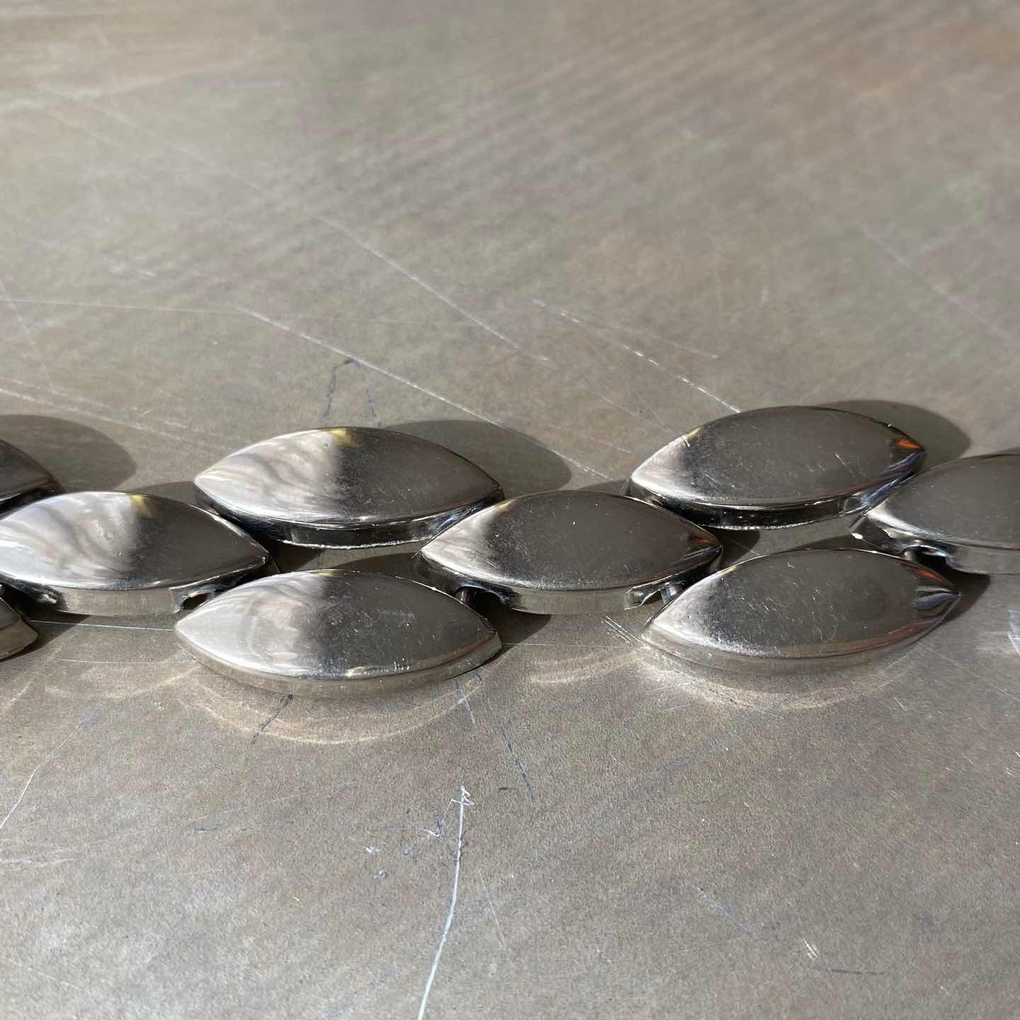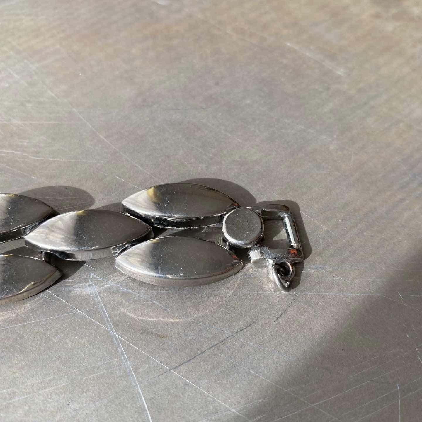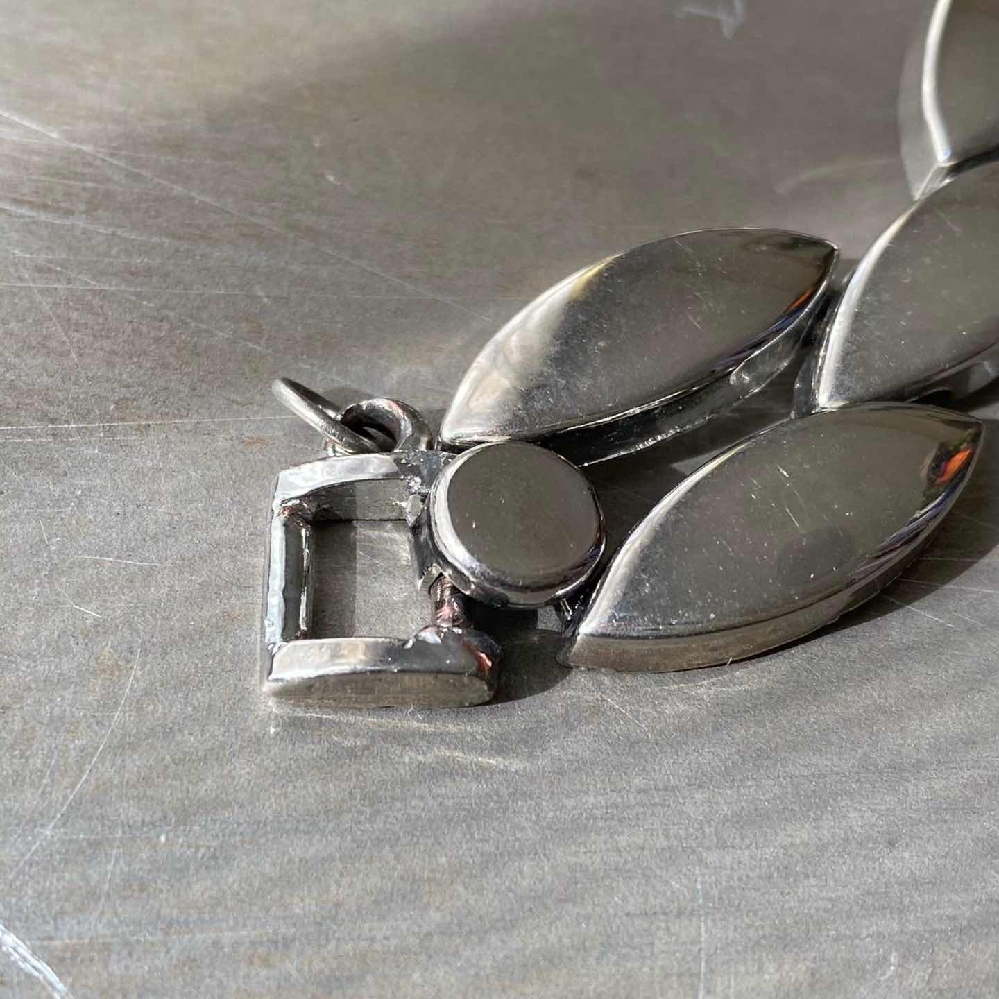 マーキス型のチェーンがお洒落なUSAヴィンテージブレスレット。重厚感のあるしっかりとした作りでレトロな雰囲気のセーフティーチェーンも魅力的。細身の方におすすめのサイズ感です。古着など様々なスタイルに合わせていただけます。 □Materials メタル(シルバーメッキ) □Size 全長 約15.5㎝ 幅 約2㎝ 厚み 約5㎜ セーフティーチェーン 約7.5㎝ 36g □Condition【C】 画像の通り留め具部分にメッキ剥がれやパーツにスレ等使用感がみられます。古びた雰囲気がお好きな方にオススメです。中古品であることをご理解のうえお買い求めください。 【S】未使用 【A】未使用に近い 【B】やや使用感あり 【C】使用感あり Item No.3340