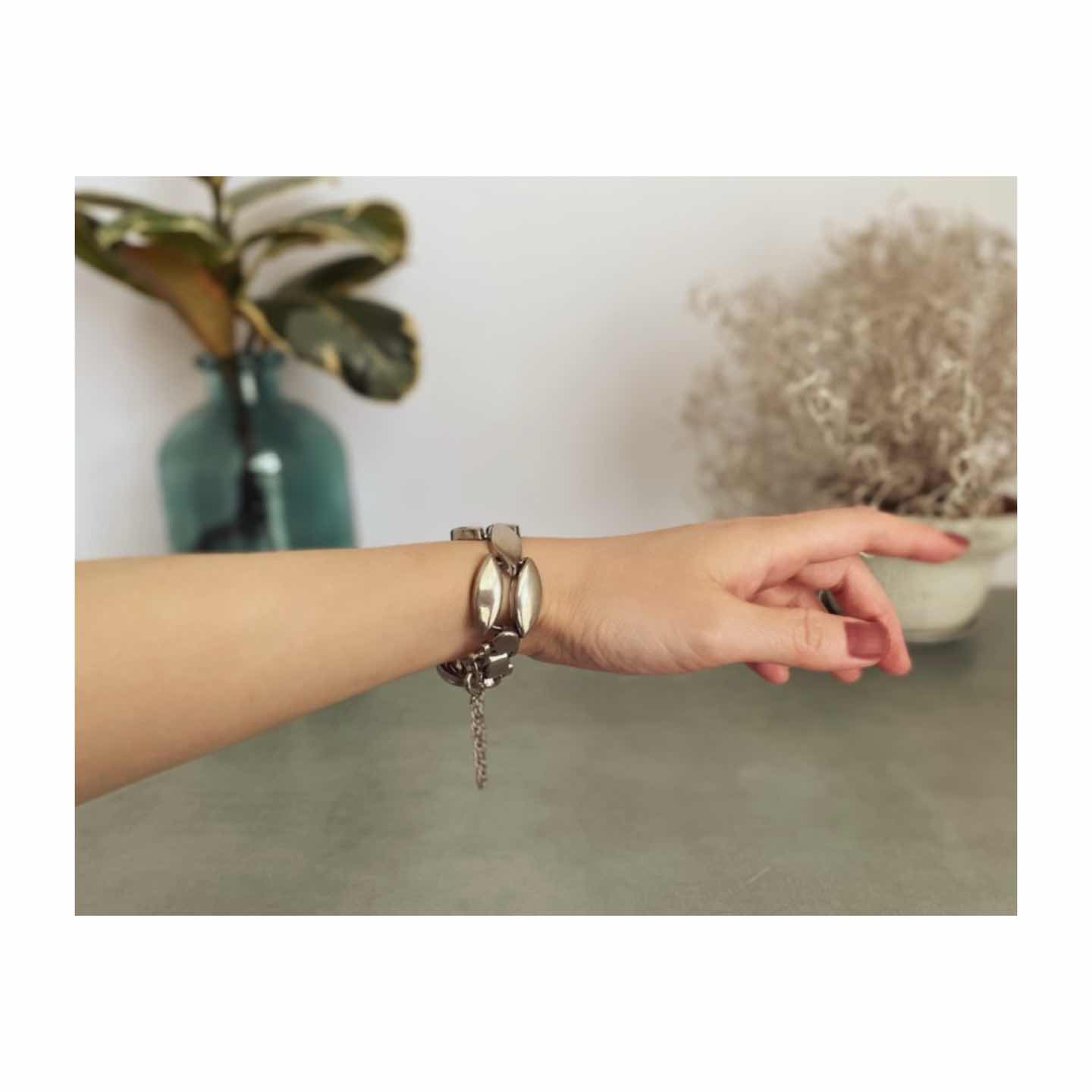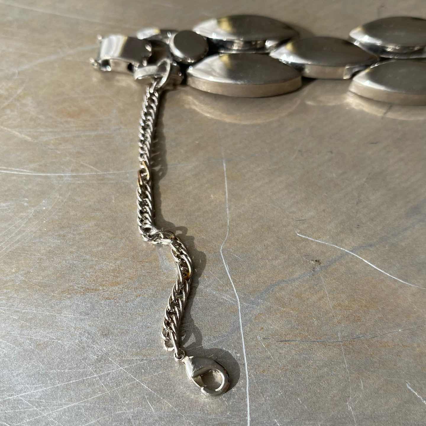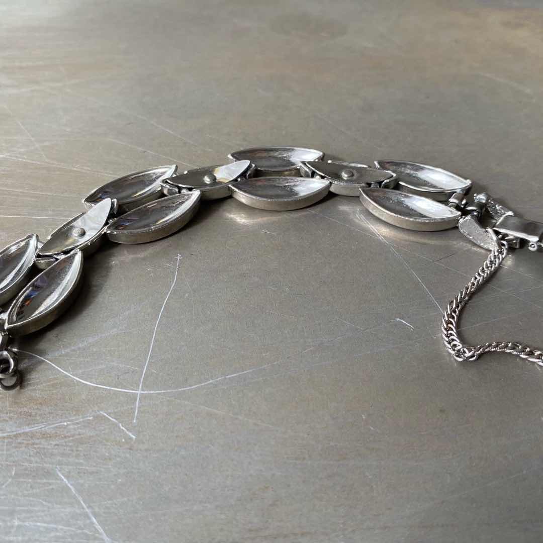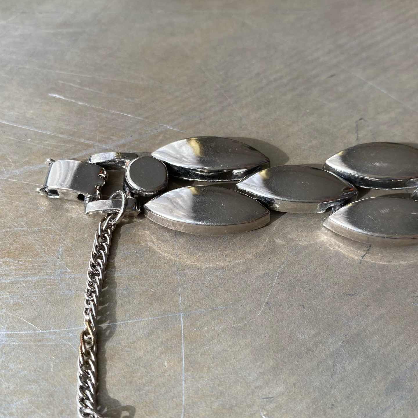 マーキス型のチェーンがお洒落なUSAヴィンテージブレスレット。重厚感のあるしっかりとした作りでレトロな雰囲気のセーフティーチェーンも魅力的。細身の方におすすめのサイズ感です。古着など様々なスタイルに合わせていただけます。 □Materials メタル(シルバーメッキ) □Size 全長 約15.5㎝ 幅 約2㎝ 厚み 約5㎜ セーフティーチェーン 約7.5㎝ 36g □Condition【C】 画像の通り留め具部分にメッキ剥がれやパーツにスレ等使用感がみられます。古びた雰囲気がお好きな方にオススメです。中古品であることをご理解のうえお買い求めください。 【S】未使用 【A】未使用に近い 【B】やや使用感あり 【C】使用感あり Item No.3340