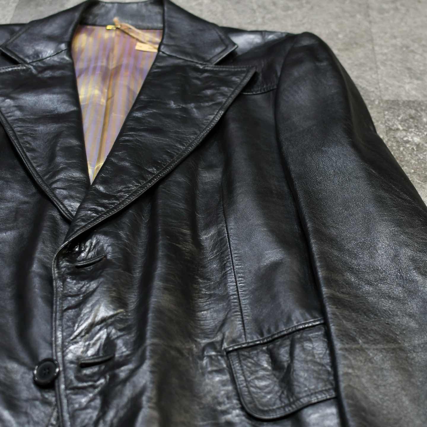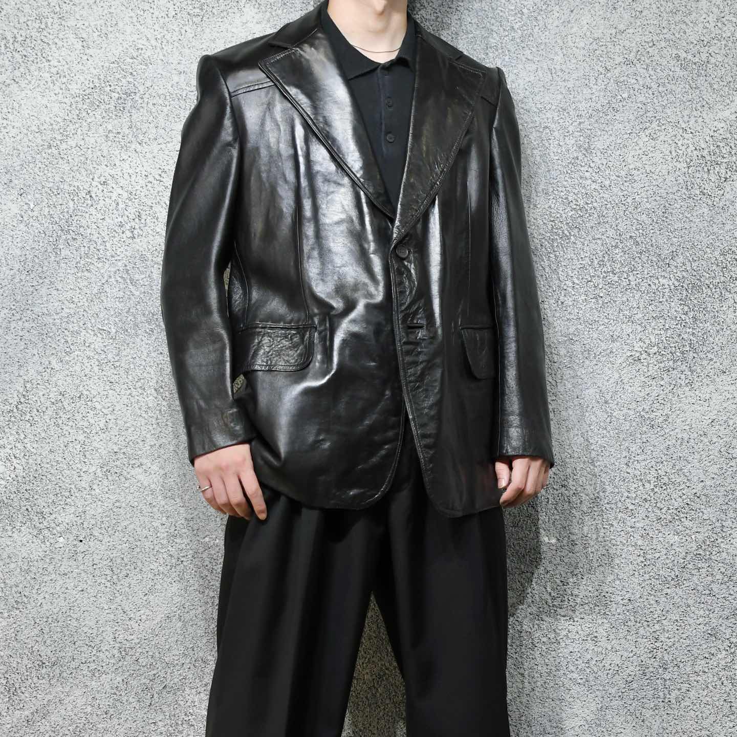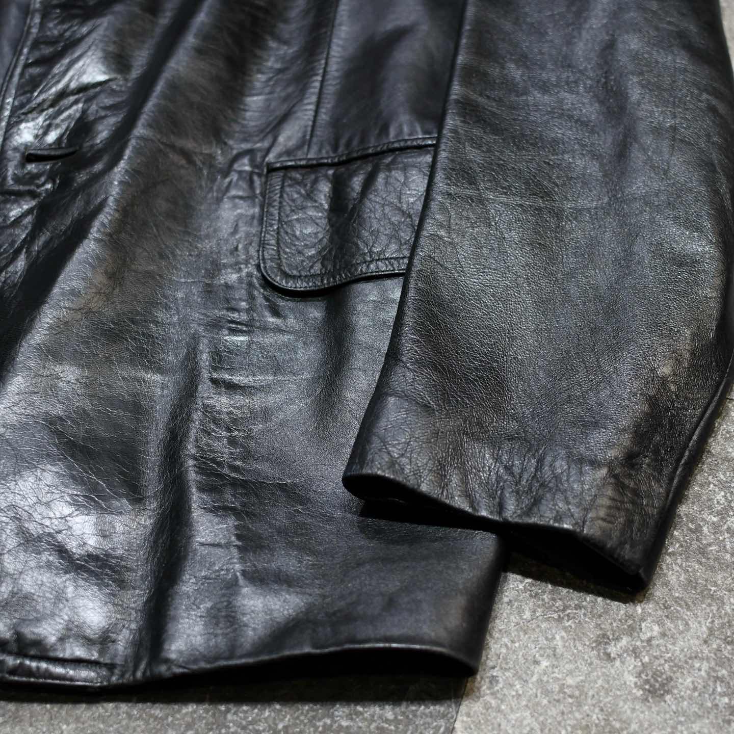 SIZE:- 着丈80cm 肩幅48cm 身幅60cm 袖丈62cm fabric/leather 着用画像 177cm/64kg 1930年代から存在するアメリカの老舗ブランド "Botany 500" クラシックなスーツやジャケットを 多く手掛けており、その中でも今回はレザーを 使った贅沢な逸品。 古い個体でありながら状態も良く、 そして比較的重くないところも◎ 裏地の高級感溢れるストライプ柄や、サイズ感、 最高でした。 デイリーユースというよりか、一張羅として着たい 1着です。 ※撮影状況により、実物と多少色が異なる場合が ございます。 ※古着を取り扱っているため、気づかない汚れや ほつれ等がある場合がございます。 ※サイズは着用感で選んでおり、 表記サイズではございません。 表記サイズは説明欄の最初に記載しております。 古着 オーバーサイズ old vintage ヴィンテージ used 80's 90's アメリカ古着 ユーロ古着 POLO RALPH LAUREN Eddie Bauer OLD GAP LANDS' END ランズエンド LLBean エルエルビーン オールドギャップ エディーバウアー ラルフローレン ブルックスブラザーズ Brooks Brothers ブラック 黒 50's などがお好きな方 #vintage #オーバーサイズ #old #used #90s #80s #古着 #ヴィンテージ #アメリカ古着 #ユーロ古着 #LLBean #エルエルビーン #EddieBauer #エディーバウアー #oldgap #オールドギャップ #LANDSEND #ランズエンド #NAUTICA #ノーティカ #ラルフローレン #POLORALPHLAUREN #ブルックスブラザーズ #BrooksBrothers #レザージャケット #テーラードジャケット #50s #60s #ジャケット