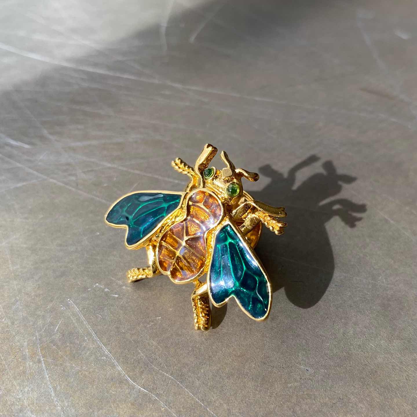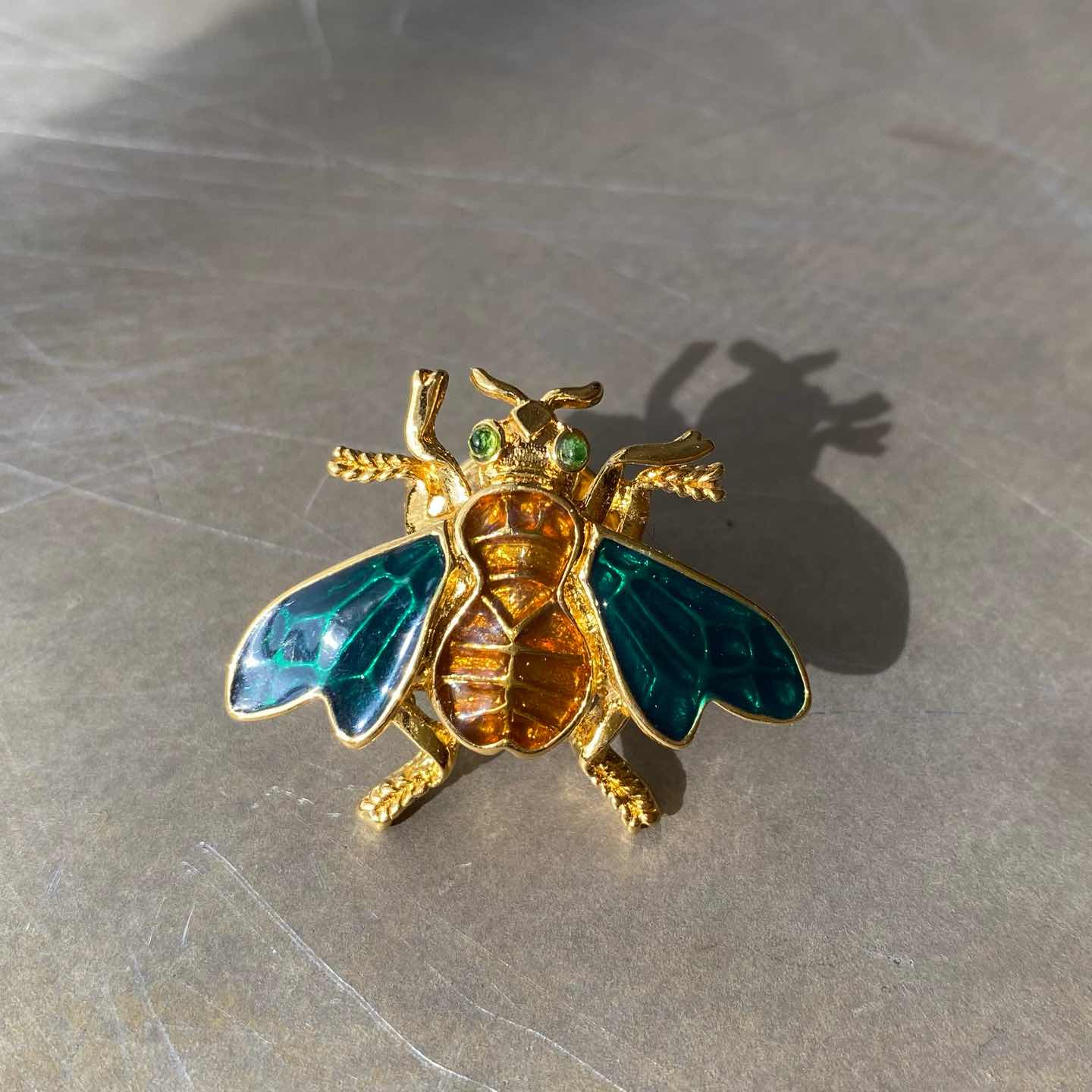 1910年に設立されたジュエリーブランド「TRIFARI」のUSAヴィンテージブローチです。レトロ可愛い蜂モチーフが美しいエナメルで繊細に表現されています。蜂は「繁栄」「幸運」の象徴とされるラッキーモチーフです。ジャケットや帽子などにさりげなく付けてもお洒落な雰囲気にしてくれます。 □Materials メタル(ゴールドメッキ)、イミテーションストーン、エナメル □Size 約H2.5×W3.1㎝ 7g □Brand TRIFARI (刻印入り) □Condition【A】 使用感の少ない良好な状態です。中古品であることをご理解のうえお買い求めください。ご購入前に必ずショッピングガイドのご確認をお願いいたします。 【S】未使用 【A】未使用に近い 【B】やや使用感あり 【C】使用感あり Item No.3385