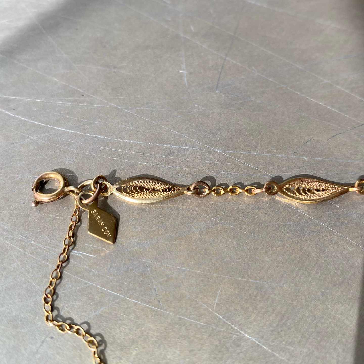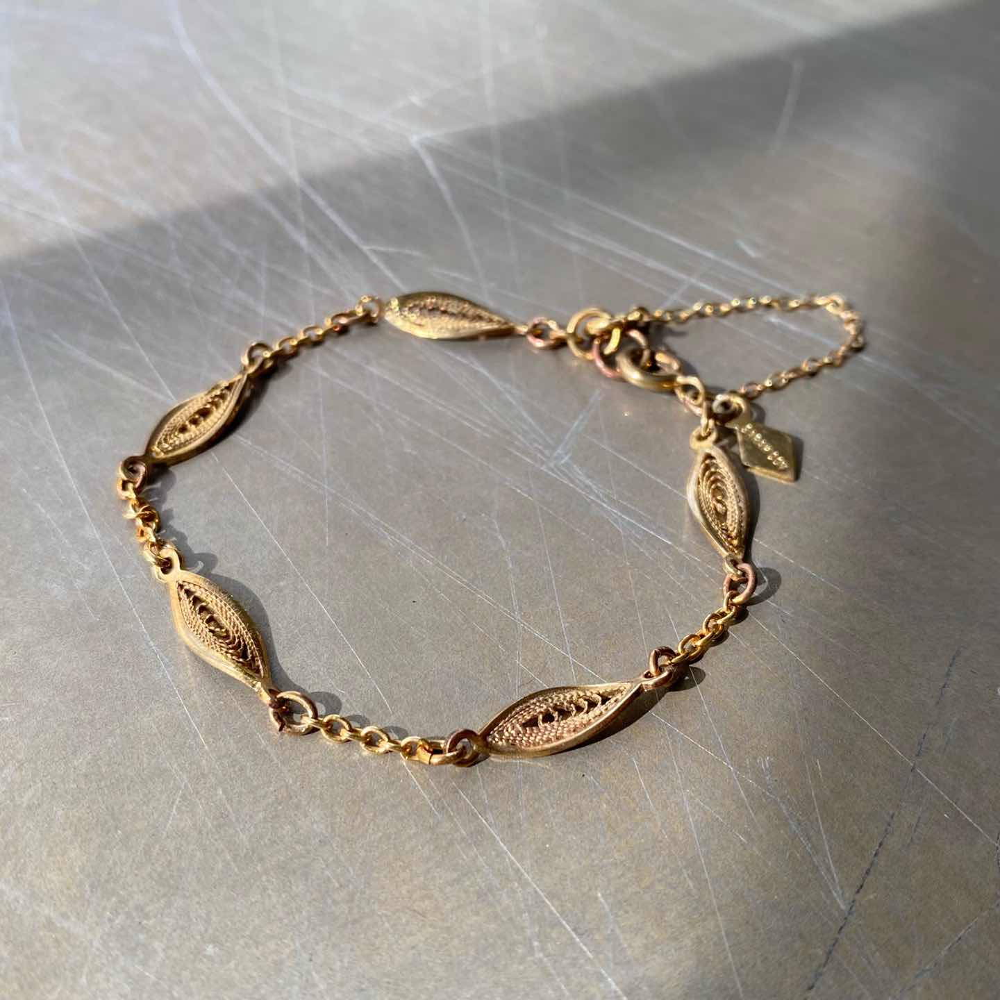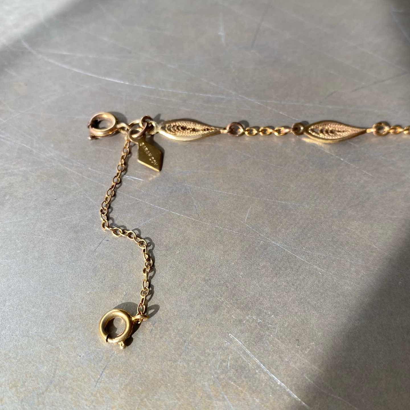 1949年に設立されたジュエリーブランド『Sarah Coventry』のUSAヴィンテージブレスレット。繊細な線材で作られたフィリグラーナモチーフが魅力的。揺らめくセーフティーチェーンもクラシカルな雰囲気。軽やかで身につけやすくスタイリングを問わずお使いいただけます。 □Materials メタル(ゴールドメッキ) □Size 全長 約17.5㎝ セーフティーチェーン約6㎝ 幅 約6㎜ 3g □Brand Sarah Coventry(刻印入り) □Condition【B】 画像の通り経年による変色がみられます。全体的には良好なヴィンテージコンディションです。中古品であることをご理解のうえお買い求めください。ご購入前に必ずショッピングガイドのご確認をお願いいたします。 【S】未使用 【A】未使用に近い 【B】やや使用感あり 【C】使用感あり Item No.3383