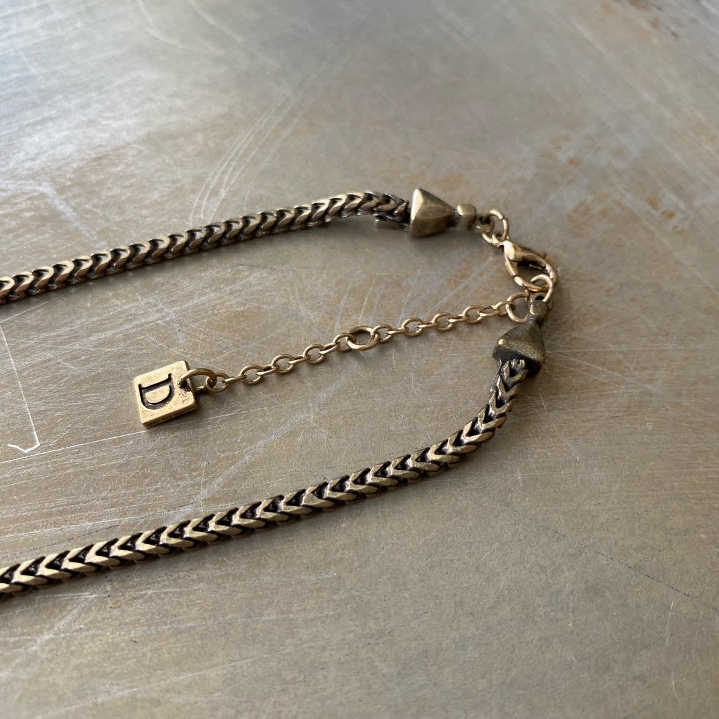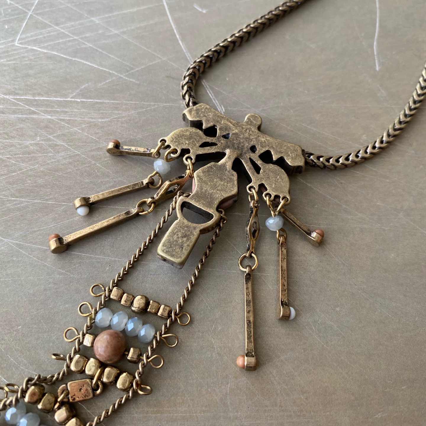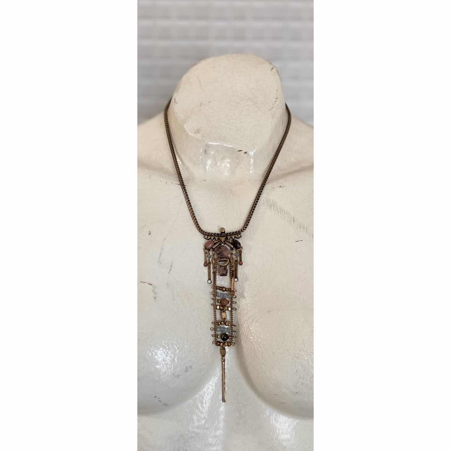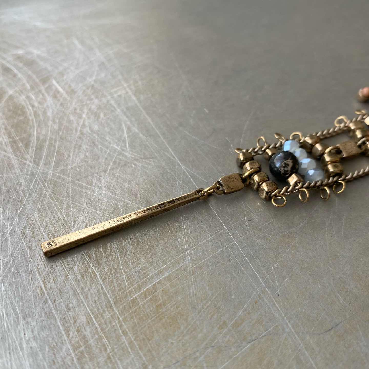 エスニックな雰囲気のUSAユーズドネックレス。ビーズやメタルパーツが複雑に組み上げられたユニークなデザイン。肌馴染みの良い落ち着いた色合いのビーズも魅力的。存在感がありスタイリングにお洒落な雰囲気をプラスしてくれます。 □Materials メタル(アンティークゴールドメッキ)、イミテーションストーン、ガラスビーズ □Size 全長 約51㎝+アジャスター4㎝ 装飾部分 長さ約14㎝ 37g □Condition【A】 使用感の少ない良好な状態です。中古品であることをご理解のうえお買い求めください。ご購入前に必ずショッピングガイドのご確認をお願いいたします。 【S】未使用 【A】未使用に近い 【B】やや使用感あり 【C】使用感あり Item No.3388