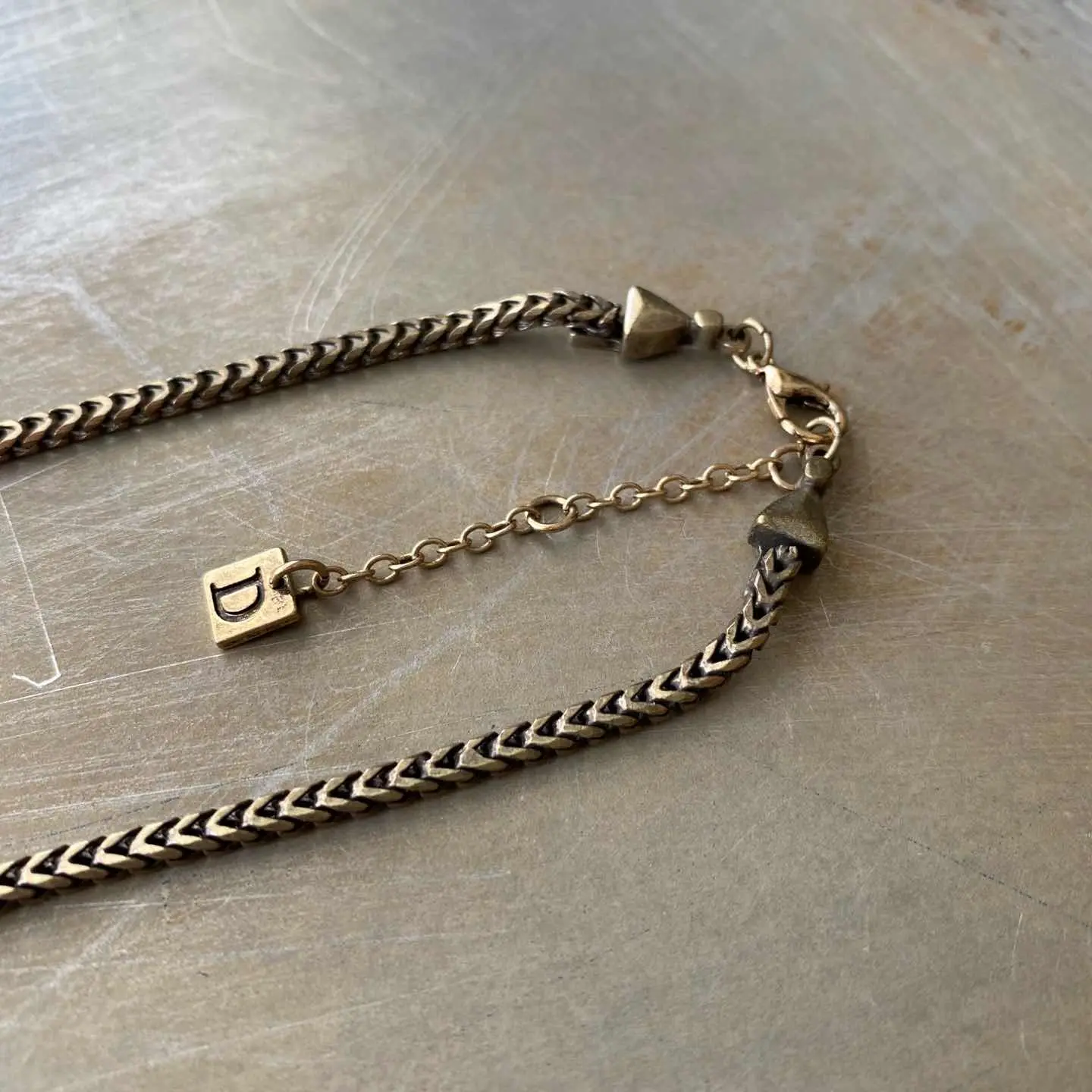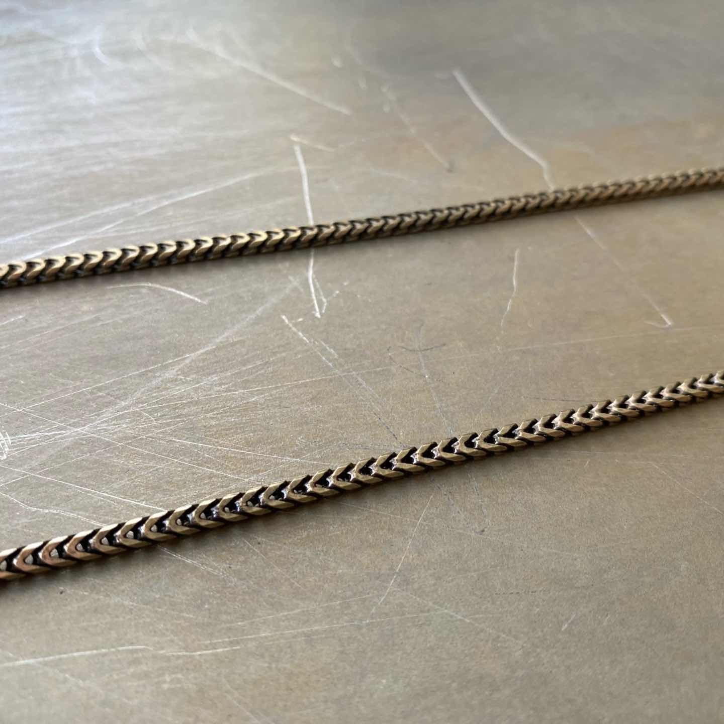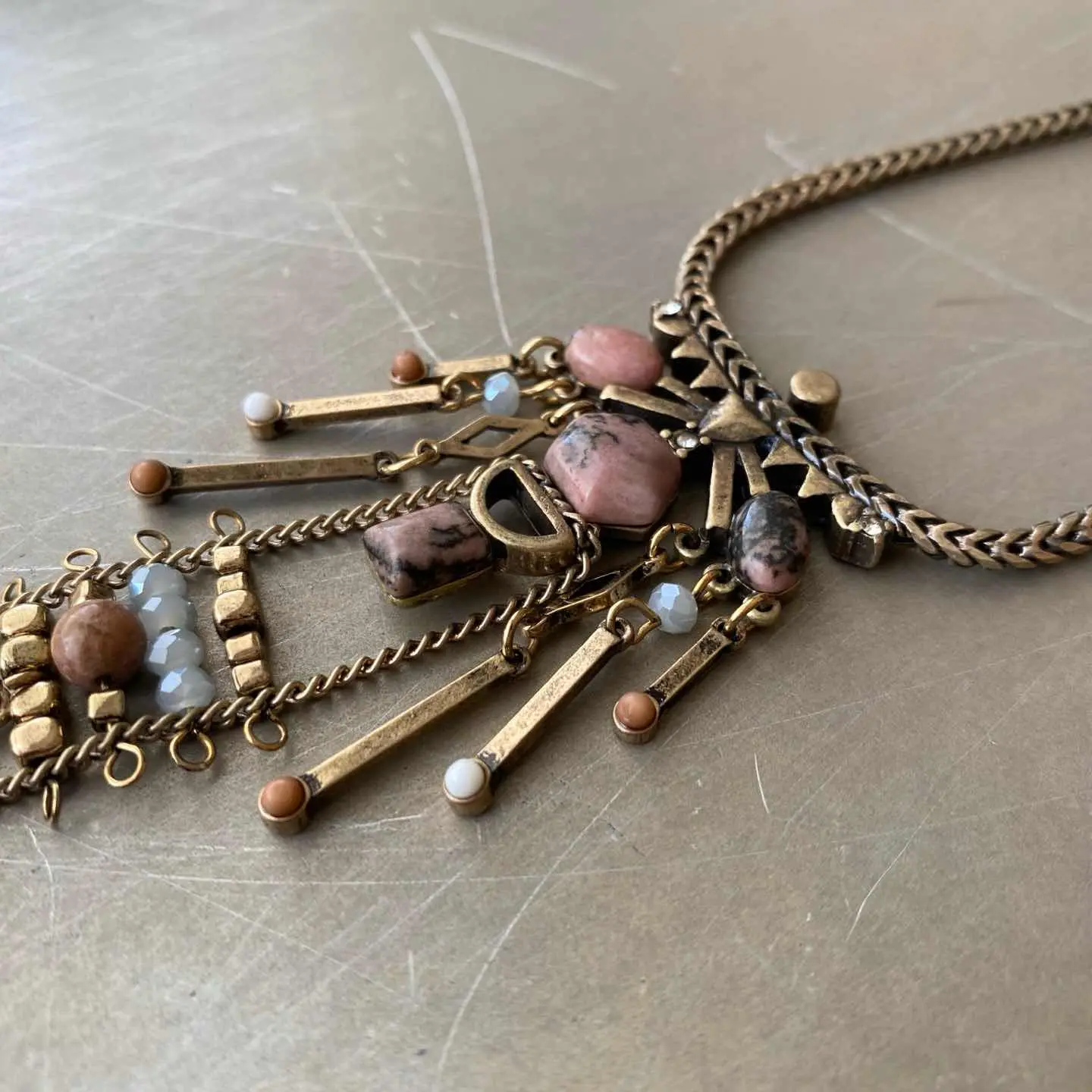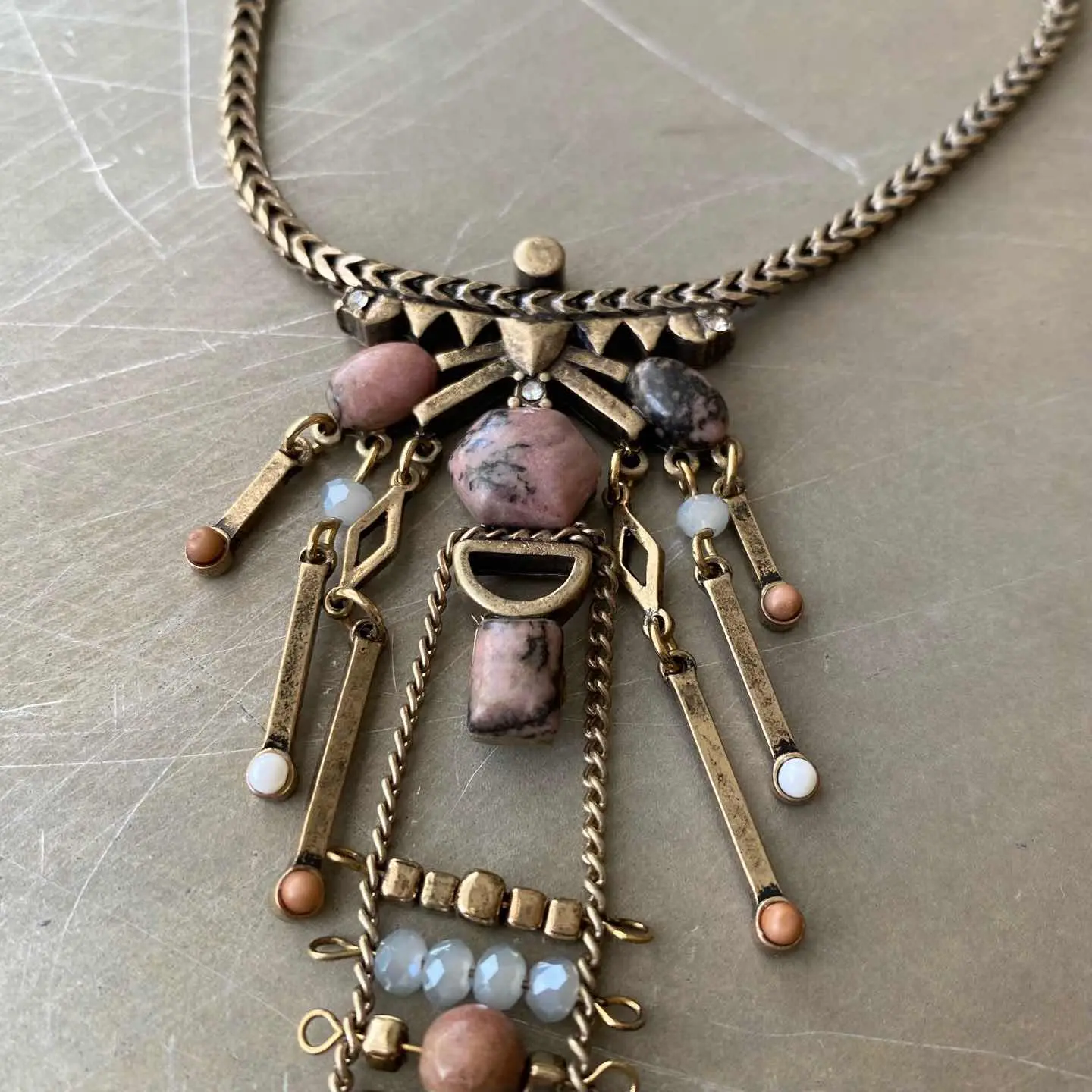 エスニックな雰囲気のUSAユーズドネックレス。ビーズやメタルパーツが複雑に組み上げられたユニークなデザイン。肌馴染みの良い落ち着いた色合いのビーズも魅力的。存在感がありスタイリングにお洒落な雰囲気をプラスしてくれます。 □Materials メタル(アンティークゴールドメッキ)、イミテーションストーン、ガラスビーズ □Size 全長 約51㎝+アジャスター4㎝ 装飾部分 長さ約14㎝ 37g □Condition【A】 使用感の少ない良好な状態です。中古品であることをご理解のうえお買い求めください。ご購入前に必ずショッピングガイドのご確認をお願いいたします。 【S】未使用 【A】未使用に近い 【B】やや使用感あり 【C】使用感あり Item No.3388