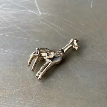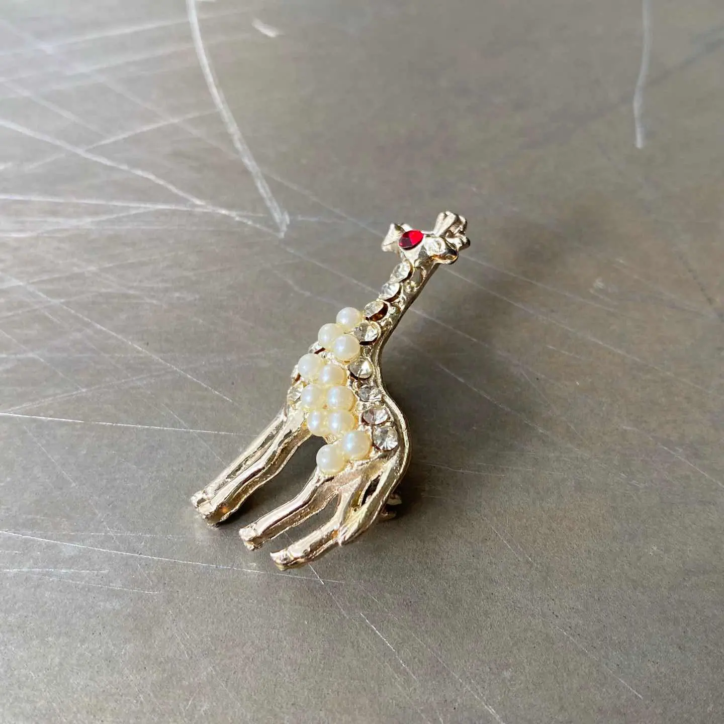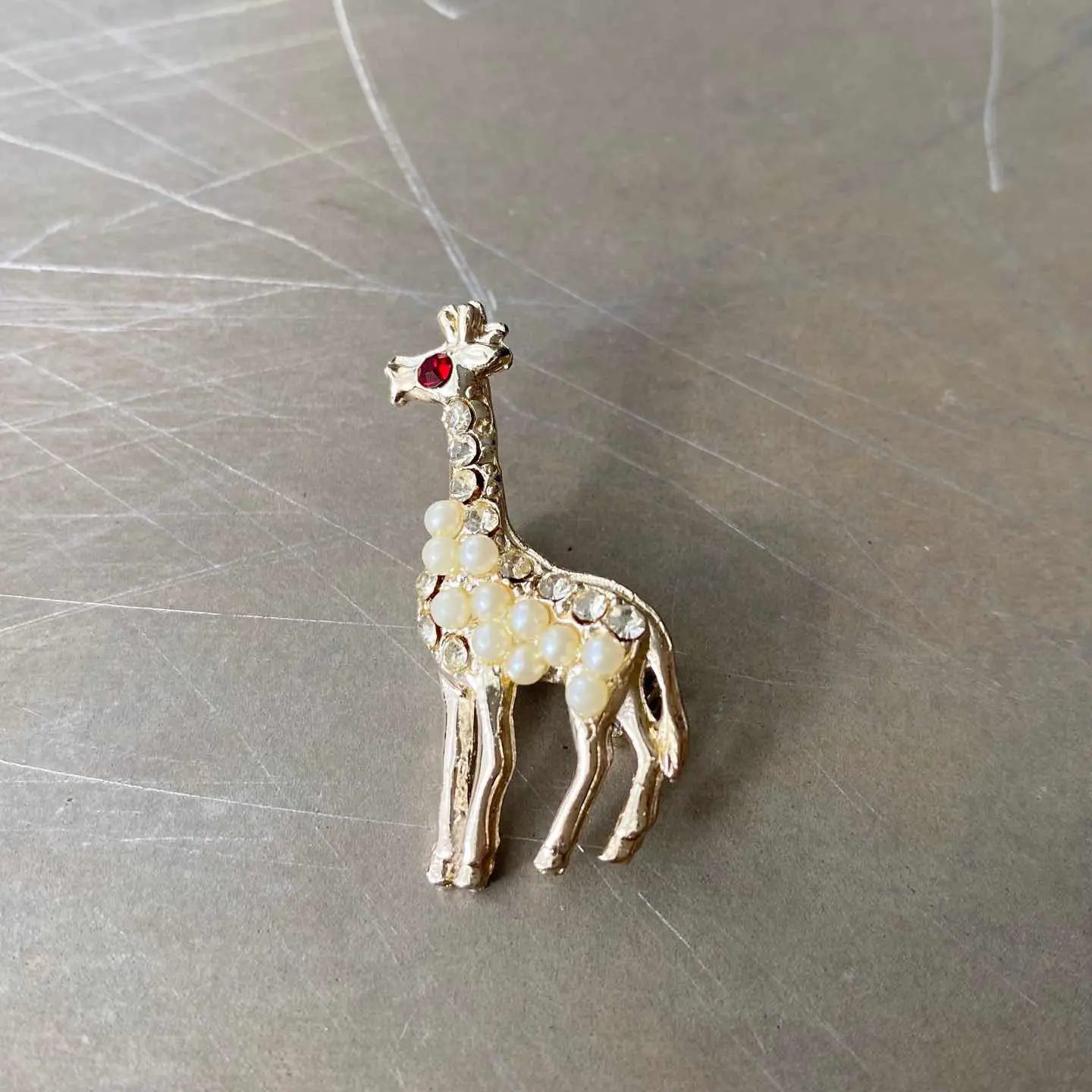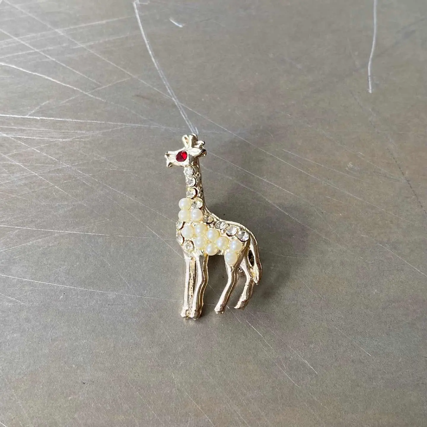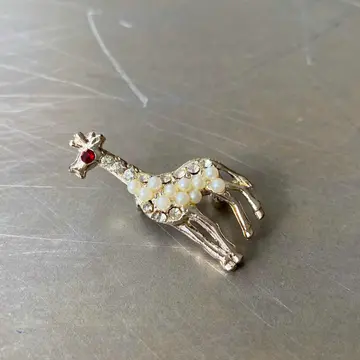 レトロ可愛いキリンのUSAヴィンテージブローチ。パールとビジューで華やかに装飾され、瞳は赤いクリスタルがキラキラと輝きます。小ぶりで身につけやすいサイズ感です。 □Materials メタル(シルバーメッキ)、ガラスストーン、イミテーションパール □Size 約H3.7×W2㎝ 6g □Condition【C】 所々にメッキ剥がれがみられます。古びた雰囲気がお好きな方におすすめです。中古品であることをご理解のうえお買い求めください。ご購入前にショッピングガイドのご確認をお願いいたします。 【S】未使用 【A】未使用に近い 【B】やや使用感あり 【C】使用感あり Item No.3403