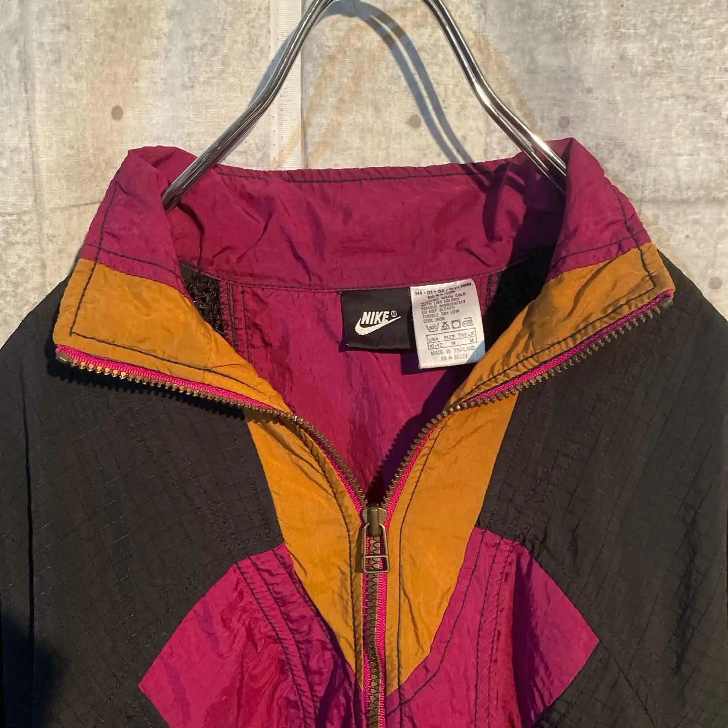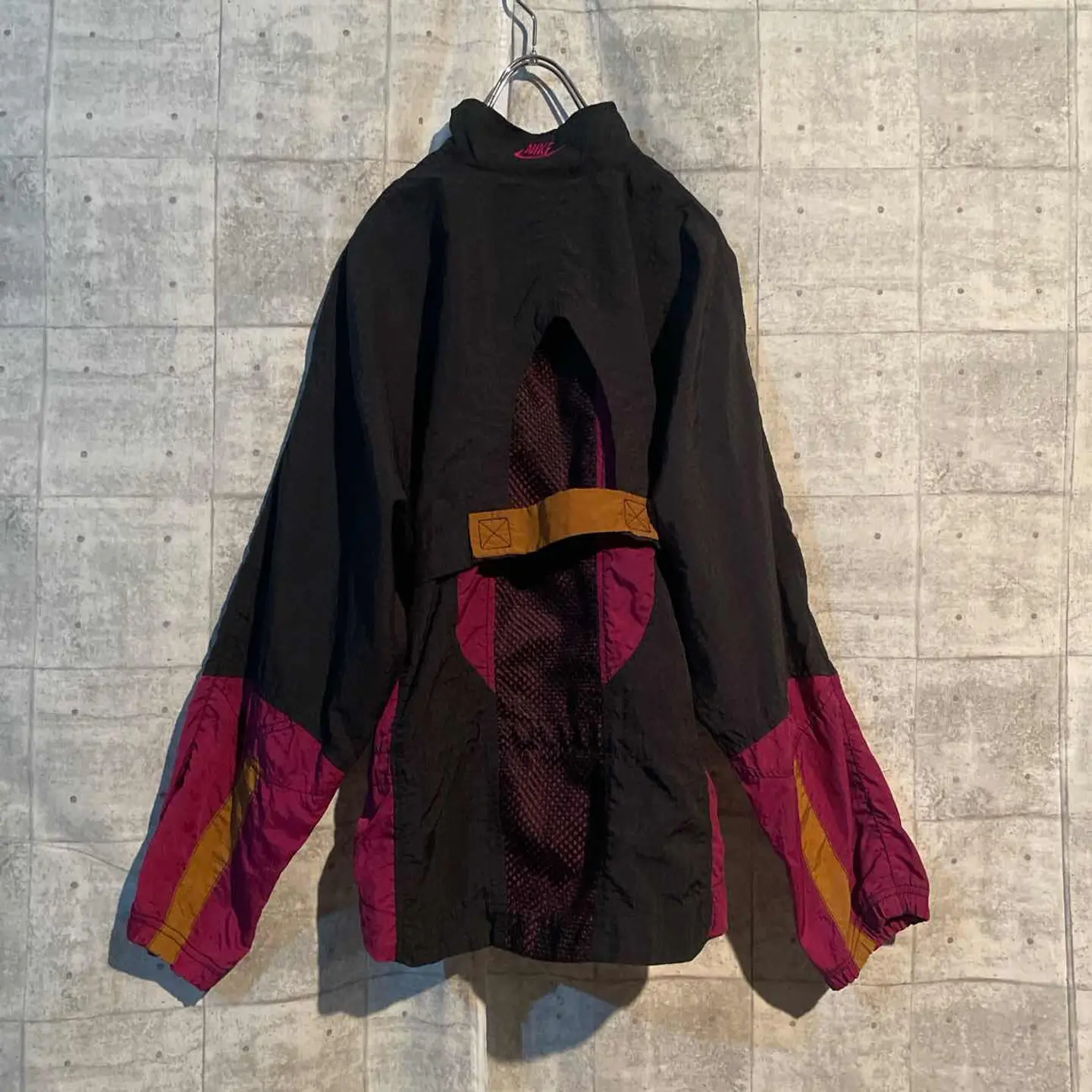 【商品説明】 90’s NIKE / ナイキ ヴィンテージ ナイロンジャケット ブラック×ワインレッド×マスタードの3トーン切り替えが抜群に洒落た一枚。 ゆるく羽織るだけで雰囲気が出る、90年代らしいシルエットと配色が魅力です。 胸元の立体的なパターンや、両サイドのジップポケット、ドローコード付きの裾など、ディテールも◎ ストリート・スポーツMIX・古着コーデどれにもハマる万能アイテム。 インナーにスウェットやパーカーを合わせて、秋冬〜春先まで長く使えます。 一点モノ感のあるカラーリングなので、古着好きにはたまらないデザインです。