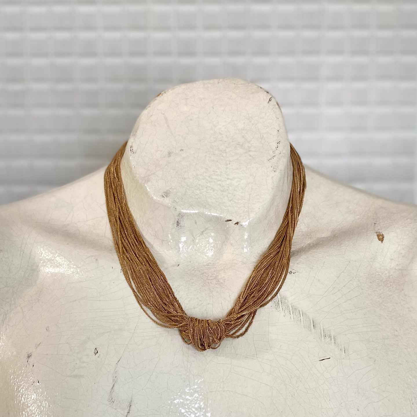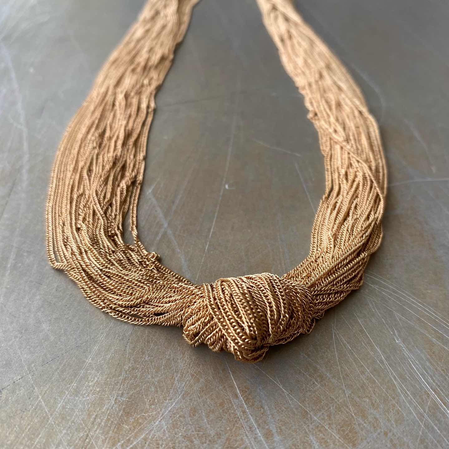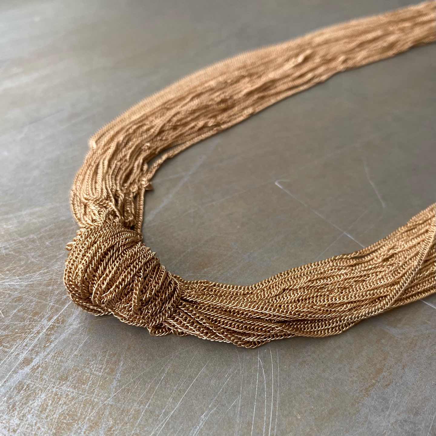 個性的な雰囲気のUSAヴィンテージネックレス。幾重にも重なる繊細なチェーンの中央に結び目が作られたありそうで無いデザイン。存在感がありスタイリングにお洒落な雰囲気をプラスしてくれます。 □Materials メタル(ゴールドメッキ) □Size 全長 約49.5㎝ 幅 約1.3〜1.8㎝ 55g □Condition【B】 金具部分にやや変色がみられますが、全体的には良好なヴィンテージコンディションです。中古品であることをご理解のうえお買い求めください。ご購入前に必ずショッピングガイドのご確認をお願いいたします。 【S】未使用 【A】未使用に近い 【B】やや使用感あり 【C】使用感あり Item No.3405
