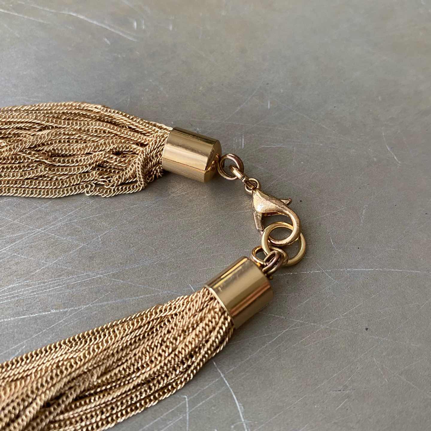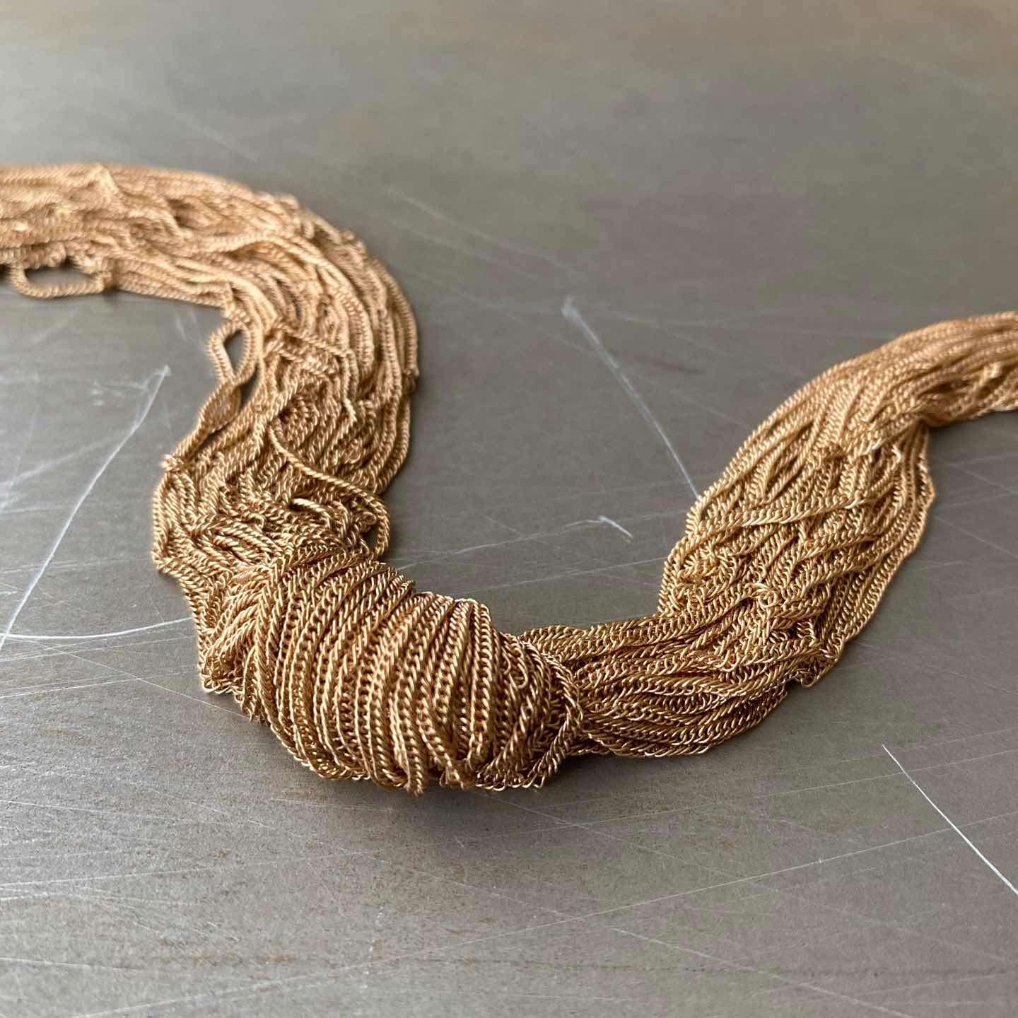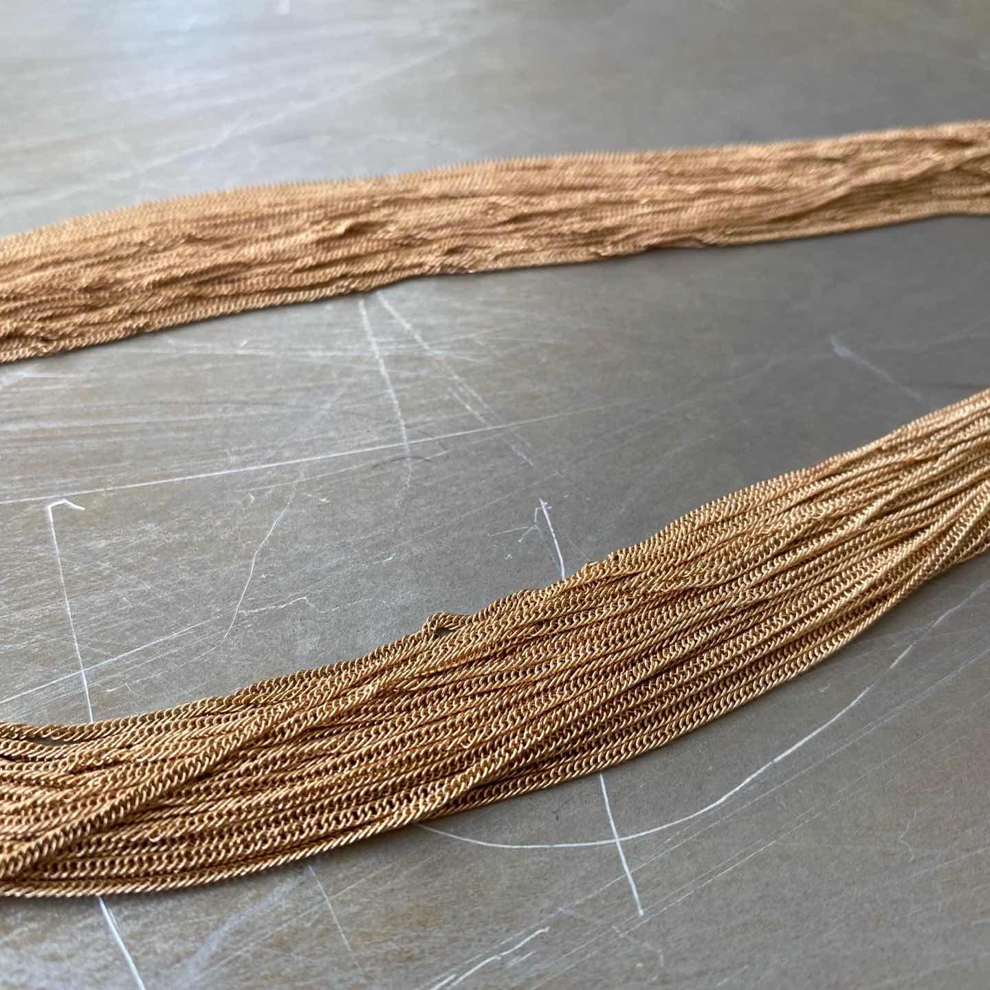 個性的な雰囲気のUSAヴィンテージネックレス。幾重にも重なる繊細なチェーンの中央に結び目が作られたありそうで無いデザイン。存在感がありスタイリングにお洒落な雰囲気をプラスしてくれます。 □Materials メタル(ゴールドメッキ) □Size 全長 約49.5㎝ 幅 約1.3〜1.8㎝ 55g □Condition【B】 金具部分にやや変色がみられますが、全体的には良好なヴィンテージコンディションです。中古品であることをご理解のうえお買い求めください。ご購入前に必ずショッピングガイドのご確認をお願いいたします。 【S】未使用 【A】未使用に近い 【B】やや使用感あり 【C】使用感あり Item No.3405