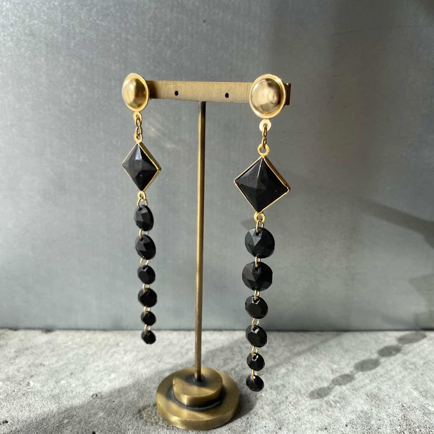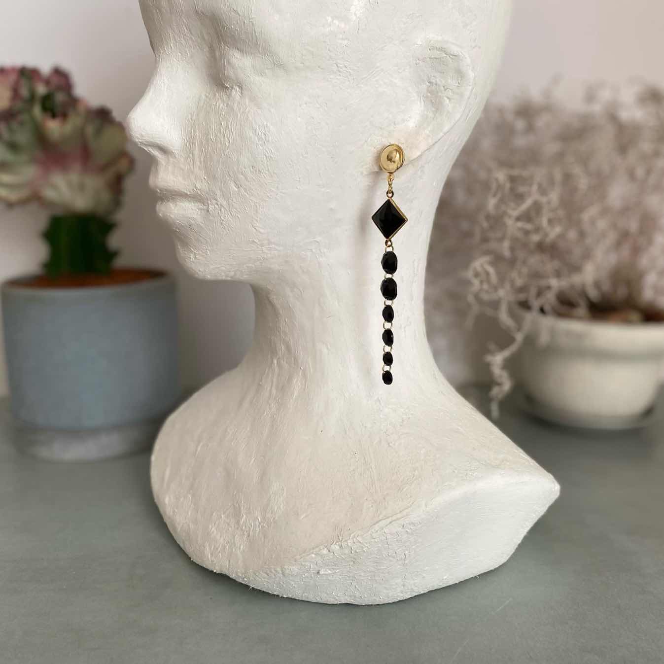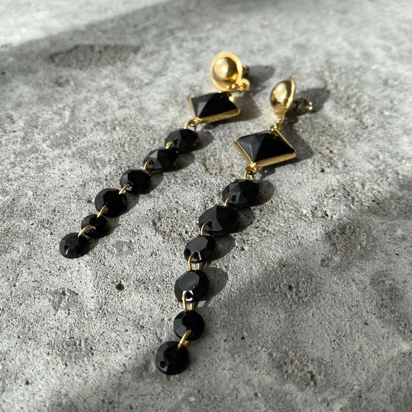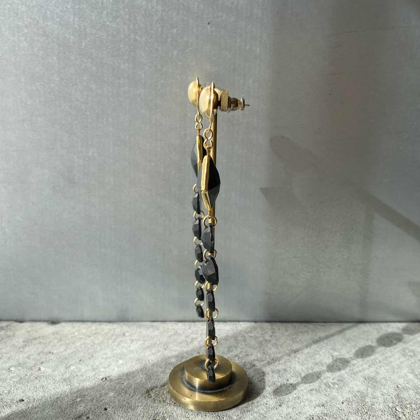スタイリッシュな雰囲気のUSAヴィンテージピアス。ブラックカラーのストーンが揺らめくお洒落なデザイン。軽やかな着け心地のロングタイプでスタイリングのアクセントにおすすめです。 □Materials メタル(ゴールドメッキ)、プラスチックストーン □Size 約H10×W1.8㎝ 7g □Condition【B】 キャッチ部分やメタルパーツに変色がみられます。全体的には目立ったダメージの無い良好な状態です。中古品であることをご理解のうえお買い求めください。ご購入前に必ずショッピングガイドのご確認をお願いいたします。 【S】未使用 【A】未使用に近い 【B】やや使用感あり 【C】使用感あり Item No.3409