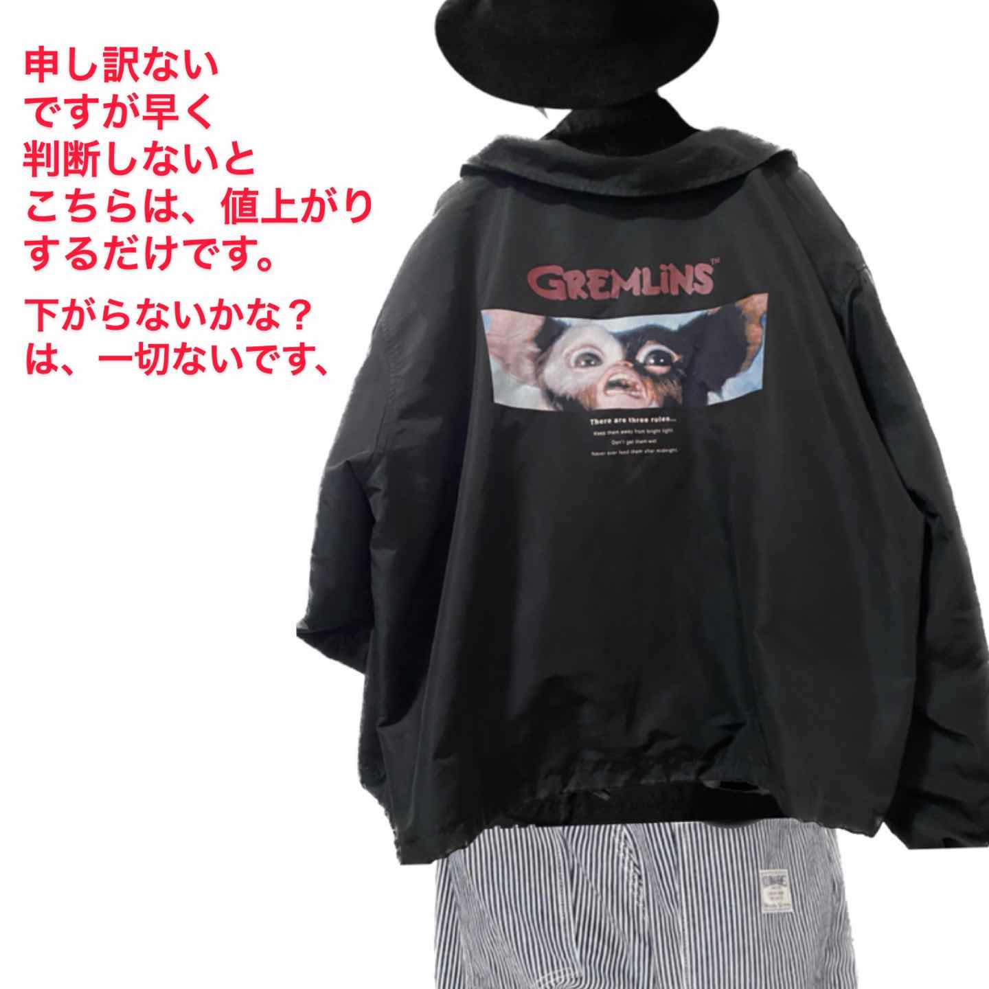 00s 激レアGREMLINS gizmo official coach jacket 確実にプレミア商品です。見つけた人は 強運の持ち主とすらいえます ファーストタイプの2000年に出たギズモ、大人気のキャラクターですね、グレムリン、 申し訳ないですが、結構厳しく書いてますが、全て事実です。 買うなら今しかないと言うのはお伝えしときます、下がるんじゃないの?は、ごめんなさい。シネマ系や、バンドTシャツの大人気シリーズにはありません、 上がる一方なのは間違いないです。 オフィシャルじゃないのは確かにやすくありますが、質も何もかもが違います。 それでもいいなら 自由ですが、正直、、、、いやお金出すなら本物買おうよって思います。 ゆったりサイズでバックで一撃で見せる。さらに胸は 刺繍、かっこよすぎますし、 マナーない方には、一切譲る気がないので、ドライで申し訳ないですが、お早めに判断ください。引き下げたら次回出す時はプレミア指定が入った時です、 確実に手が届かない値段になりますし、それでも多分買う人は買うと思いますので ご判断が速い人が、確実に得をする商品 お宝とか、プレミアと言っているものは 本当に急いだほうがいいです。早い者勝ちでよろしくお願いします。 ▷color◁ ブラック ※ブラウザで異なる場合ありますがかなり実物には、近づけてます、 ▷size◁ 平置き片面採寸【㎝表記】 表記size M表記だが、XLは、絶対ある、 ↓80s意識したシルエットっすね、 着丈/68 身幅/70 肩幅/62 袖丈 /65 DSは袖はハンガー採寸 ※多少の誤差は理解下さい 170/Mジャスト体型の私が着て、✔️参考に ジャスト オーバーサイズ ビックサイズ✔️ 【素材】 ポリエステル、中綿なし、年中いける、 【状態】 良いです。クレーマーには、このお宝商品は、譲りたくもないし、正直、これに、クレームつけようがなく、上質なんで、つける方は、サイコか?とすら、思いますクレームつける方は、価値わからんの?なんで、譲りたくないです、