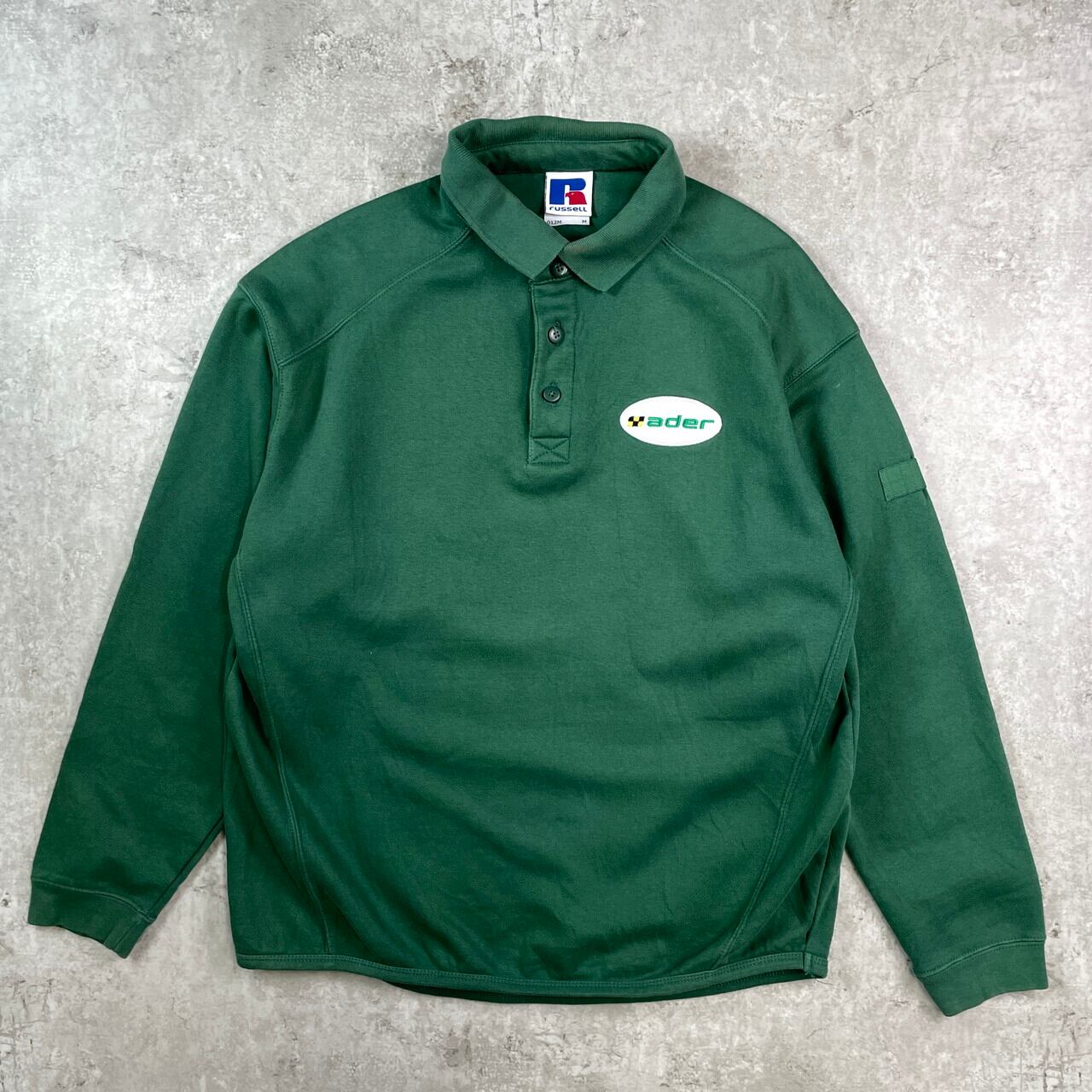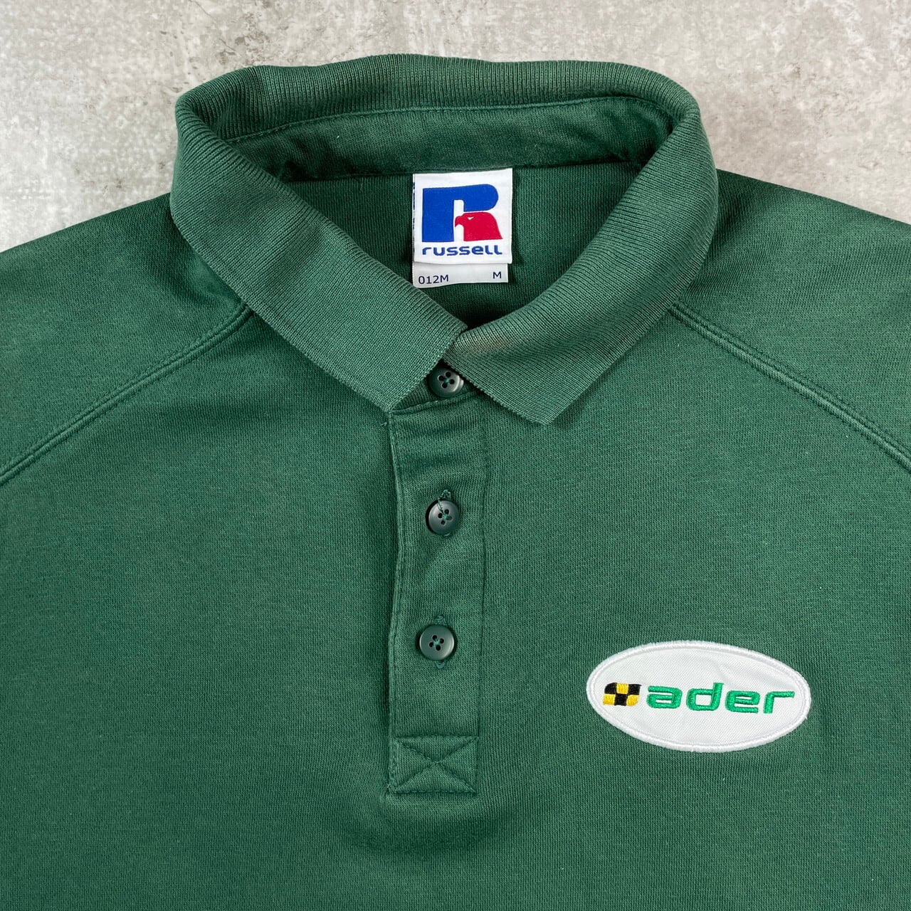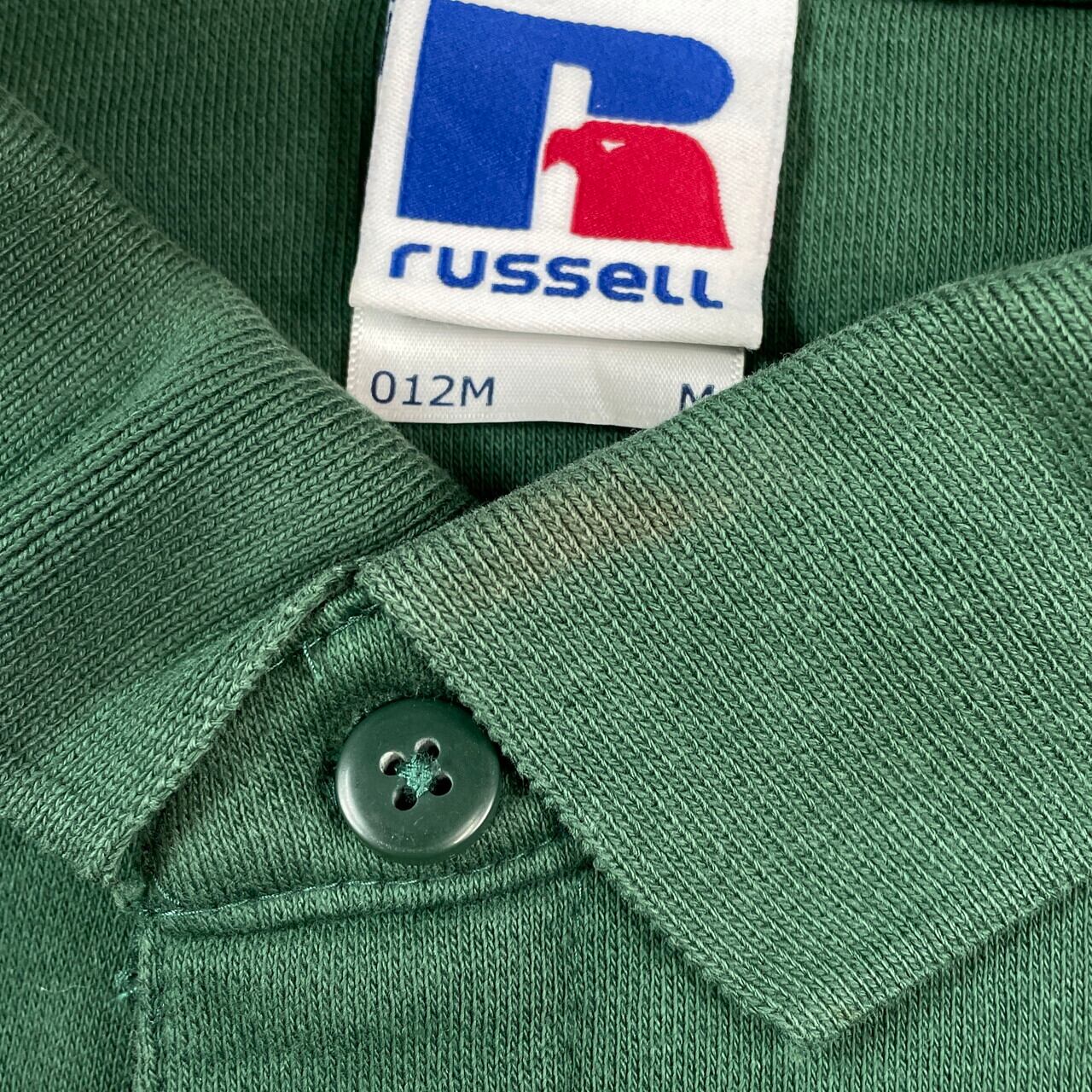 ■90年代 RUSSELL ユーロラッセル ワッペン付き スウェットポロシャツ メンズM 古着 90s ヴィンテージ VINTAGE トレーナー 緑【スウェット】/グリーン 【ブランド】RUSSELL ラッセル 【サイズ】表記 M ※計測値をご確認ください。 着丈…73 身幅…60 肩幅…55 袖丈…59 【生産国】パキスタン製 【素材】コットン80% ポリエステル20% 【状態】襟や袖に汚れ、袖に生地擦れがございます。 画像にてご確認ください。 【c251009017】 ※古着は洗濯、検品などのケアを行っております。(新品・デッドストックは洗濯していません。) ※モニターの発色により実物と異なる場合がございます。予めご了承ください。 ※ 海外直輸入USED品になります。