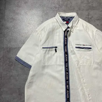 00s トミージーンズ 刺繍ロゴ ジップ付きポケット 半袖 リネンシャツ