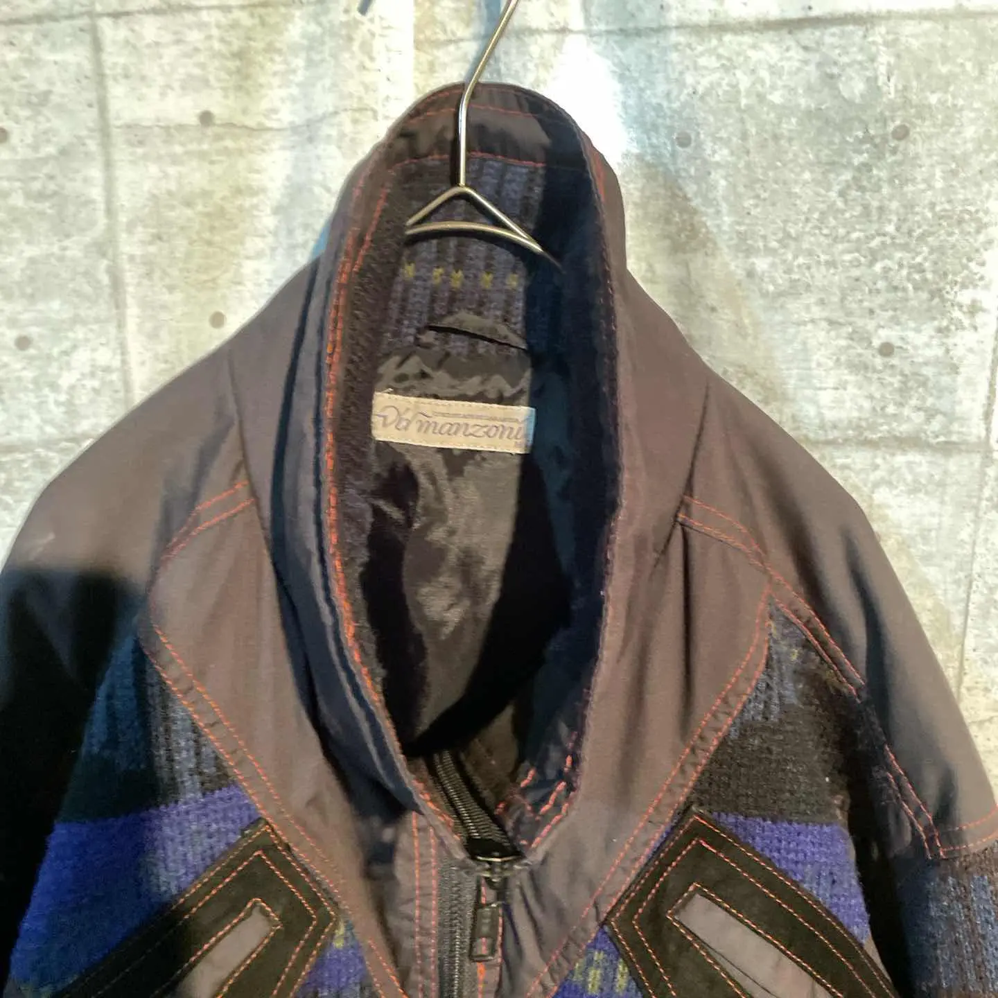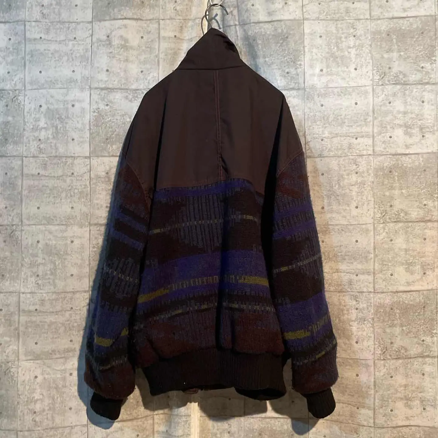 レトロな雰囲気漂う、ヴィンテージのミックスファブリックブルゾン。 ナイロン×ウールニット×スエードの異素材を組み合わせた独特のデザインが魅力です。 袖の編み柄やポケットまわりの切り替えなど、今のブランドでは再現が難しい凝ったディテール。 シルエットも程よくゆとりがあり、スウェットやパーカーの上からざっくり羽織るだけで雰囲気が出ます。 古着らしい“無骨さ”と“デザイン性”を両立した一着。 「人と被らない服が着たい」「シンプルなコーデに個性をプラスしたい」 そんな方におすすめです。 実際に手に取ると、素材の重厚感とディテールの完成度に驚くと思います。 一枚で主役になる存在感のあるヴィンテージブルゾンです。