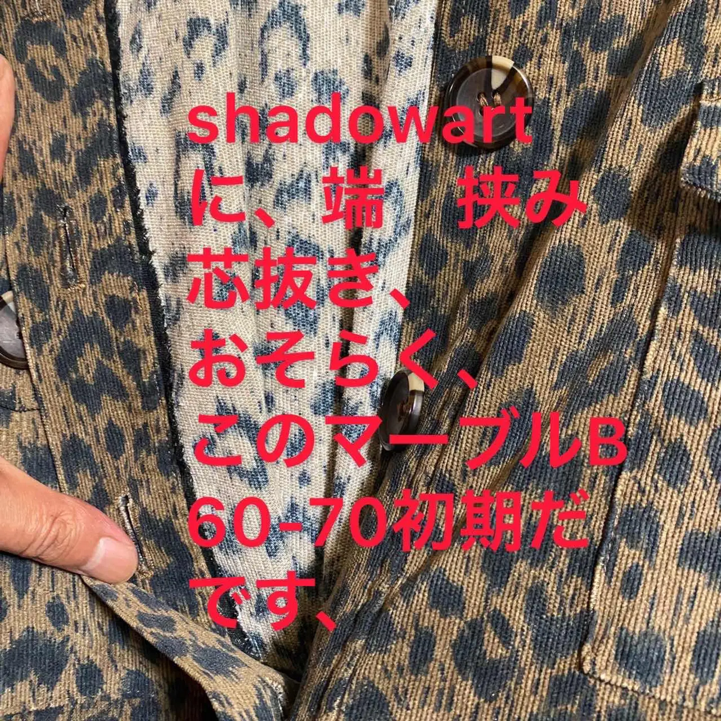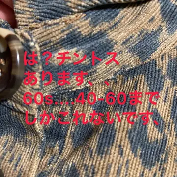 60s USA製 美品 チンストshadowart 4season jacket このジャケット、季節を問わず活躍するアイテムです!60年代のアメリカ製ということで、レトロな魅力がいっぱい。おしゃれと実用性を兼ね備えた一着、ぜひあなたのワードローブに加えてください。 スタイリッシュなデザインにこだわり、細部まで丁寧に仕上げられています。色合いやシルエットが絶妙で、どんなシーンでも着こなしが楽しめますよ。 今回は、ゆるコーデにしてますがお手持ちアイテムで。ばっちり決まります^_^ カジュアルなデニムから、きれいめなパンツまで幅広く対応し、着回し力も抜群です。 素材は高品質な素材を使用していて、 春夏はもちろん、肌寒い秋冬にも役立ちます。着用感の中にしっかりとした存在感を感じられる、まさに「一生モノ」のジャケットです。 ▷color◁ shadowアートレオパード、接近とはなれで、見た目かわる、UK発祥の、激レアアート ※ブラウザで異なる場合ありますがかなり実物には、近づけてます、 ▷size◁ 平置き片面採寸【㎝表記】 表記size XLです、 着丈/60 身幅/60 肩幅/62DS 袖丈/64↓ DSは袖はハンガー採寸 ※多少の誤差は理解下さい 170/Mジャスト体型の私が着て、✔️参考に ジャスト オーバーサイズ✔︎ ビックサイズ 【素材】 1mm圧年中活躍、また、テクスト縦閂、コーデュロイという、知識なさすぎる方の為に、正確に明記します、 柔らかい、シワならない、閂、おそらく混合綿にナイロン数%です、閂は、これ、いれないと出来ないので、 【状態】 新品同様奇跡すぎる!! 検品、洗濯、検品で、3回チェックして発送しますので、ご安心して、お買い求め下さい!! #豹柄ジャケット #レオパードジャケット #60年代アメリカ古着 #ヴィンテージ豹柄ジャケット #コーデュロイ #スリップノット