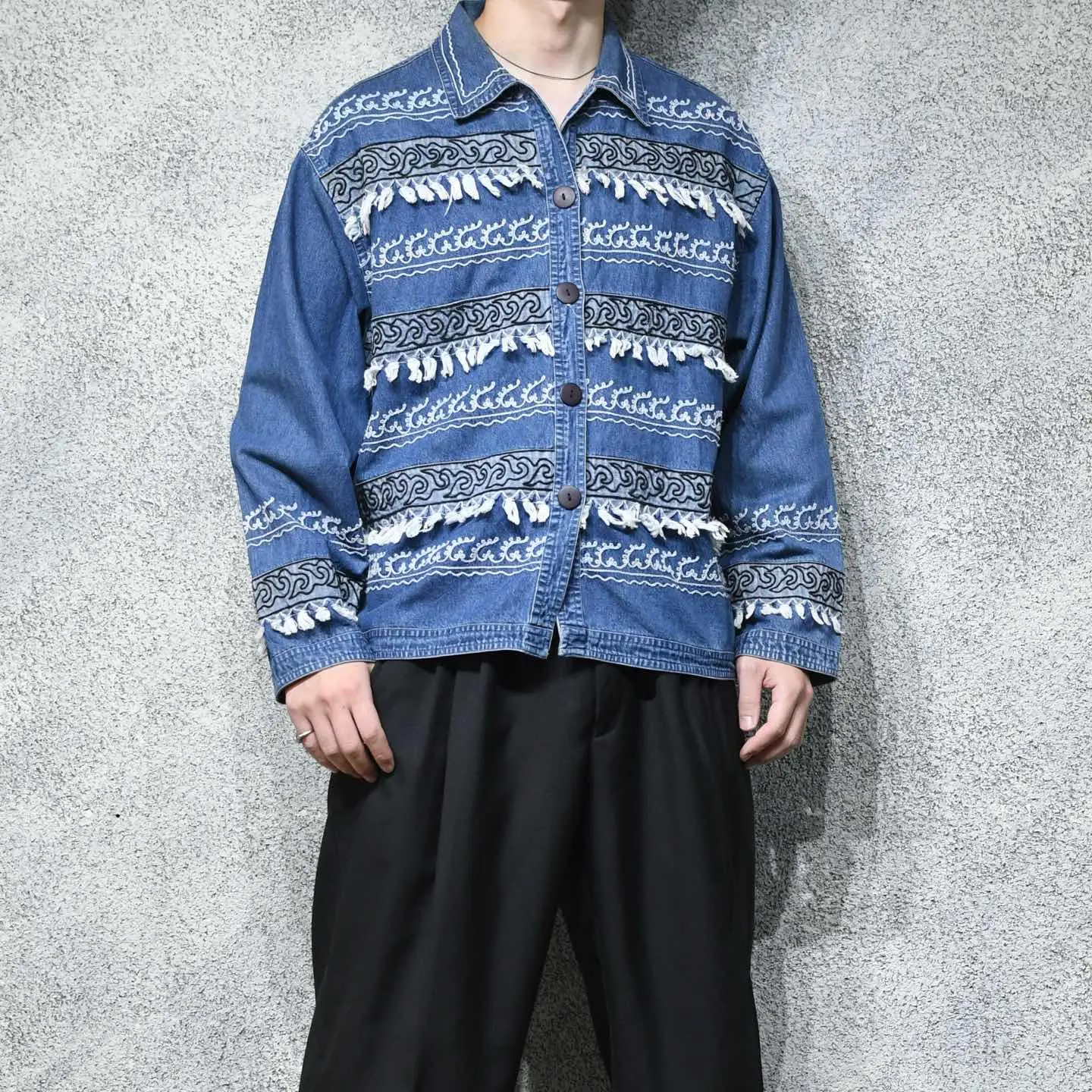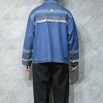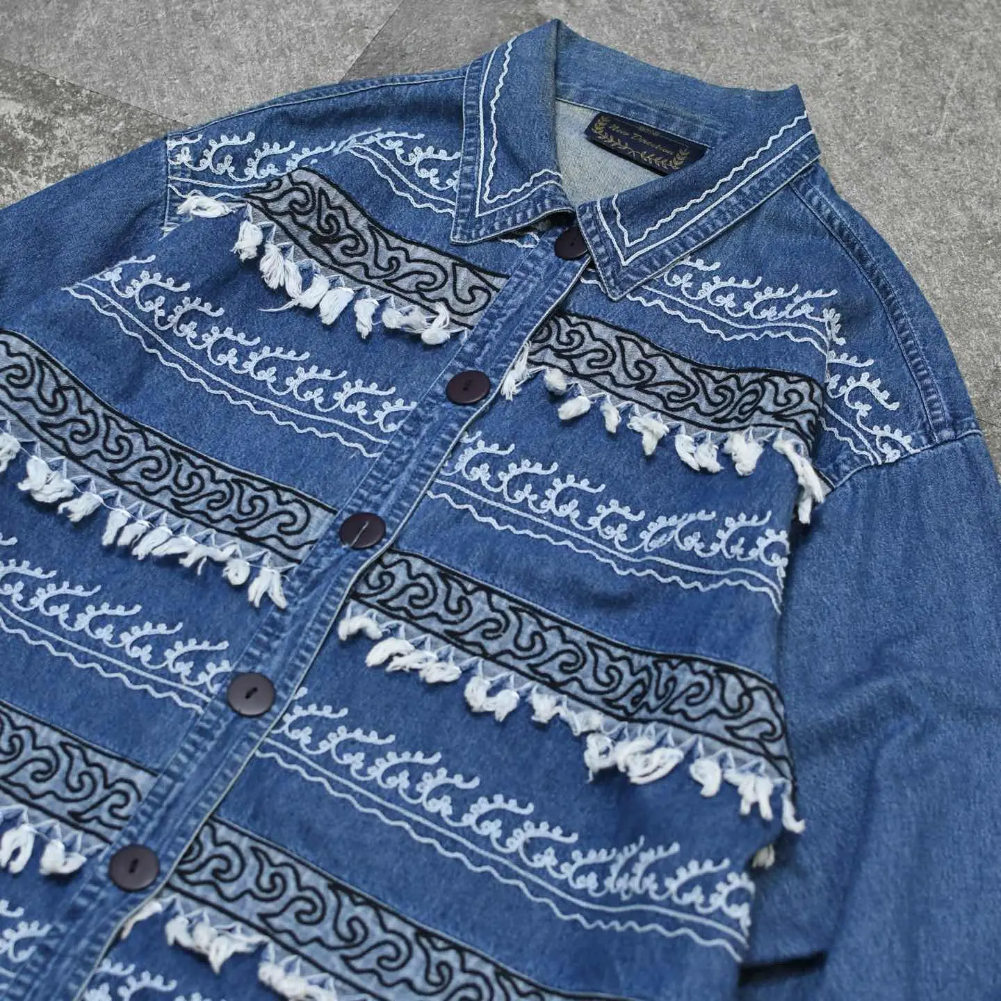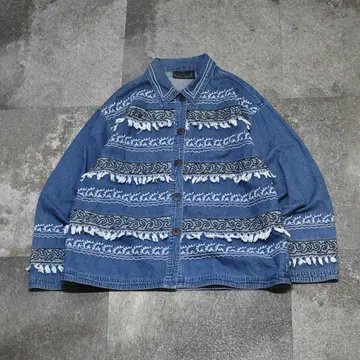 SIZE:XL 着丈66cm 肩幅55cm 身幅62cm 袖丈58cm fabric/cotton 着用画像 177cm/64kg デニムジャケットの多くはやはり、 カジュアルなものが多いですし、キレイめな スタイリングにも落とし込みやすい デニムジャケットって無いなと感じました。 そんな中でこちら。 刺繍とフリンジ、贅沢なデザインをデニムに 施した逸品です。 スラックスなどとの相性はもちろん、 カジュアルなパンツと合わせて、 ほんの少しだけ個性を足してあげるような スタイリングにも。 コートなど、ヘビーアウターの中から 顔を覗かせても可愛くなりそうです。 ※襟元に汚れあり。 ※撮影状況により、実物と多少色が異なる場合が ございます。 ※古着を取り扱っているため、気づかない汚れや ほつれ等がある場合がございます。 ※サイズは着用感で選んでおり、 表記サイズは説明欄の最初に記載しております。 オーバーサイズ old vintage ヴィンテージ used 80's 90's アメリカ古着 ユーロ古着 POLO RALPH LAUREN Eddie Bauer OLD GAP LANDS' END ランズエンド LLBean エルエルビーン オールドギャップ エディーバウアー ラルフローレン ブルックスブラザーズ Brooks Brothers 青 ブルー などがお好きな方 #vintage #オーバーサイズ #old #used #90s #80s #古着 #ヴィンテージ #アメリカ古着 #ユーロ古着 #LLBean #エルエルビーン #EddieBauer #エディーバウアー #oldgap #オールドギャップ #LANDSEND #ランズエンド #NAUTICA #ノーティカ #ラルフローレン #POLORALPHLAUREN #ブルックスブラザーズ #BrooksBrothers #デニムジャケット #ジャケット