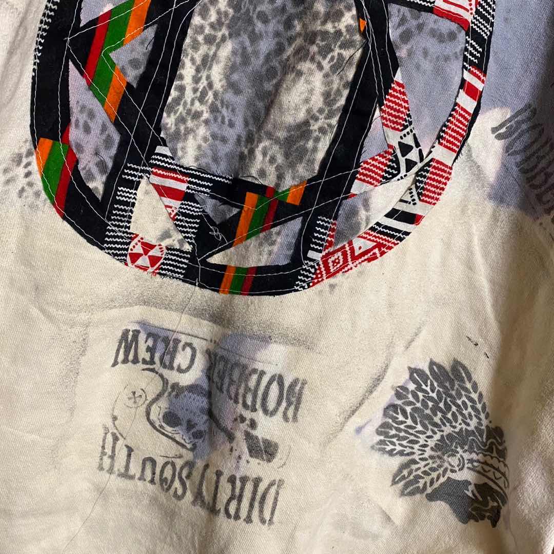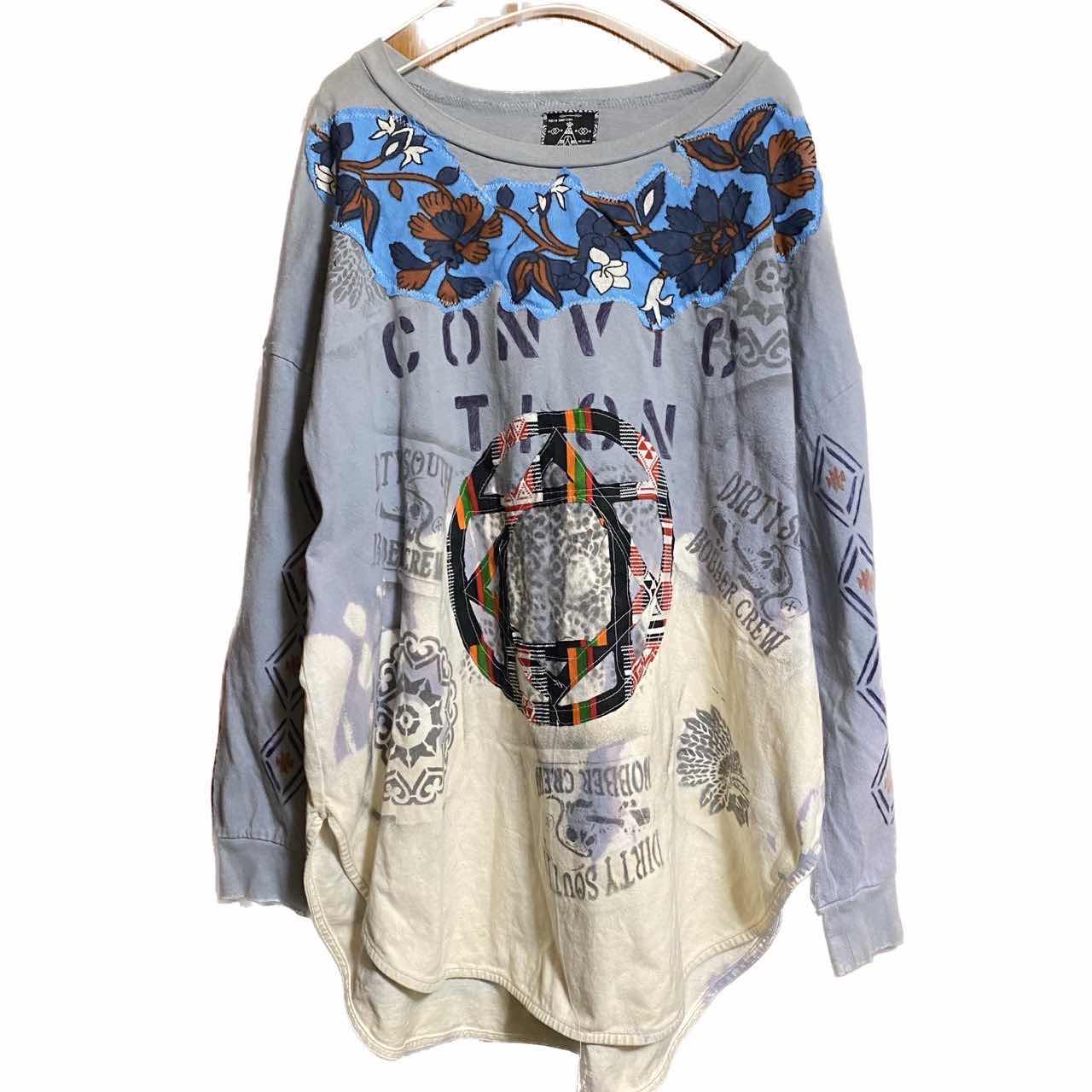 00s KHAOS emotional リメイクH.コットンL/S T F 2000年のボディーはそれだけで質が高く 長持ちします。それを カオスエモーショナル リメイク しました 色抜き 段染め、シルクスクリーンアート その後に アールヌーボー縫い付け フロントにアフリカマテリアルで 魔法陣を作り、縫い付けました 世界で1つのTシャツ!! どうせリメイクするんだったら、個性がないと面白くないし と思ってやってみました。4 Heavyコットンで年中活躍します。 【カラー】 写真通り段染め、 ▷size◁ 平置き片面採寸【㎝表記】 表記size F 着丈80 身幅67 肩幅70手かげん無しのDS 袖丈63ハンガー掛け肩落ち採寸リブ袖口 なんで、季節関係ないです!! ※多少の誤差はご容赦下さい モデルデータ 170センチ 普通体型、 Mだとジャストの私が、手加減無しゆるだぼ、 ▷material◁ ヘビーコットン13oz ▷condition◁ 不具合無し、つか、最強!! ※入念にチェックは、しておりますが、vintage/usedの特性ご理解下さい、理解しなくても、最強です笑