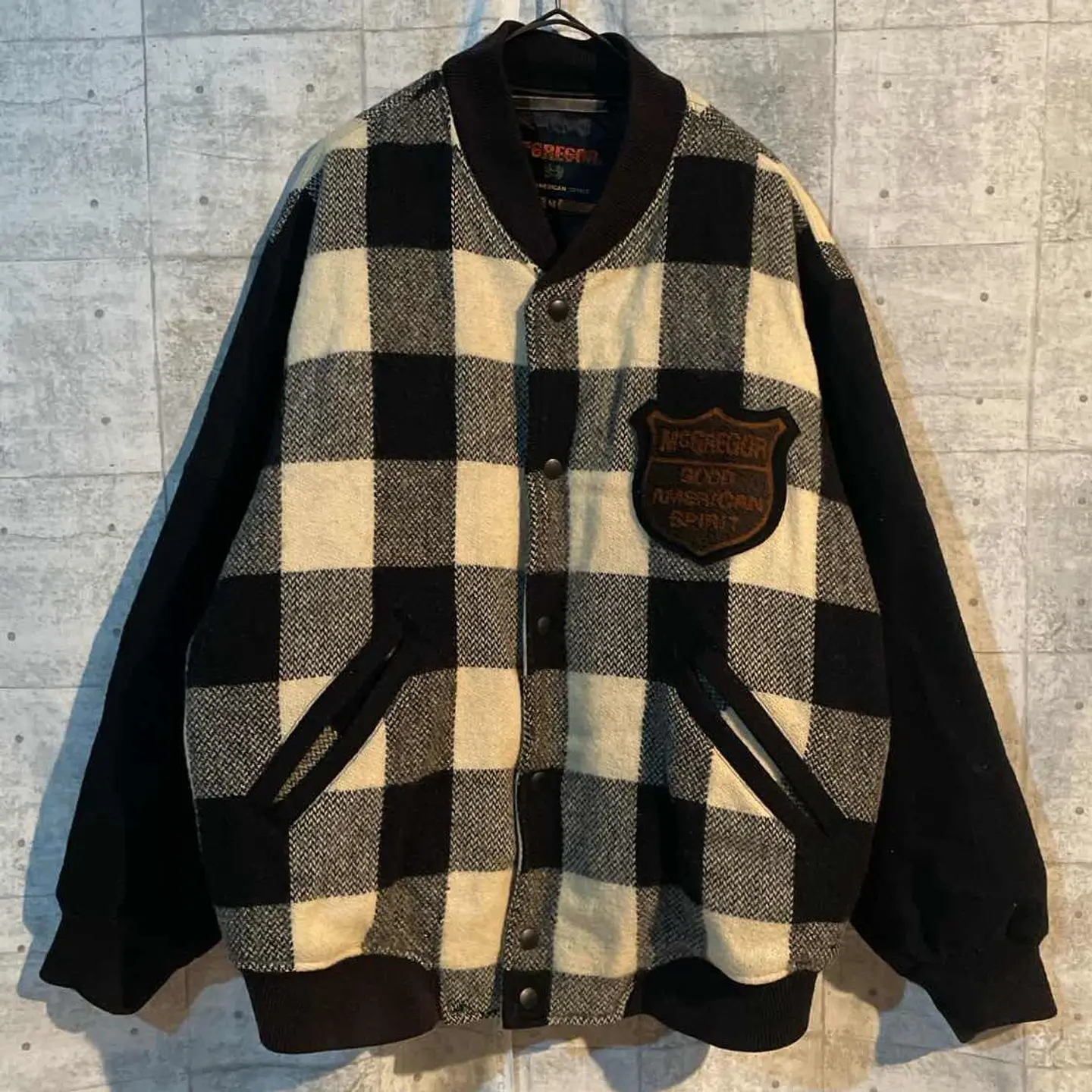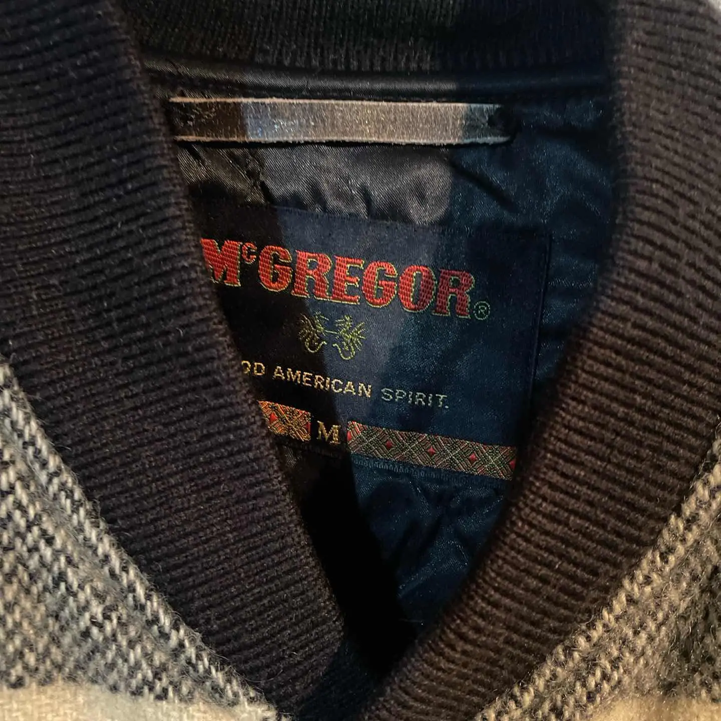 McGREGOR(マックレガー)のウールスタジャン。 ブラック×ホワイトの大判チェックが印象的な一着です。 しっかりとしたウール素材で保温性が高く、秋冬のメインアウターとして活躍します。 胸元にはブランドロゴ入りのワッペン、ポケットにはレザー調の切り替えが施され、 ヴィンテージ感と上品さを兼ね備えたデザイン。 クラシックな雰囲気ながらもシルエットは現代的で、 デニムやチノパンとの相性も抜群です。 実際に着用すると、程よくボリュームがありながら重すぎず、 インナーをスウェットやフーディにするだけで簡単に「雰囲気のあるアメカジスタイル」が完成します。 特に、「大人っぽい古着スタジャンを探している」「チェック柄で差をつけたい」という方にはぴったり。 McGREGORらしい上質な仕立てで、長く愛用できる一着です。