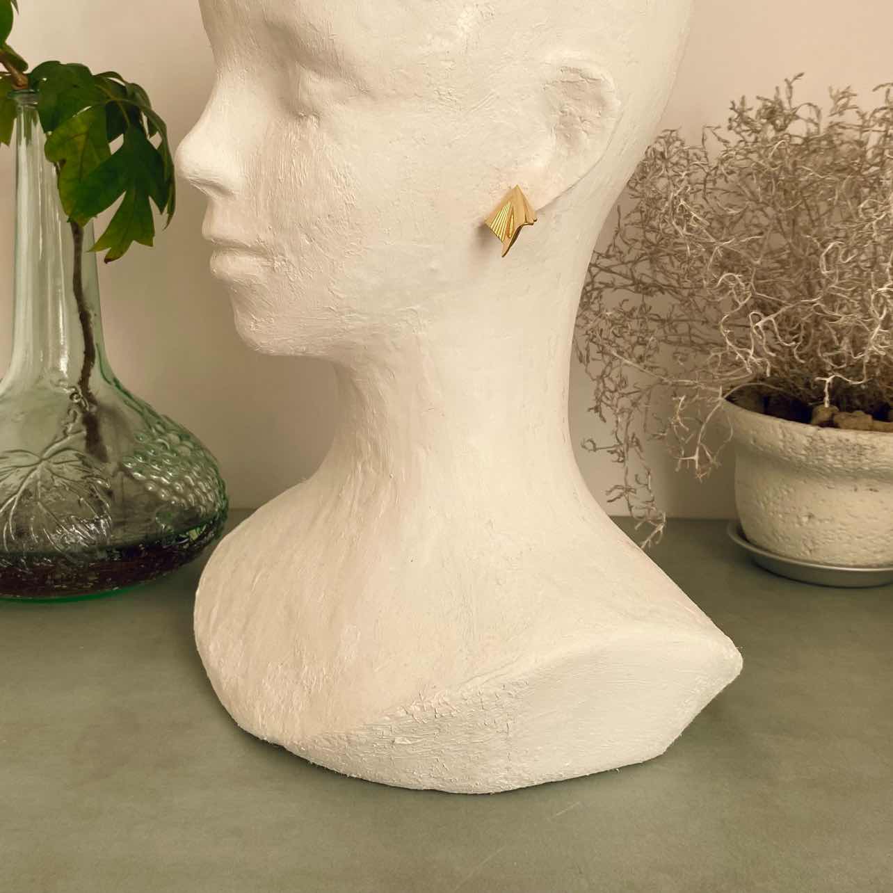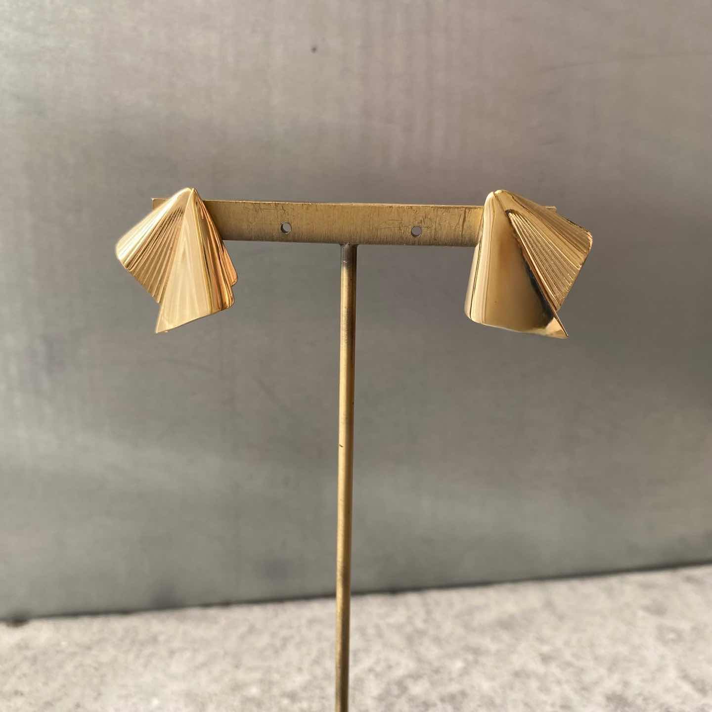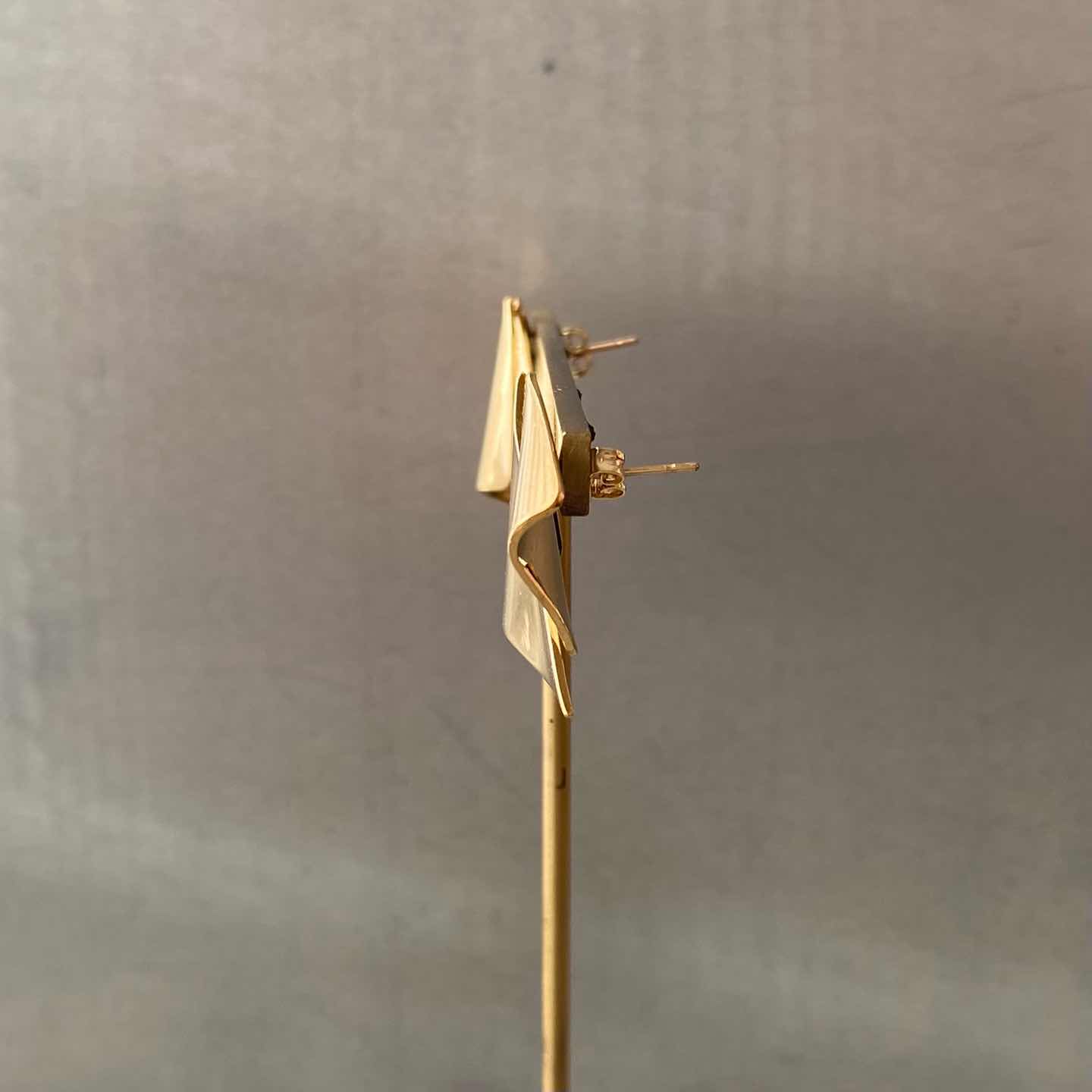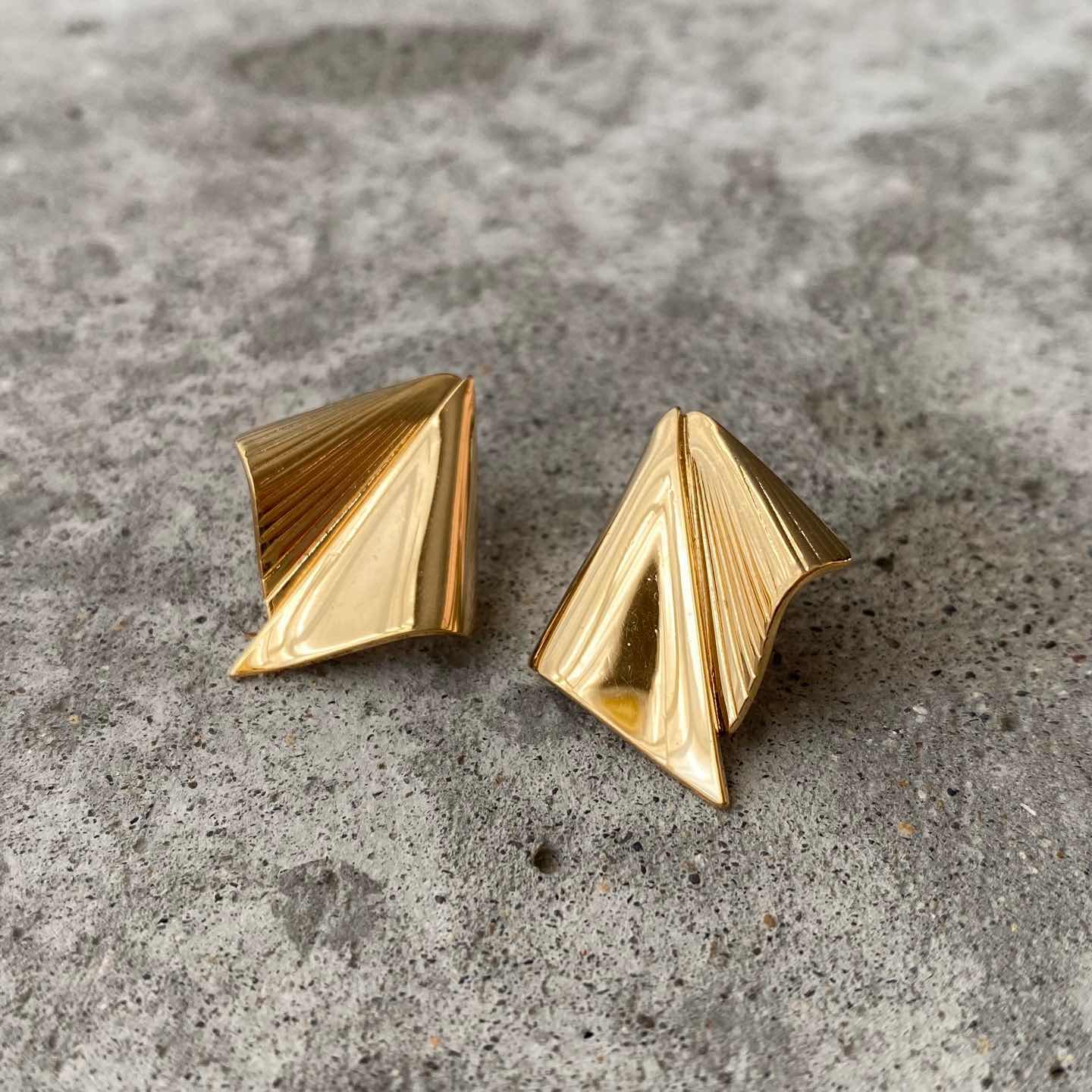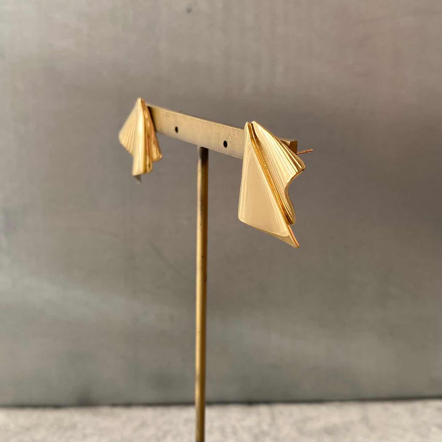 メタルが重なり合うレトロモードな雰囲気のUSAヴィンテージピアス。シンプルながら個性的なデザインで様々なスタイルに合わせていただけます。 □Materials メタル(ゴールドメッキ) □Size 約H2.5×W2㎝ 6g □Condition【B】 目立たない程度ですが表面に細かなスレがみられます。中古品であることをご理解のうえお買い求めください。ご購入前に必ずショッピングガイドのご確認をお願いいたします。 【S】未使用 【A】未使用に近い 【B】やや使用感あり 【C】使用感あり Item No.3416