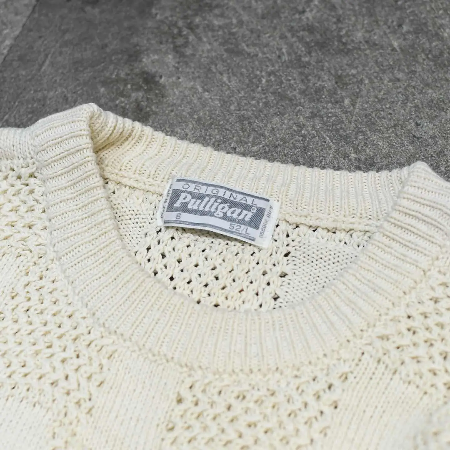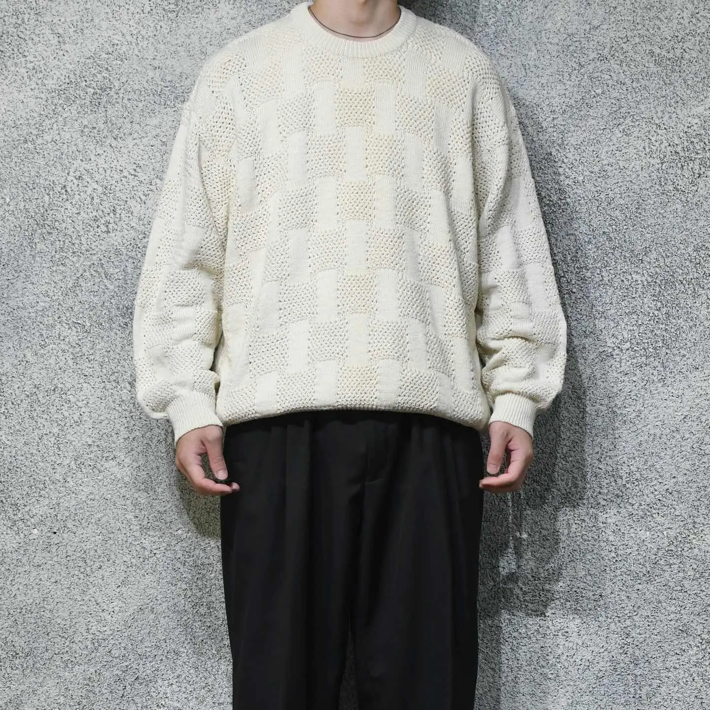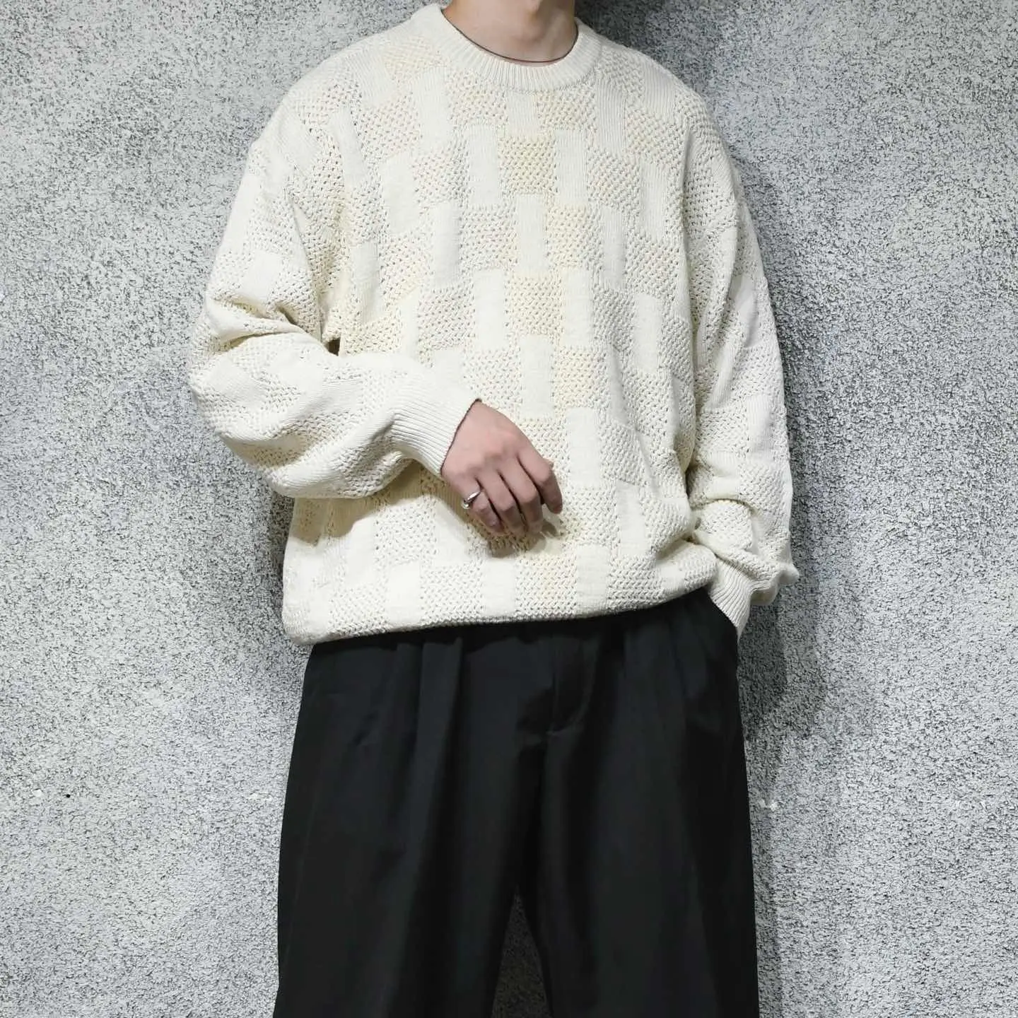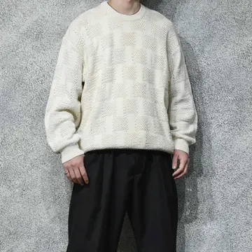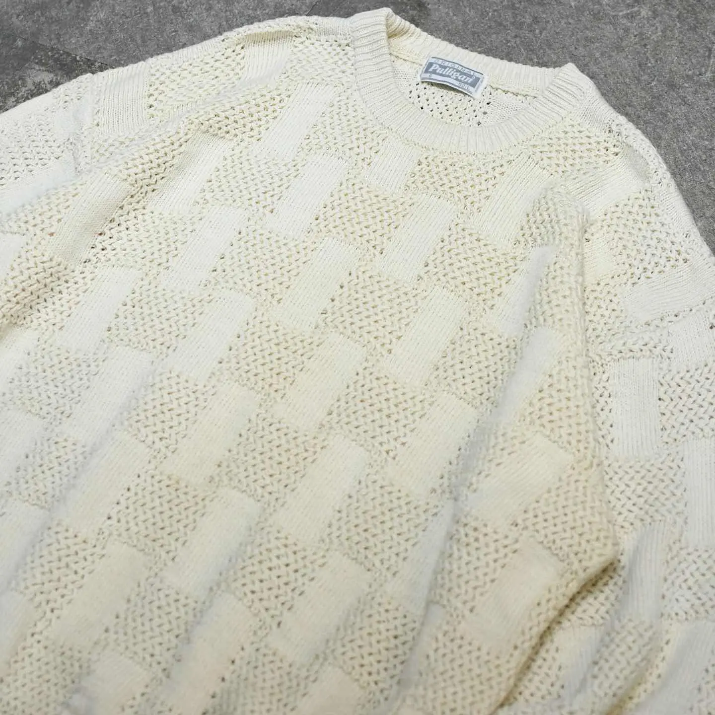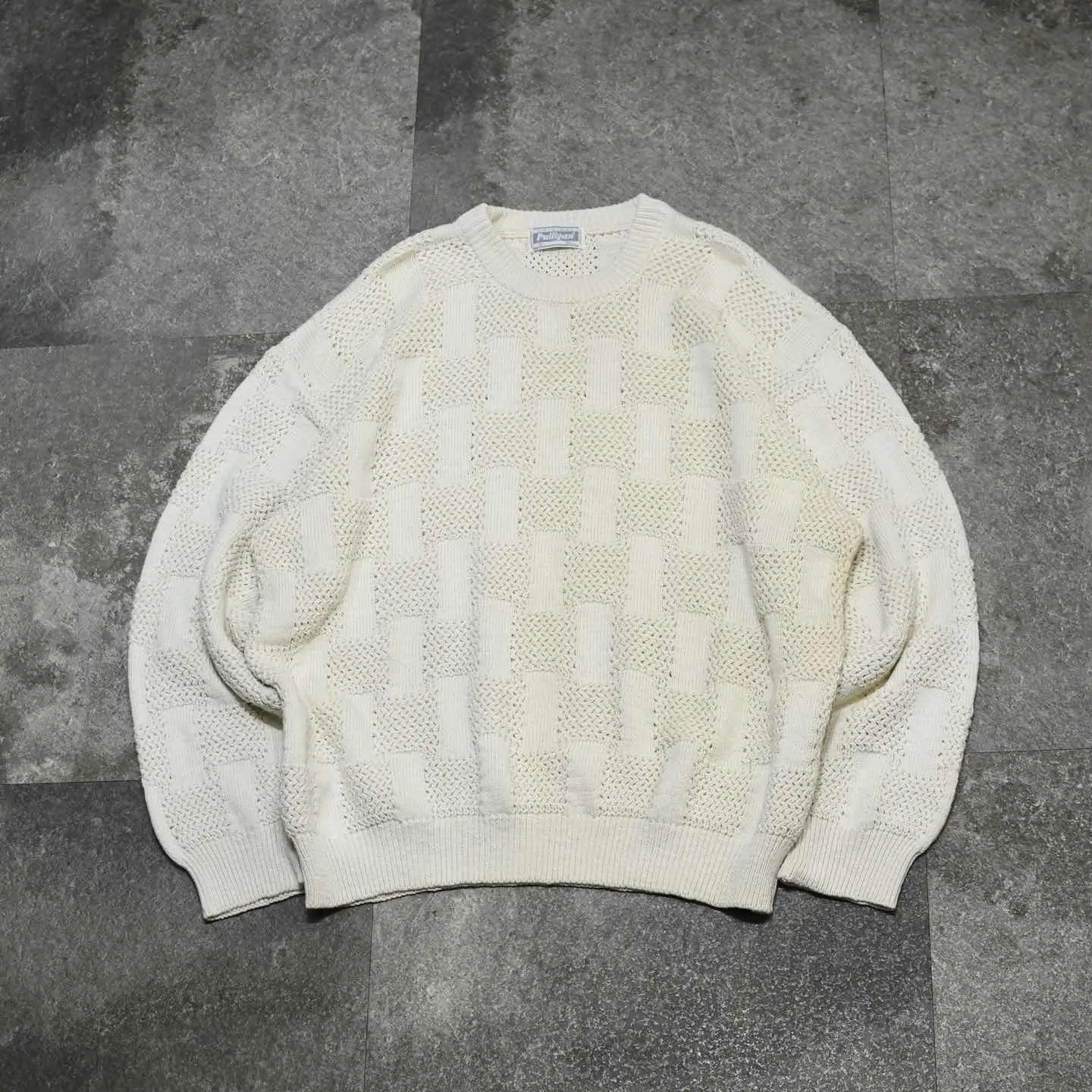 SIZE:L/52 着丈69cm 肩幅63cm 身幅66cm 袖丈62cm fabric/cotton・acrylic made in Spain 着用画像 177cm/64kg 2種類の編み方を用いることで生まれる格子状。 ローゲージとミドルゲージ。 多色を用いたニットと比べ、第一印象は劣っても、 使い勝手の良さと程良い一癖のあるデザインから、 活躍する場面は多くなりそうです。 シンプルだけど、差別化出来る白ニット。 探すと無いやつです... ※撮影状況により、実物と多少色が異なる場合が ございます。 ※古着を取り扱っているため、気づかない汚れや ほつれ等がある場合がございます。 予めご了承ください。 ※サイズは着用感で選んでおり、 表記サイズではございません。 表記サイズは説明欄の最初に記載しております。 古着 オーバーサイズ old vintage ヴィンテージ used 80's 90's アメリカ古着 ユーロ古着 POLO RALPH LAUREN Eddie Bauer OLD GAP LANDS' END ランズエンド LLBean エルエルビーン オールドギャップ エディーバウアー ラルフローレン ブルックスブラザーズ Brooks Brothers 白 コットンニット アクリルニット ローゲージ などがお好きな方 #vintage #オーバーサイズ #old #used #90s #80s #古着 #ヴィンテージ #アメリカ古着 #ユーロ古着 #LLBean #エルエルビーン #EddieBauer #エディーバウアー #oldgap #オールドギャップ #LANDSEND #ランズエンド #NAUTICA #ノーティカ #ラルフローレン #POLORALPHLAUREN #ブルックスブラザーズ #BrooksBrothers #ニット #セーター #デザインニット #アクリルニット #コットンニット