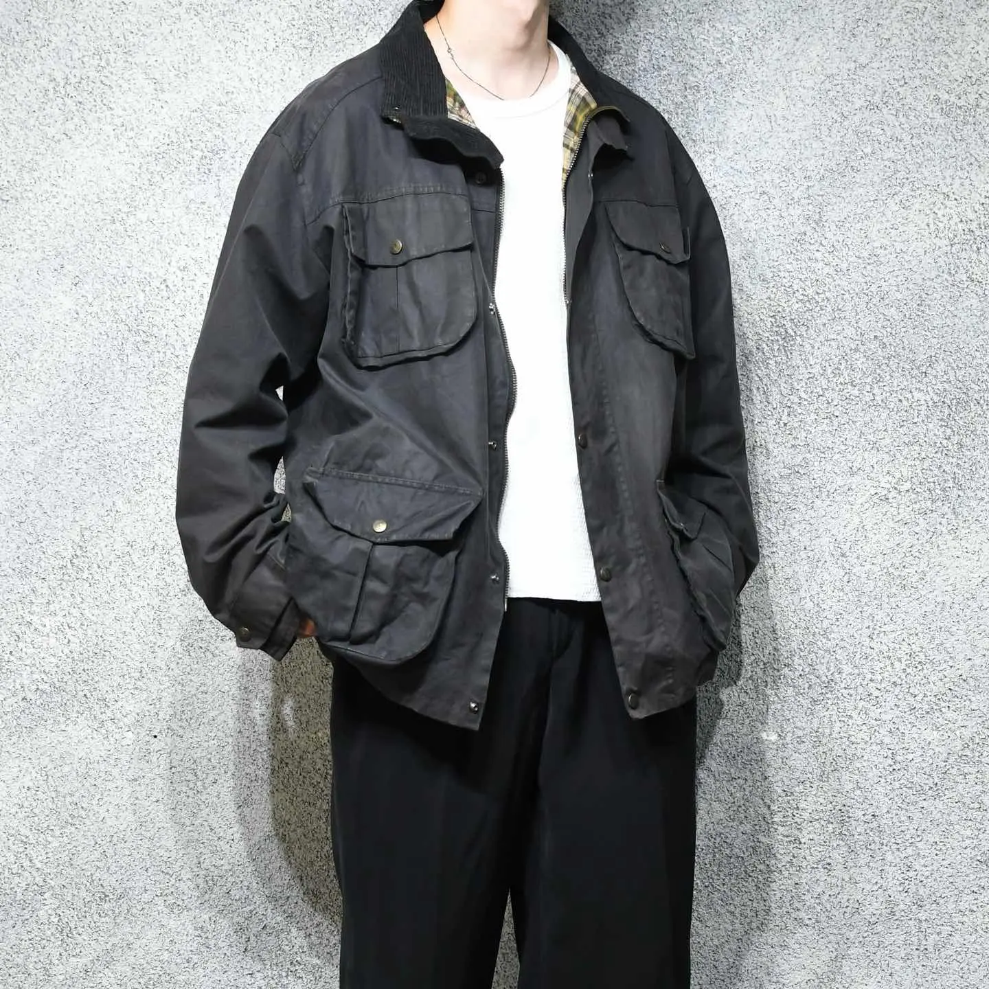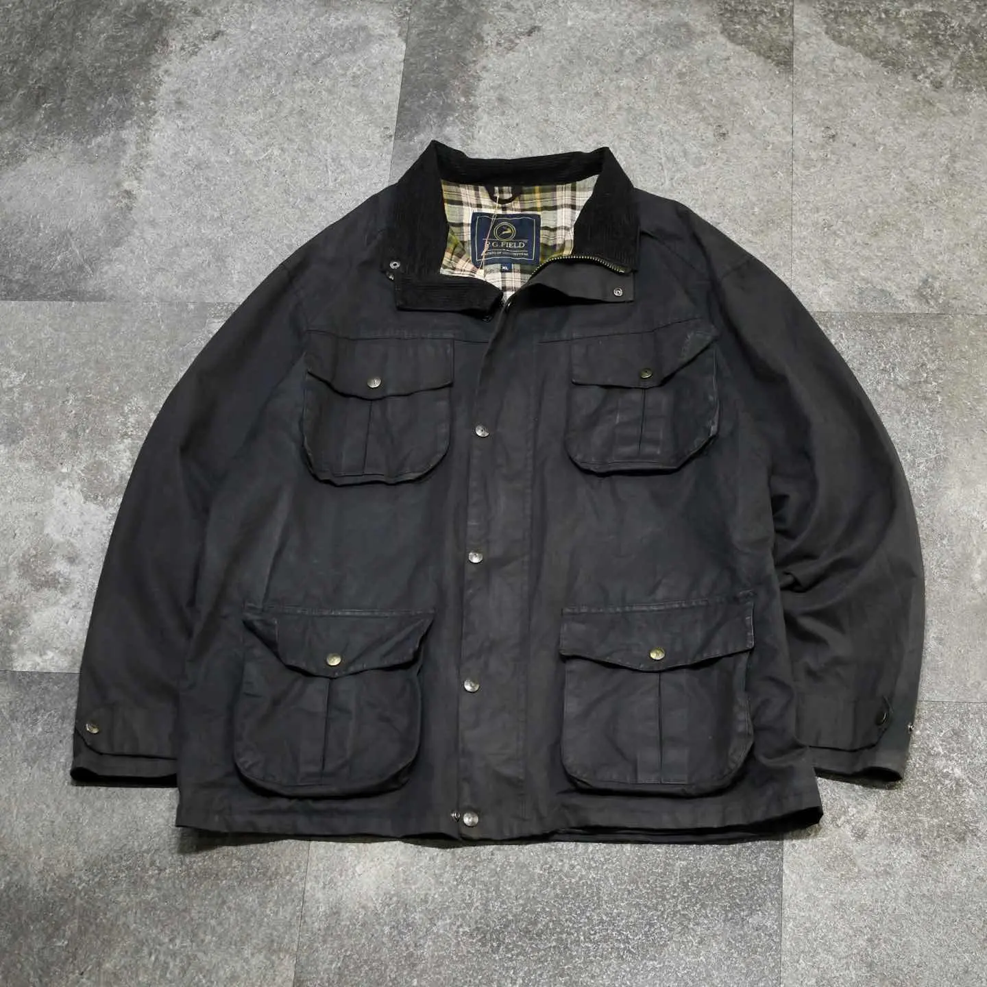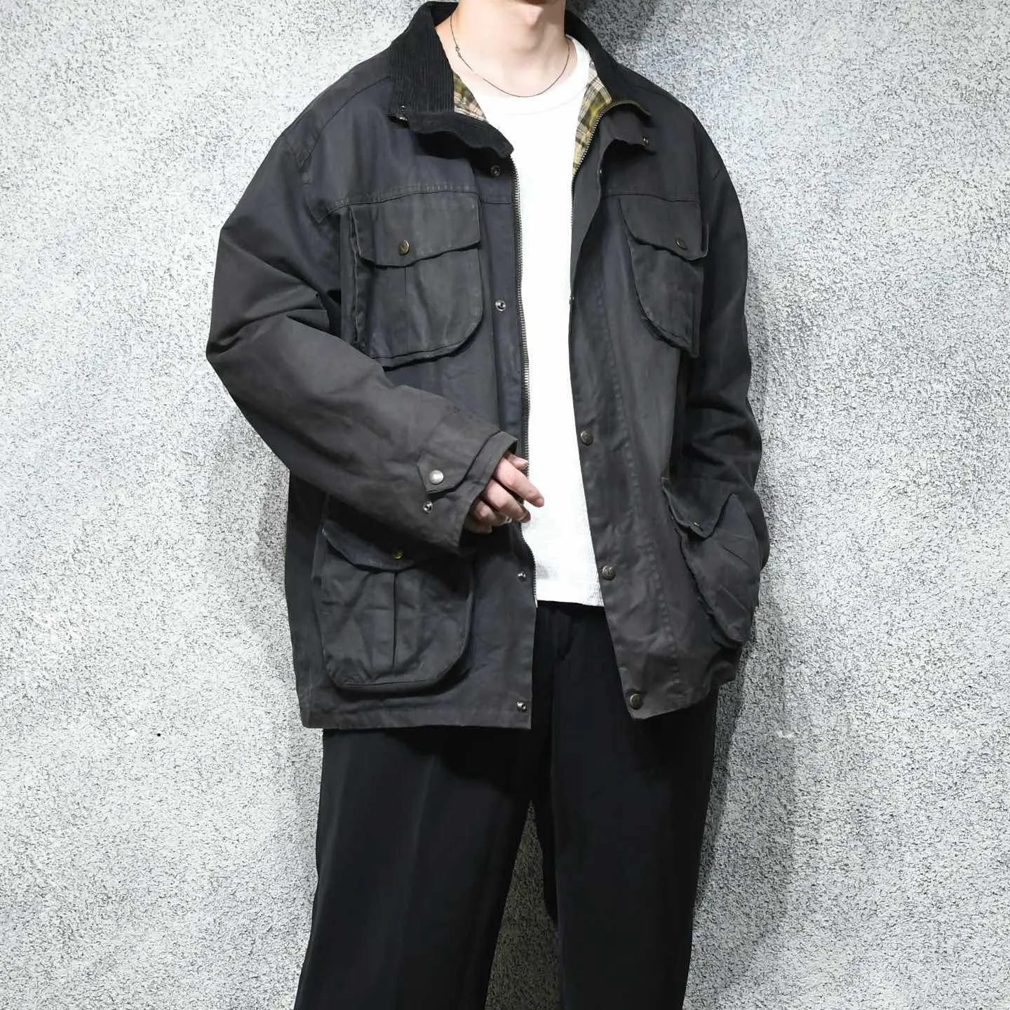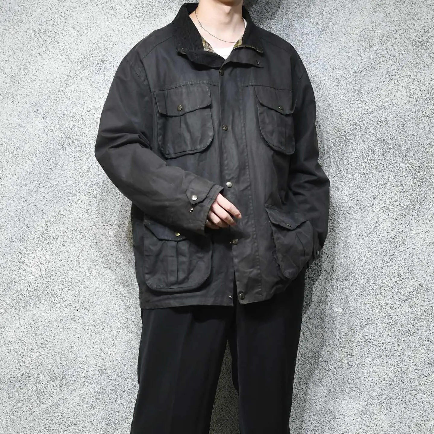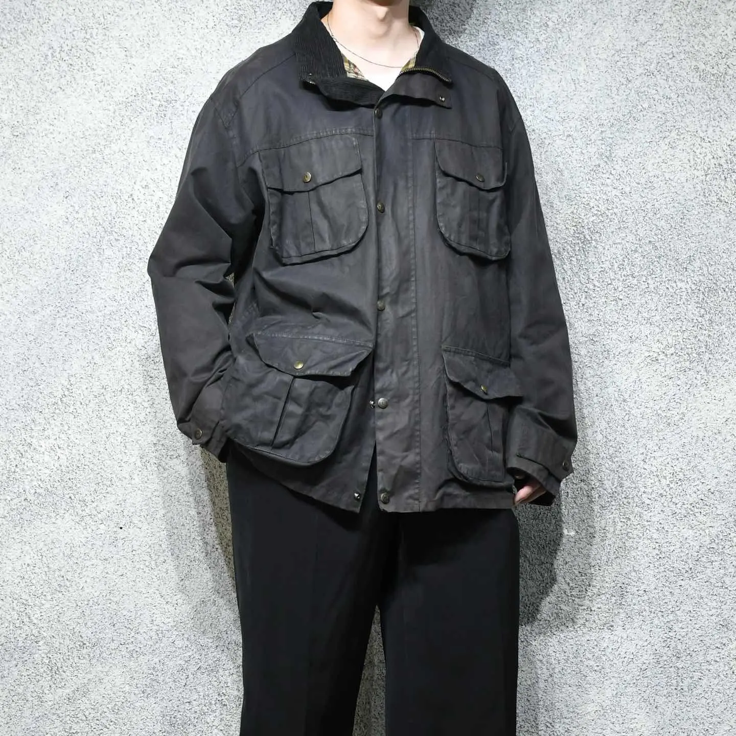 SIZE:XL 着丈81cm 肩幅58cm 身幅70cm 袖丈64cm fabric/cotton made in British 着用画像 177cm/64kg イギリスのトラディショナルウェアを手掛けていた ブランド”P.G.FIELD” ここ数年、個人的に探していたBarbourや Belstaffではなく、マイナーブランドで 差別化出来るオイルドジャケット。 そんな自分にも刺さった1着。 インナーにニットやスウェットなど、 ボリュームのあるトップスを着ても 詰まることなく、尚且つ塩梅の良いオイル残り。 チノと合わせて野暮ったく、スラックスと 合わせてバランスを取ったり、 そんなスタイリングでどうぞ。 スナップボタンの鹿が推し。 ※撮影状況により、実物と多少色が異なる場合が ございます。 ※古着を取り扱っているため、気づかない汚れや ほつれ等がある場合がございます。 予めご了承ください。 ※サイズは着用感で選んでおり、 表記サイズではございません。 表記サイズは説明欄の最初に記載しております。 古着 オーバーサイズ old vintage ヴィンテージ used 80's 90's アメリカ古着 ユーロ古着 POLO RALPH LAUREN Eddie Bauer OLD GAP LANDS' END ランズエンド LLBean エルエルビーン オールドギャップ エディーバウアー ラルフローレン ブルックスブラザーズ Brooks Brothers 茶色 ブラウン ハンティングジャケット などがお好きな方 #vintage #オーバーサイズ #old #used #90s #80s #古着 #ヴィンテージ #アメリカ古着 #ユーロ古着 #LLBean #エルエルビーン #EddieBauer #エディーバウアー #oldgap #オールドギャップ #LANDSEND #ランズエンド #NAUTICA #ノーティカ #ラルフローレン #POLORALPHLAUREN #ブルックスブラザーズ #BrooksBrothers #ハンティングジャケット #オイルドジャケット #ジャケット