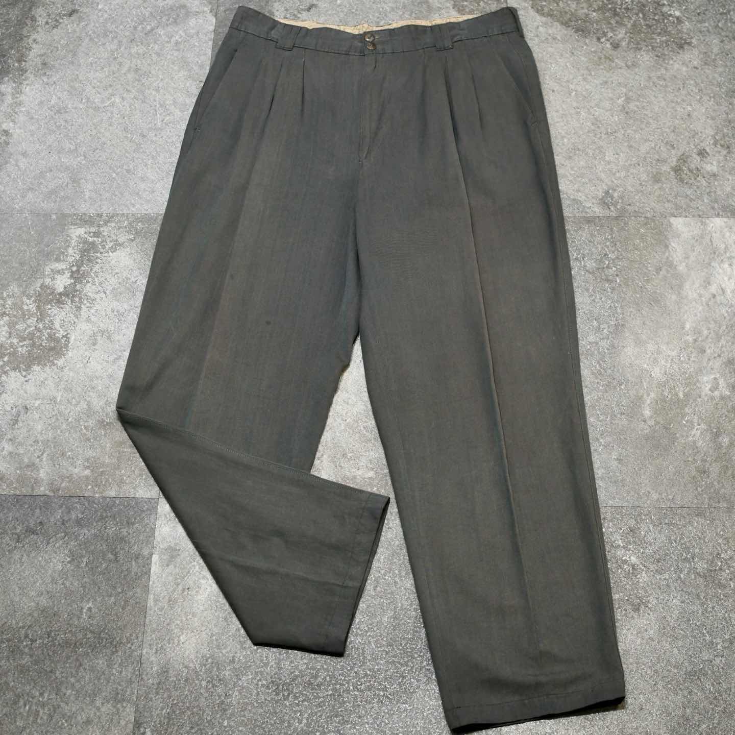 SIZE:- ウエスト91cm 総丈110cm 股下78cm わたり41cm 裾幅23.5cm fabric/rayon・cotton 着用画像 177cm/64kg 経糸には深緑、緯糸にはオレンジの糸を使い 編み込まれたレーヨンスラックス。 2色の糸から生まれる雰囲気は、他と比べ 一線を画す上品さ。 そしてタックはボックスタックが各2つずつ、 4タックと同等のワイドなシルエットを 兼ね備え、存在感がありつつ上品さも感じる 逸品です。 ここまで秀でた個体は中々出会えないですし、 通年穿ける生地感でレーヨンの動きのある シルエットという点も◎ 欲しいやつです... ※右太もも軽度の汚れあり。 ※裾上げ等のレングス直しにつきましては、 裾上げ方法によっては、別途料金が 発生する場合がございます。 購入前に、必ずご連絡お願い致します。 また、購入後の直しには対応出来かねます。 ※撮影状況により、実物と多少色が異なる 場合がございます。 ※古着を取り扱っているため、気づかない汚れや ほつれがある場合がございます。 予めご了承ください。 ※サイズは着用感で選んでおり、 表記サイズではございません。 表記サイズは説明欄の最初に記載しております。 古着 オーバーサイズ old vintage ヴィンテージ used 80's 90's アメリカ古着 ユーロ古着 POLO RALPH LAUREN Eddie Bauer OLD GAP LANDS' END ランズエンド LLBean エルエルビーン オールドギャップ エディーバウアー ラルフローレン ブルックスブラザーズ Brooks Brothers などがお好きな方 #vintage #オーバーサイズ #old #used #90s #80s #古着 #ヴィンテージ #アメリカ古着 #ユーロ古着 #LLBean #エルエルビーン #EddieBauer #エディーバウアー #oldgap #オールドギャップ #LANDSEND #ランズエンド #NAUTICA #ノーティカ #ラルフローレン #POLORALPHLAUREN #ブルックスブラザーズ #BrooksBrothers #スラックス #ワイドパンツ #タックパンツ #玉虫色