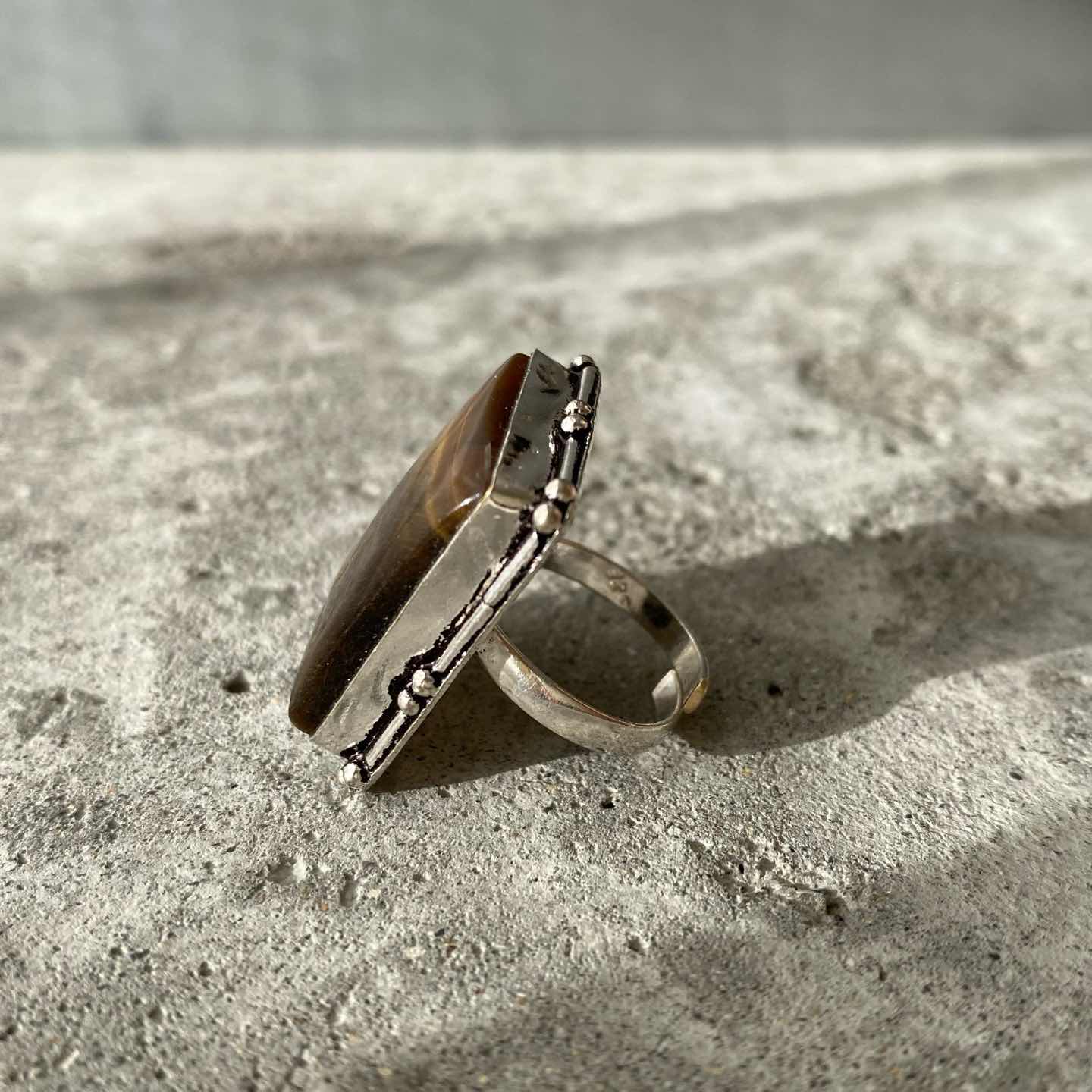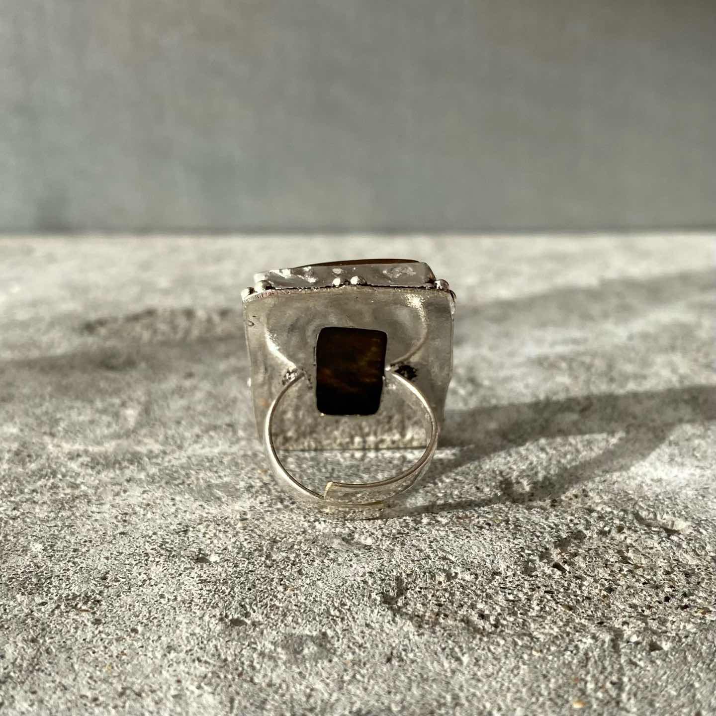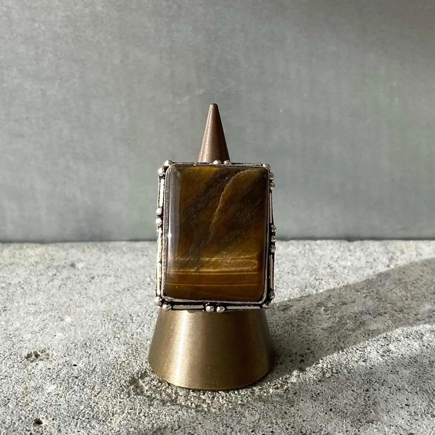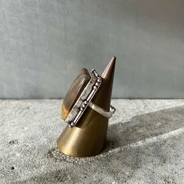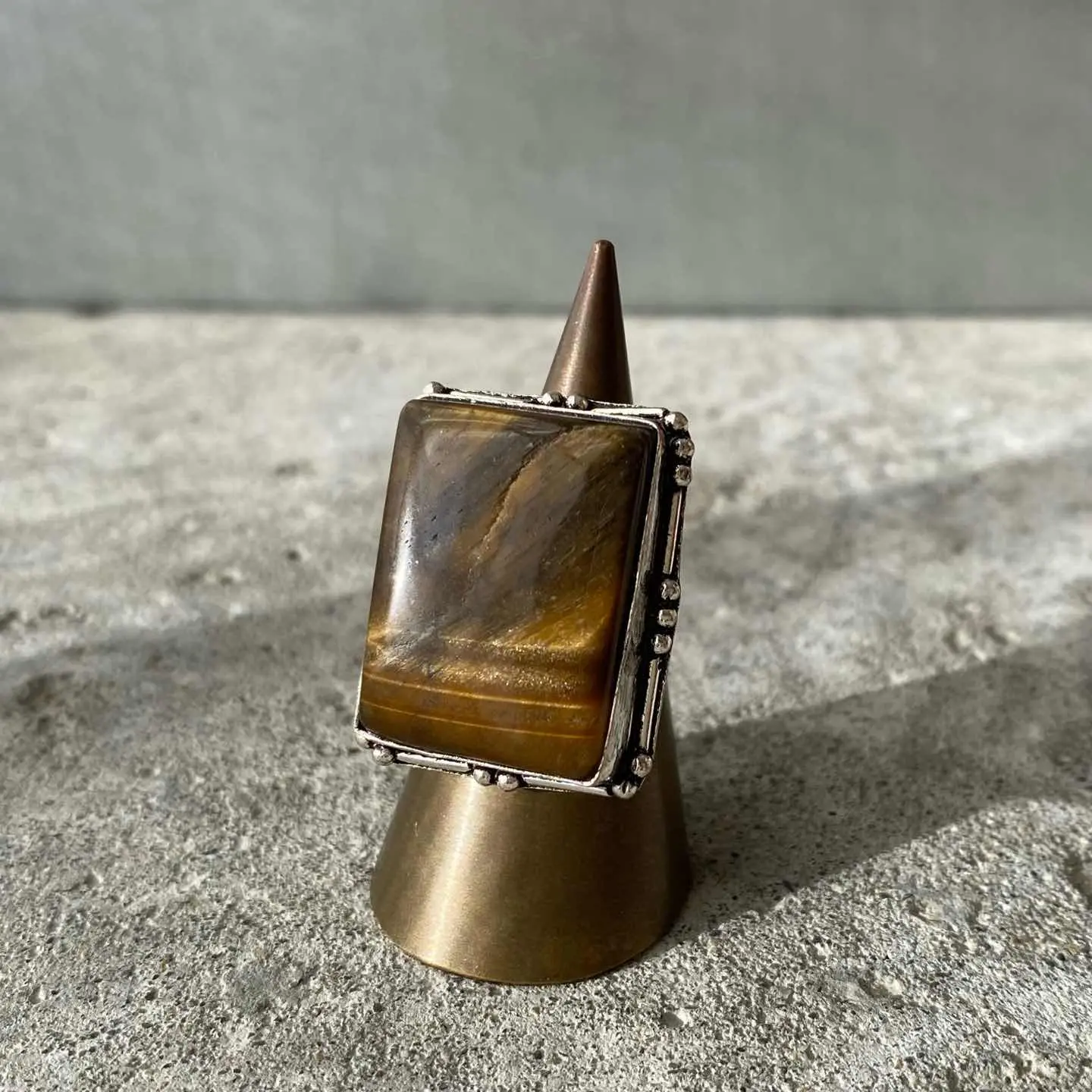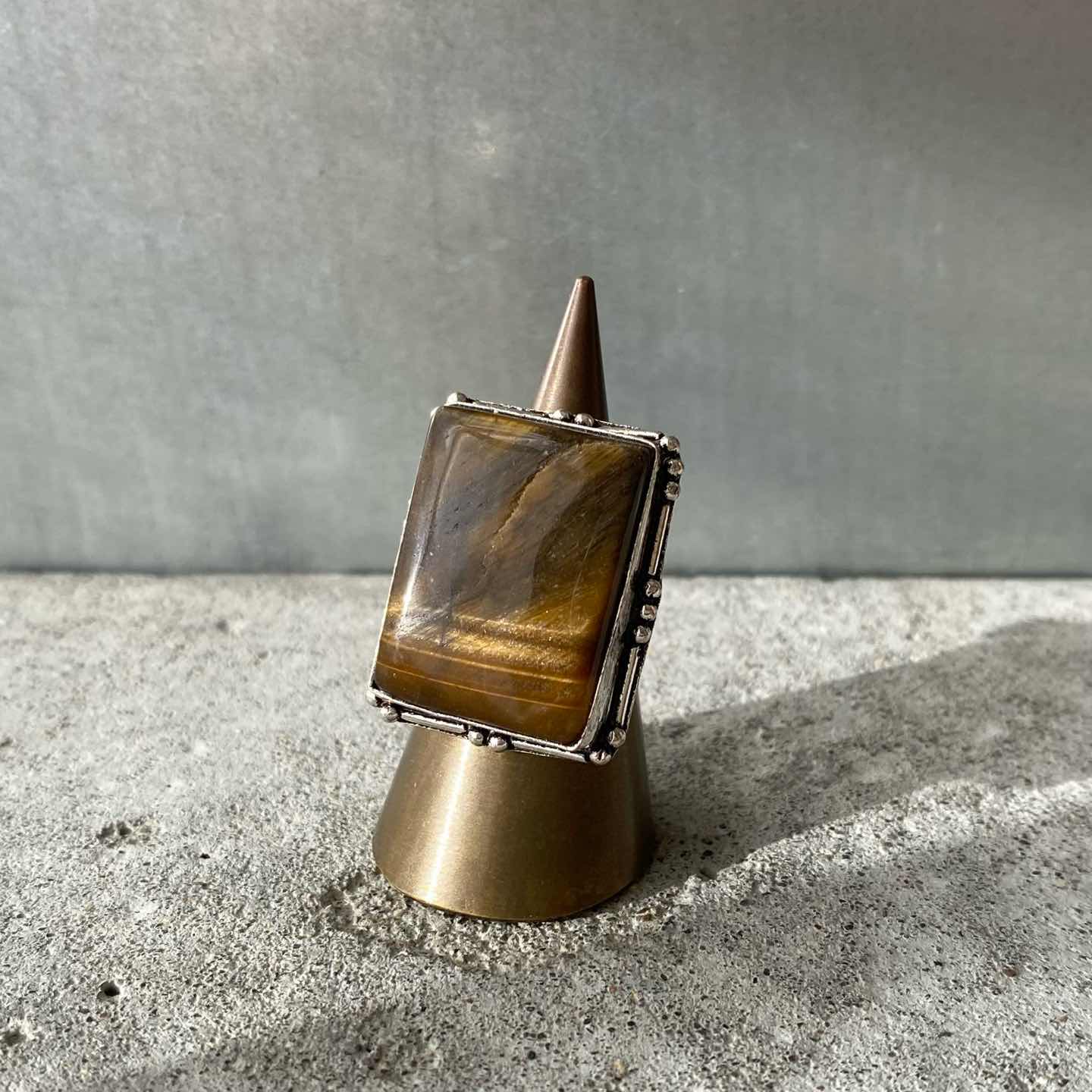 独特の縞模様と大きなスクエアフォルムが魅力的な天然石リング。「タイガーアイ」は、決断力を高め仕事や金運を高めてくれる成功の石といわれています。存在感がありコーディネートのアクセントに。古着やユニセックスなスタイルにもおすすめです。 □Materials 天然石(タイガーアイ)、真鍮(シルバー925メッキ) □Size 9.5号(フリーサイズ) リング幅 約3㎜ 石座部分 約H2.7×W2.2㎝ 9g □Condition こちらの商品は新品です。海外ハンドメイド製品の為ラフな作りがお好きな方にオススメです。元々の作りですが、メタル部分に細かなスレ傷やリングの曲面部分にフラットになっている箇所がございます。(※石材には表面に凹凸やスレ傷、内包物やクラックなど天然石ならではの特徴がみられます)ご購入前に必ずショッピングガイドのご確認をお願いいたします。 Item No.3430
